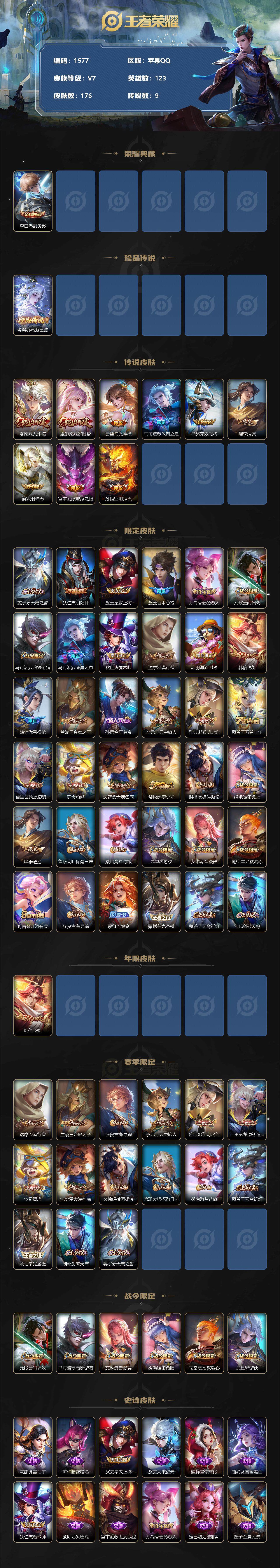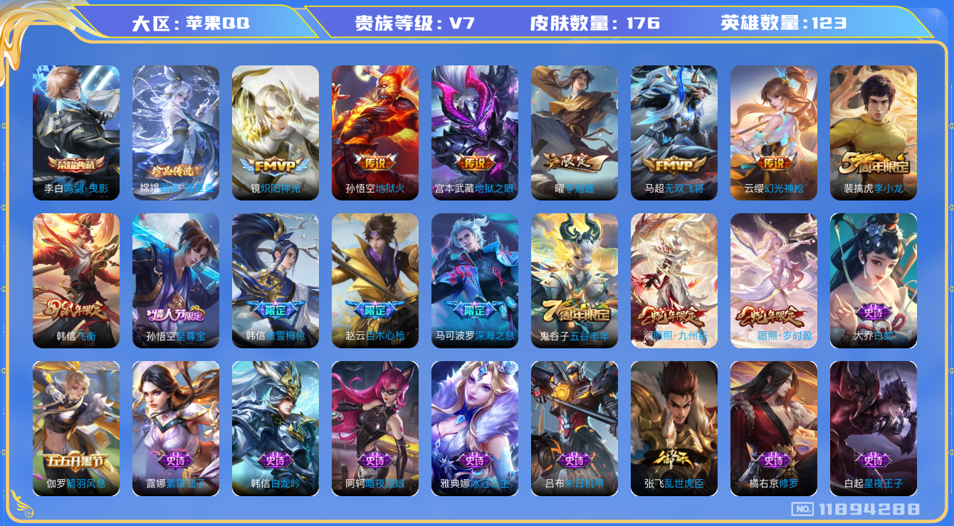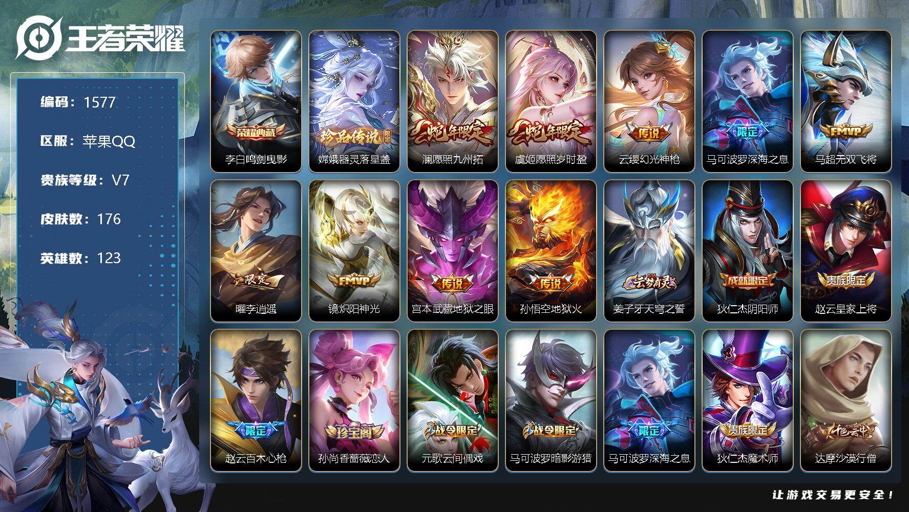 [11894288]【商品标题】:苹果Q-V7-最强王者段位-123英雄-176皮肤-1典藏-0珍品无双-0无双-1珍品传说-9传说-57史诗