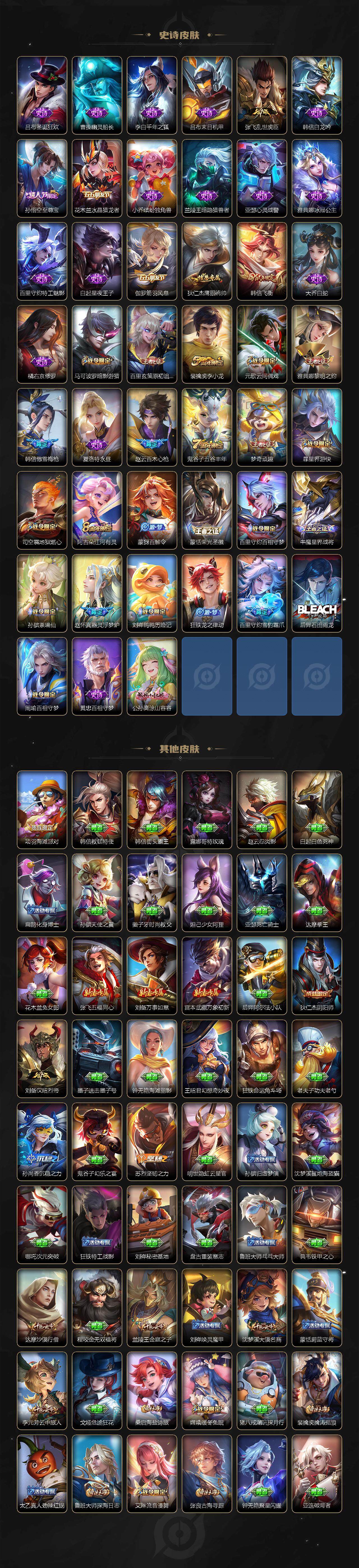 【史诗皮肤】:露娜紫霞仙子,阿轲暗夜猫娘,赵云皇家上将,赵云未来纪元,貂蝉圣诞恋歌,甄姬冰雪圆舞曲,狄仁杰魔术师,廉颇地狱岩魂,宫本武藏鬼剑武藏,孙尚香蔷薇恋人,妲己魅力维加斯,墨子金属风暴,吕布圣诞狂欢,曹操幽灵船长,李白千年之狐,吕布末日机甲,张飞乱世虎臣,韩信白龙吟,孙悟空至尊宝,花木兰水晶猎龙者,小乔缤纷独角兽,兰陵王暗隐猎兽者,亚瑟心灵战警,雅典娜冰冠公主,百里守约特工魅影,白起星夜王子,伽罗箭羽风息,狄仁杰鹰眼统帅,韩信飞衡,大乔白蛇,橘右京修罗,马可波罗暗影游猎,百里玄策原初追逐者,裴擒虎李小龙,元歌云间偶戏,雅典娜黎明之约,韩信傲雪梅枪,夏洛特永昼,赵云百木心枪,鬼谷子五谷丰年,梦奇顽趣,暃星界游侠,司空震地狱燃心,阿古朵江河有灵,蒙犽百解令,蒙恬荣光圣徽,百里守约百相守梦,牛魔星界战将,孙膑茶境仙,赵怀真器灵浮梦炉,刘禅鸭鸭历险