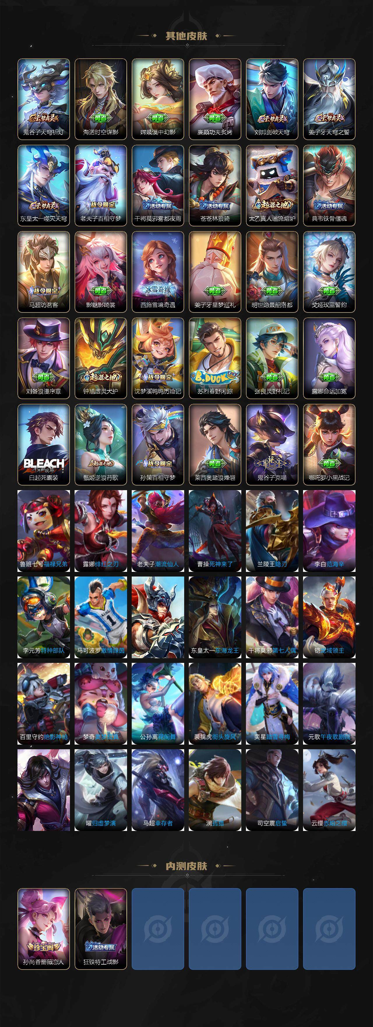 【赛季限定】:达摩沙漠行僧,兰陵王金庭之子,张良古海寻踪,李元芳云中旅人,雅典娜黎明之约,百里玄策原初追逐者,梦奇顽趣,沈梦溪大漠名商,裴擒虎擒涛扼浪,鲁班大师探海日志,桑启海盐诗旅,鬼谷子天穹祈灯,蒙恬荣光圣徽,刘邦剑破天穹,姜子牙天穹之誓