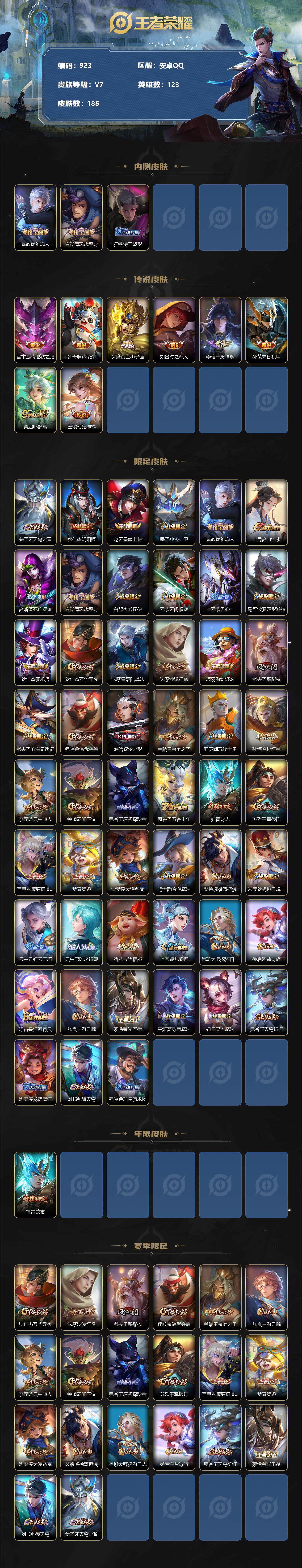 [11894516]【商品标题】:安卓Q-V4-至尊星耀II段位-123英雄-186皮肤-0典藏-0珍品无双-0无双-0珍品传说-8传说-57史诗