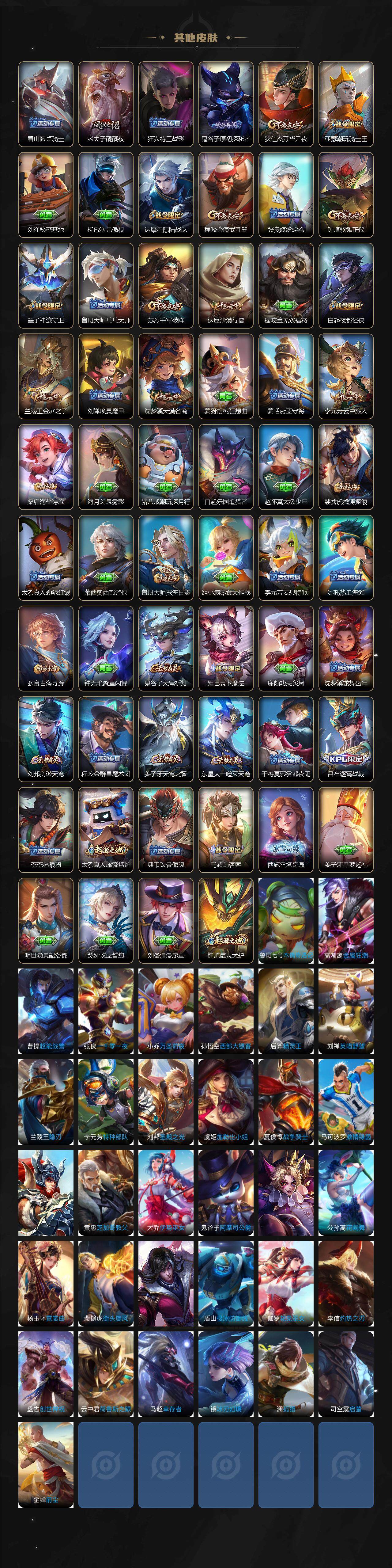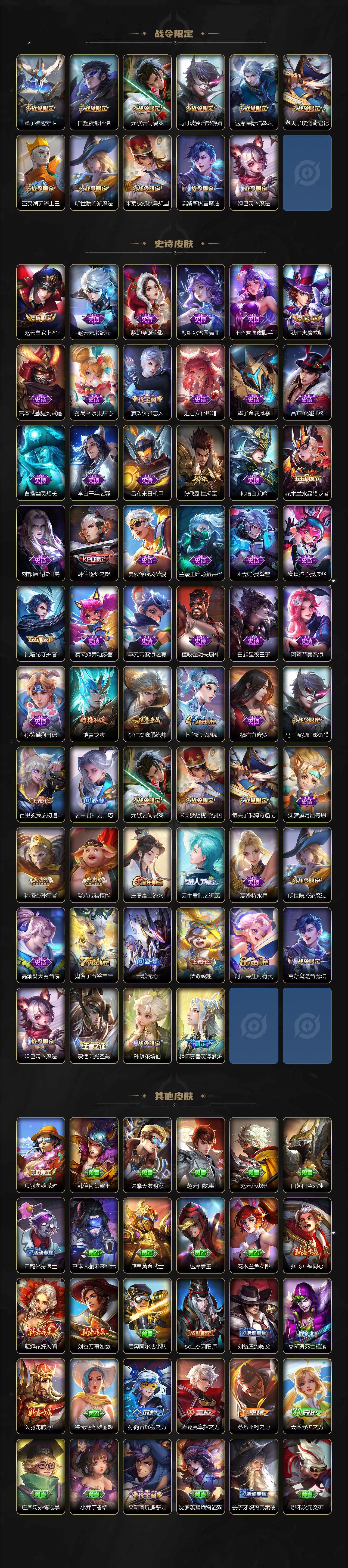 【限定皮肤】:姜子牙天穹之誓,狄仁杰阴阳师,赵云皇家上将,墨子神迹守卫,嬴政优雅恋人,庄周高山流水,高渐离死亡摇滚,高渐离玩趣恶龙,白起夜都怪侠,元歌云间偶戏,元歌无心,马可波罗暗影游猎,狄仁杰魔术师,狄仁杰万华元夜,达摩星际陆战队,达摩沙漠行僧,项羽海滩派对,老夫子醍醐杖,老夫子航海奇遇记,程咬金演武夺筹,韩信逐梦之影,兰陵王金庭之子,亚瑟潮玩骑士王,孙悟空孙行者,李元芳云中旅人,钟馗驱傩正仪,鬼谷子原初探秘者,鬼谷子五谷丰年,铠青龙志,苏烈千军破阵,百里玄策原初追逐者,梦奇顽趣,沈梦溪大漠名商,明世隐吟游魔法,裴擒虎擒涛扼浪,米莱狄胡桃异想国,云中君纤云弄巧,云中君时之祈愿,猪八戒猪悟能,上官婉儿梁祝,鲁班大师探海日志,桑启海盐诗旅,阿古朵江河有灵,张良古海寻踪,蒙恬荣光圣徽,高渐离燃音魔法,妲己灵卜魔法,鬼谷子天穹祈灯,沈梦溪龙舞盛年,刘邦剑破天穹,程咬金群星魔术团