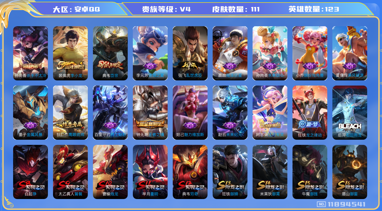 [11894541]【商品标题】:安卓Q-V4-最强王者段位-123英雄-111皮肤-1典藏-0珍品无双-0无双-0珍品传说-0传说-19史诗