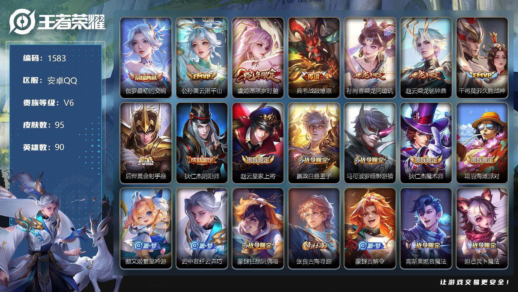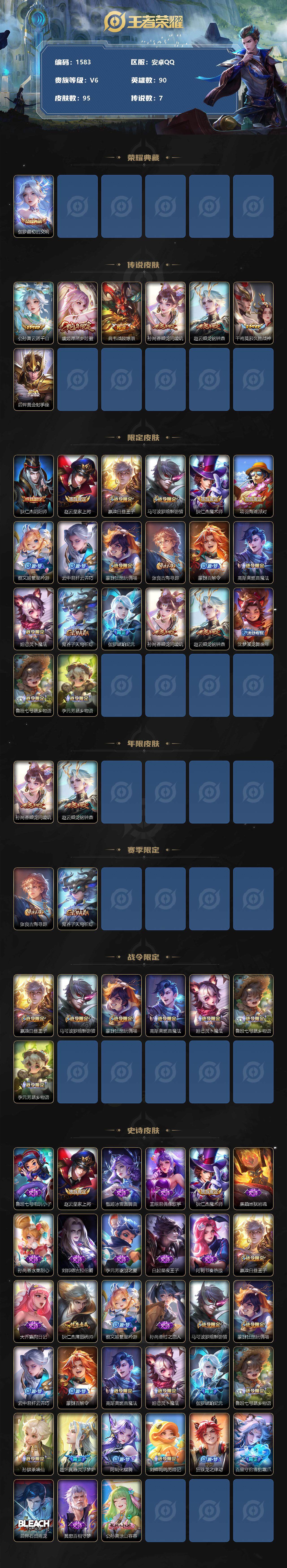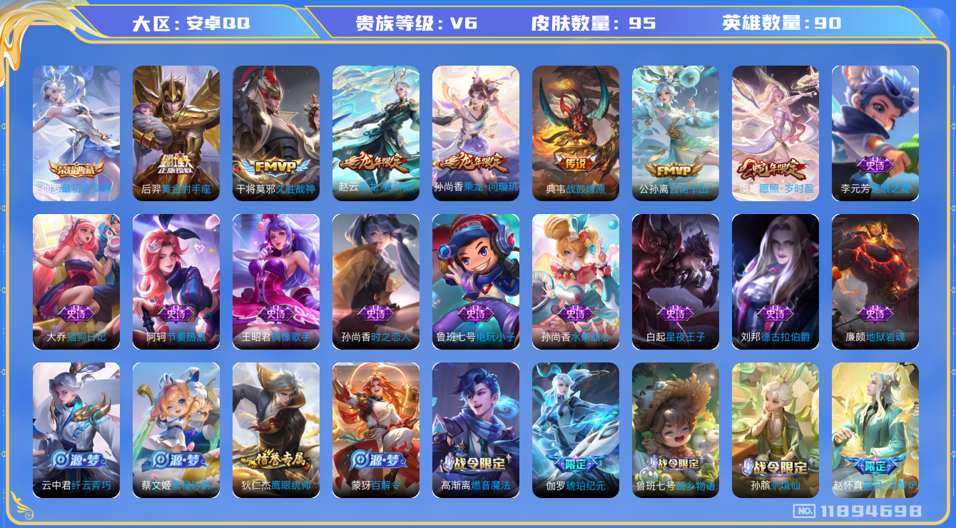 [11894698]【商品标题】:安卓Q-V6-永恒钻石III段位-90英雄-95皮肤-1典藏-0珍品无双-0无双-0珍品传说-7传说-32史诗