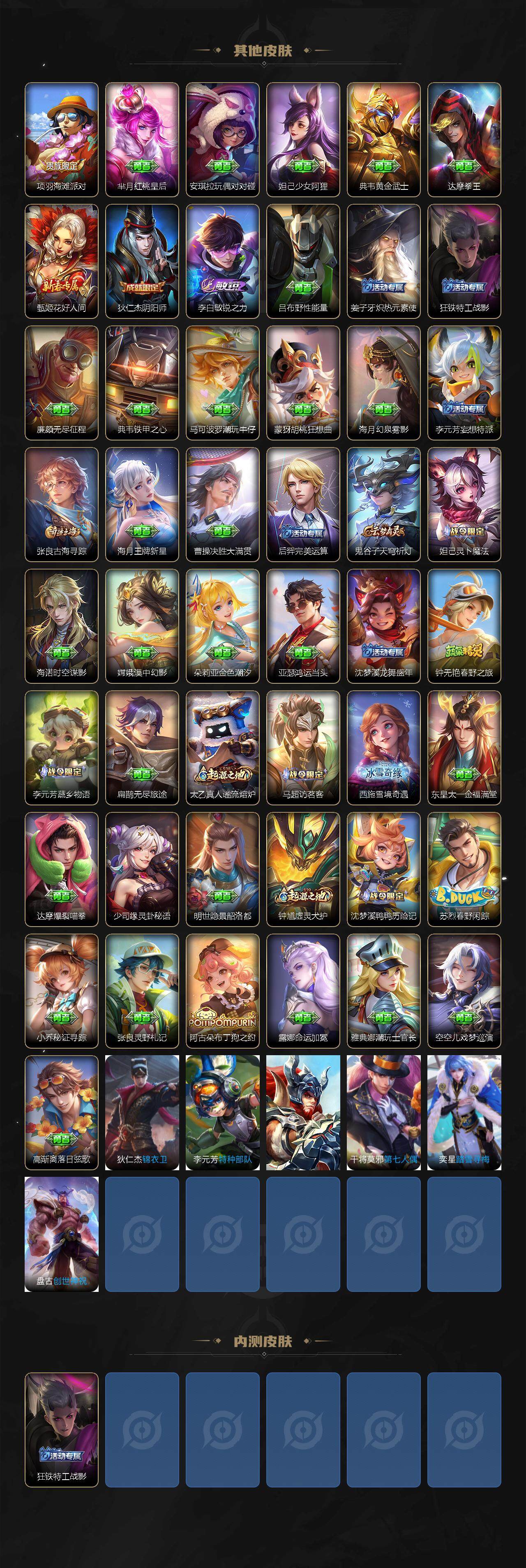 【其他皮肤】:项羽海滩派对,芈月红桃皇后,安琪拉玩偶对对碰,妲己少女阿狸,典韦黄金武士,达摩拳王,甄姬花好人间,狄仁杰阴阳师,李白敏锐之力,吕布野性能量,姜子牙炽热元素使,狂铁特工战影,廉颇无尽征程,典韦铁甲之心,马可波罗潮玩牛仔,蒙犽胡桃狂想曲,海月幻泉雾影,李元芳妄想特派,张良古海寻踪,海月王牌新星,曹操决胜大满贯,后羿完美运算,鬼谷子天穹祈灯,妲己灵卜魔法,海诺时空谍影,嫦娥漠中幻影,朵莉亚金色潮汐,亚瑟鸿运当头,沈梦溪龙舞盛年,钟无艳春野之旅,李元芳蔬乡物语,扁鹊无尽旅途,太乙真人谧流熔炉,马超访茗客,西施雪境奇遇,东皇太一金福满堂,达摩爆裂喵拳,少司缘灵卦秘语,明世隐景韶洛都,钟馗虚灵犬护,沈梦溪鸭鸭历险记,苏烈春野闲踪,小乔秘证寻踪,张良灵