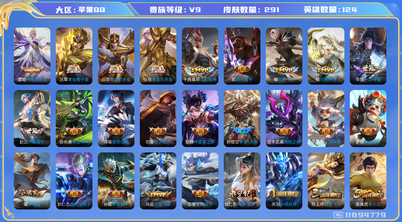 [11894779]【商品标题】:苹果Q-V9-尊贵铂金IV段位-124英雄-291皮肤-1典藏-0珍品无双-0无双-0珍品传说-34传说-110史诗