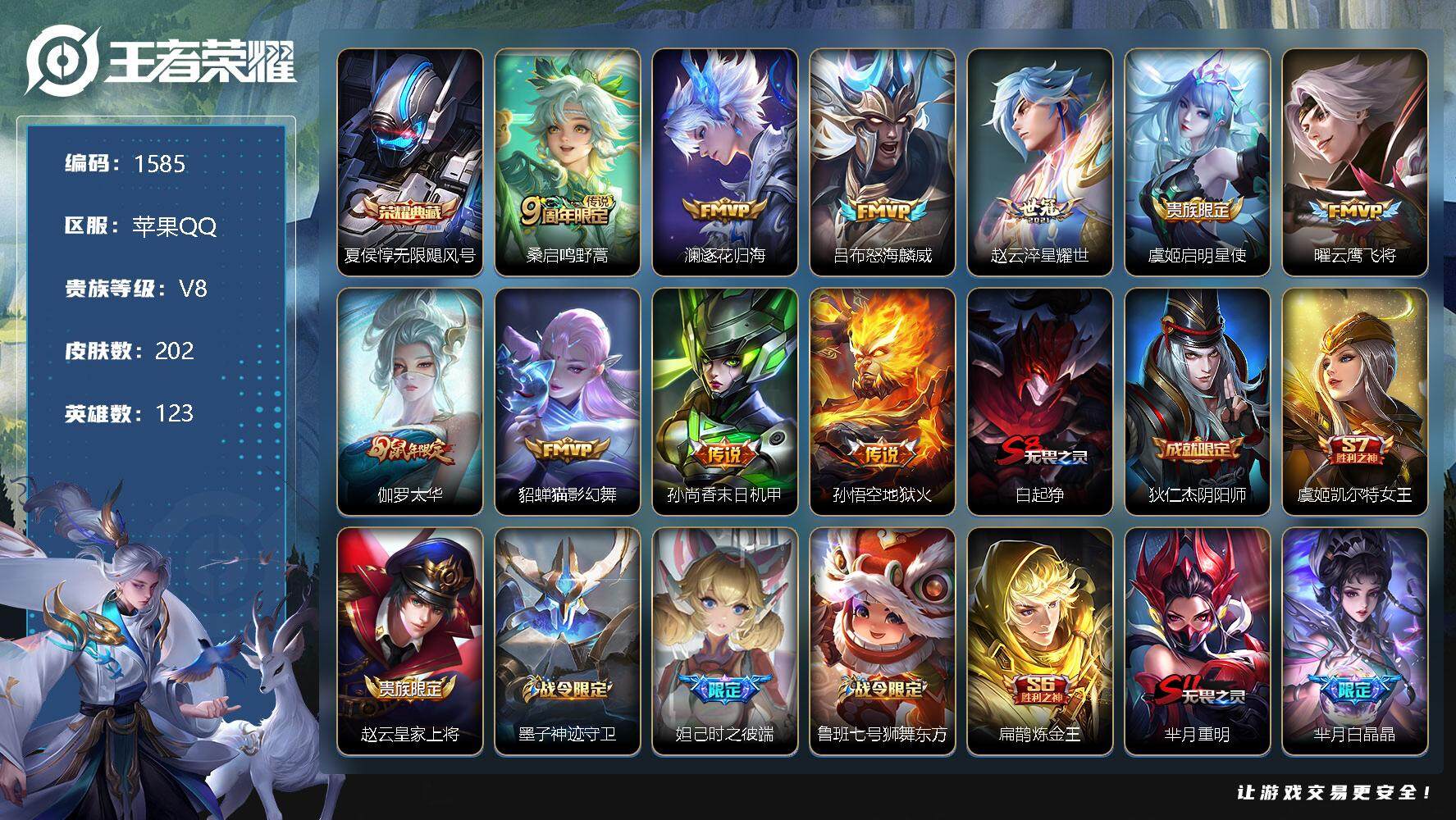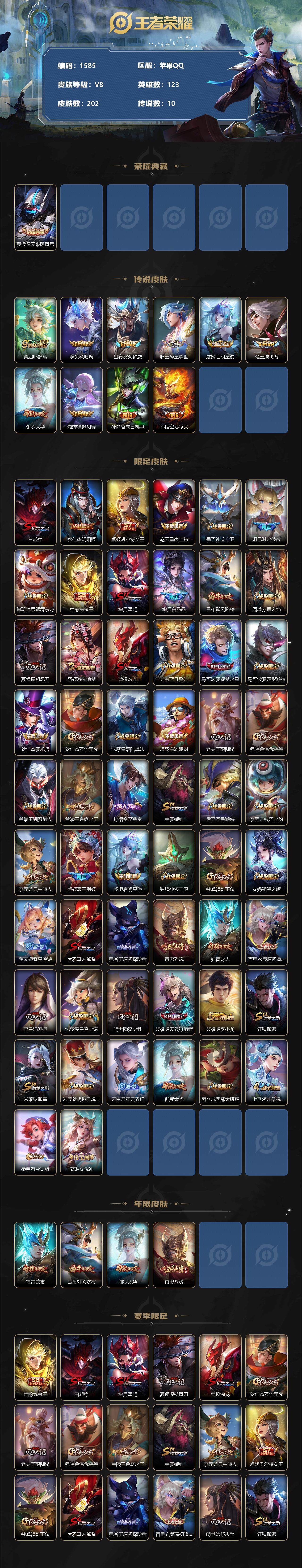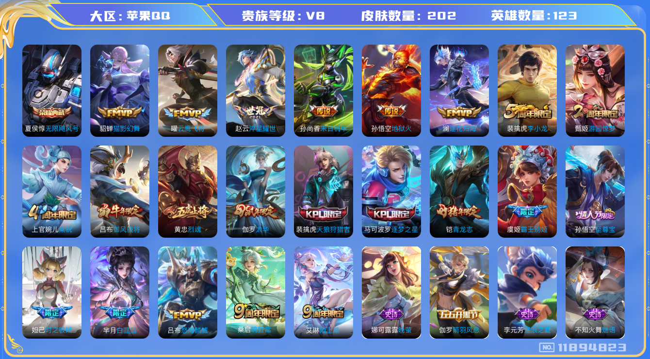 [11894823]【商品标题】:苹果Q-V5-尊贵铂金IV段位-123英雄-202皮肤-1典藏-0珍品无双-0无双-0珍品传说-10传说-65史诗
