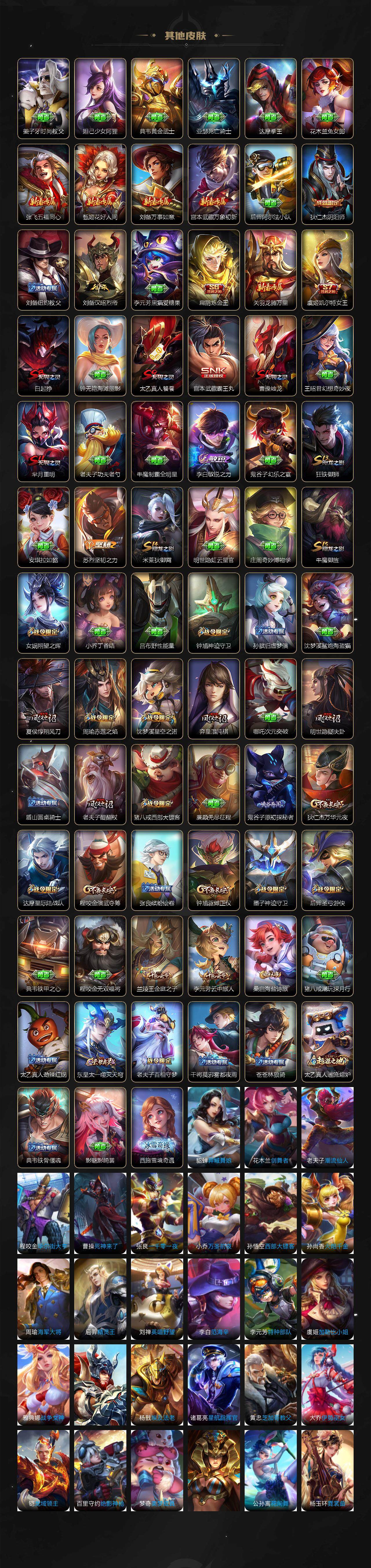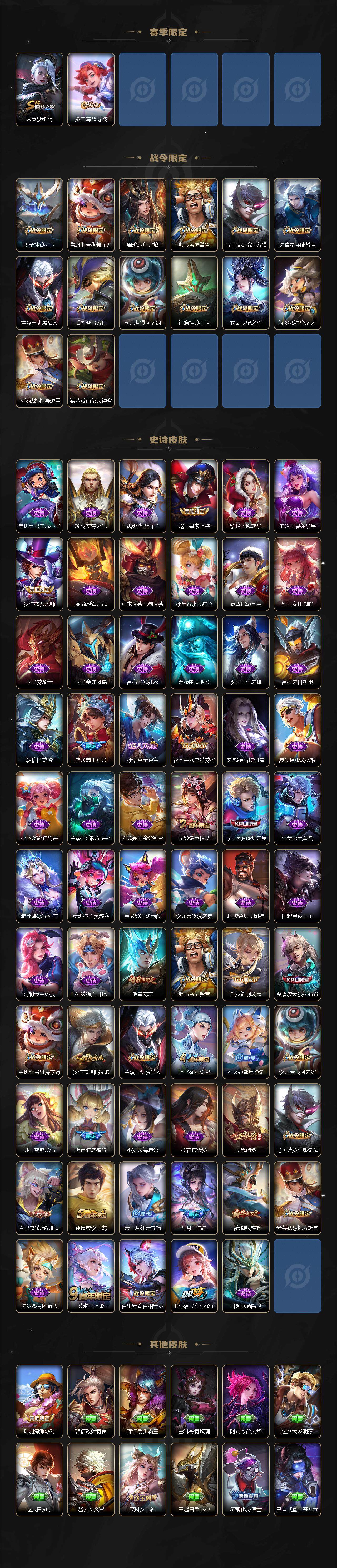 【限定皮肤】:白起狰,狄仁杰阴阳师,虞姬凯尔特女王,赵云皇家上将,墨子神迹守卫,妲己时之彼端,鲁班七号狮舞东方,扁鹊炼金王,芈月重明,芈月白晶晶,吕布御风骁将,周瑜赤莲之焰,夏侯惇朔风刀,甄姬游园惊梦,曹操烛龙,典韦蓝屏警告,马可波罗逐梦之星,马可波罗暗影游猎,狄仁杰魔术师,狄仁杰万华元夜,达摩星际陆战队,项羽海滩派对,老夫子醍醐杖,程咬金演武夺筹,兰陵王驯魔猎人,兰陵王金庭之子,孙悟空至尊宝,牛魔御旌,后羿圣弓游侠,李元芳银河之约,李元芳云中旅人,虞姬霸王别姬,虞姬启明星使,钟馗神迹守卫,钟馗驱傩正仪,女娲朔望之晖,蔡文姬繁星吟游,太乙真人饕餮,鬼谷子原初探秘者,黄忠烈魂,铠青龙志,百里玄策原初追逐者,弈星混沌棋,沈梦溪星空之诺,明世隐疑决卦,裴擒虎天狼狩猎者,裴擒虎李小龙,狂铁御狮,米莱狄御霄,米莱狄胡桃异想国,云中君纤云弄巧,伽罗太华,猪八戒西部大镖客,上官婉儿梁祝,桑启海盐诗旅,艾琳女武神