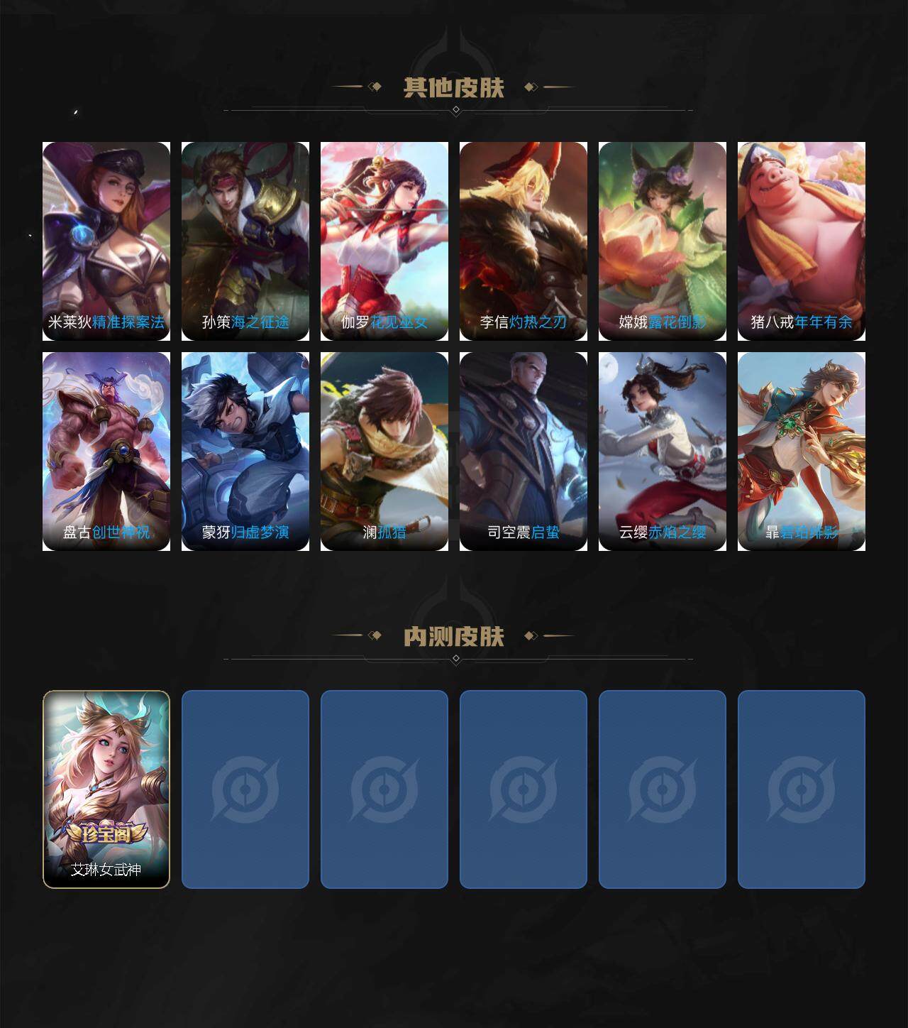 裴擒虎李小龙,上官婉儿梁祝,吕布御风骁将,黄忠烈魂,伽罗太华,裴擒虎天狼狩猎者,马可波罗逐梦之星,铠青龙志,虞姬霸王别姬,孙悟空至尊宝,妲己时之彼端,芈月白晶晶,桑启鸣野蒿,艾琳陌上桑