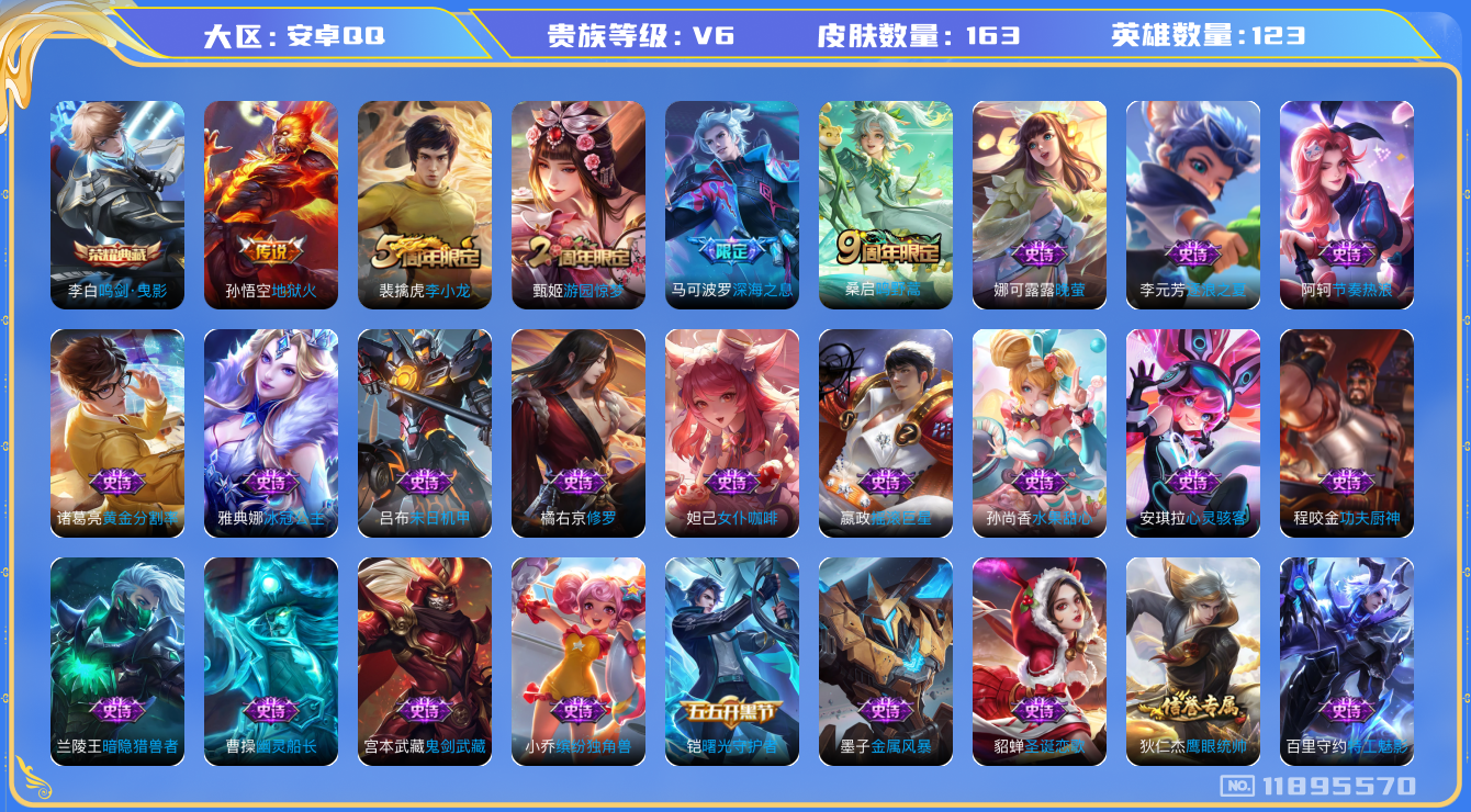 [11895570]【商品标题】:安卓Q-V3-至尊星耀III段位-123英雄-163皮肤-1典藏-0珍品无双-0无双-0珍品传说-3传说-33史诗