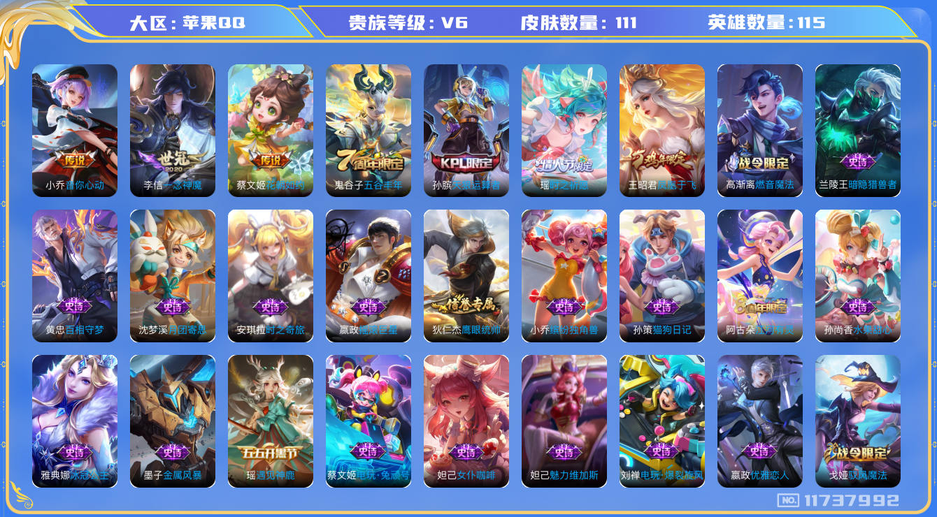[11737992]V6 4传说 114英雄 109皮肤 可修改实名 女号 信用分75分 优质装备:狐妖小红娘,一念神魔,音你心动-小乔,花朝如约(花篮子) 珍宝阁皮:优雅恋人 限定皮:凤凰于飞,五谷丰年,天狼运算者,时之祈愿-瑶(瑶传限) 史诗皮:百相守梦-黄忠,遇见神鹿,江河有灵,高渐离燃音魔法,冰冠公主,电玩·兔顽号,电玩·爆裂旋风,猫狗日记-孙策,女仆咖啡,摇滚巨星,水果甜心,时之奇旅-安琪拉,暗隐猎兽者,缤纷独角兽,月团寄思,金属风暴,鹰眼统帅,魅力维加斯