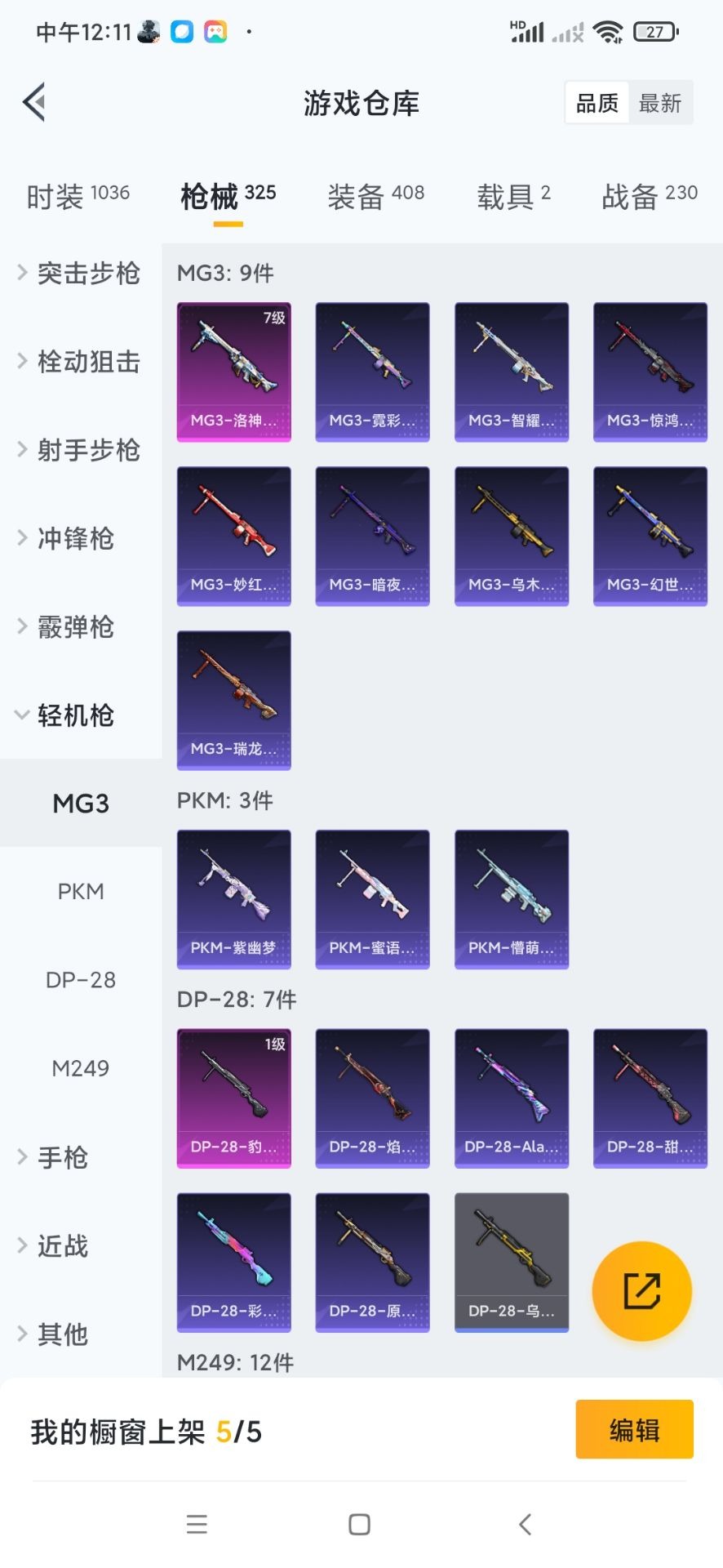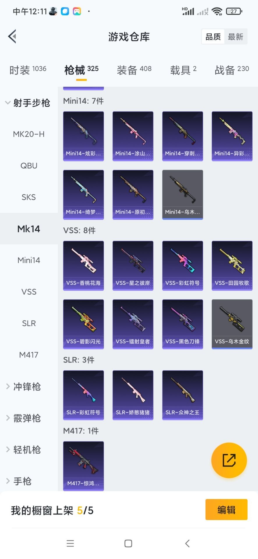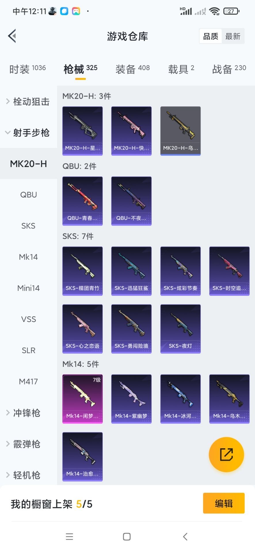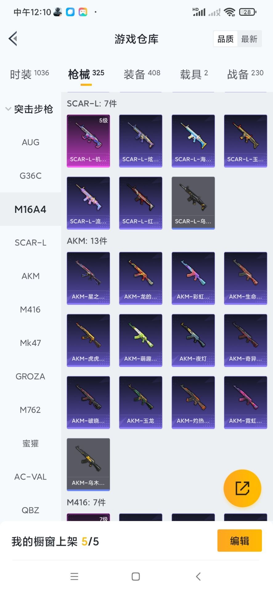 SCAR-L-机甲封神,M416-心之恋语,M762-激战未来,Kar98K-巳巳如意,Mk14-闲梦青缨,MG3-洛神天依