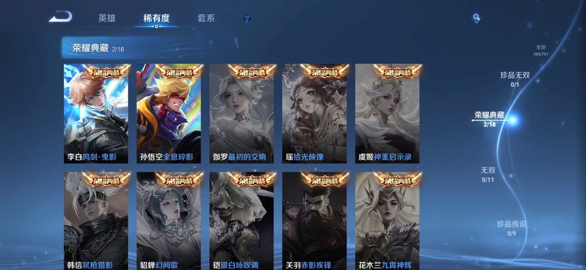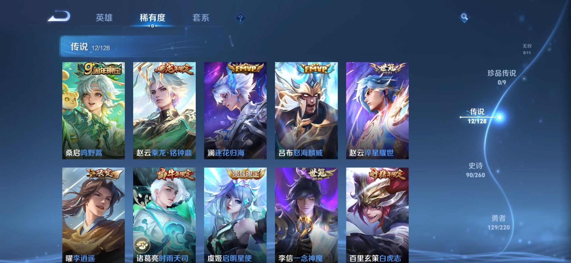 - [11471969]V7 9传说 123英雄 214皮肤 可修改实名 优质装备:云霓雀翎,碎云,鹤羽星尊 传说皮:典韦战鼓燎原,幻光神枪 珍宝阁皮:蔷薇恋人,玩趣恶龙 限定皮:愿照·九州拓(澜年限),愿照·众生和(妲己年限),映山客,鸣野蒿,五谷丰年,李小龙,大圣娶亲 史诗皮:鸭鸭历险记-刘禅,化蝶舞,龙之律动,茶境仙,破空之剑,百相守梦-百里守约,紫霞仙子,苍穹之光,特工魅影,千年之狐,电玩·爆裂旋风,江河有灵,冰冠公主,末日机甲-吕布,时之恋人-孙尚香,乱世虎臣,摇滚巨星,水果甜心,天才门将,星夜王子,心灵骇客,功夫厨神,德古拉伯爵,鬼剑武藏,舞动绿茵,地狱岩魂,繁星吟游(呼啦呼啦),逐浪之夏,曙光守护者,金属风暴,原初追逐者,圣诞恋歌,鹰眼统帅,王者之锤,魅力维加斯,黎明之约,无心,未来纪元-赵云