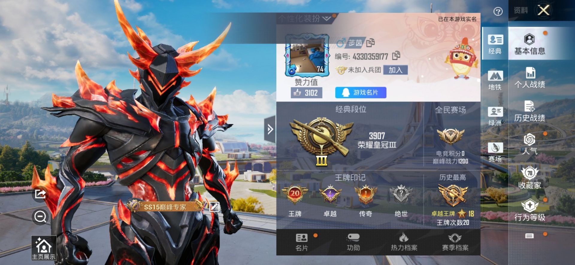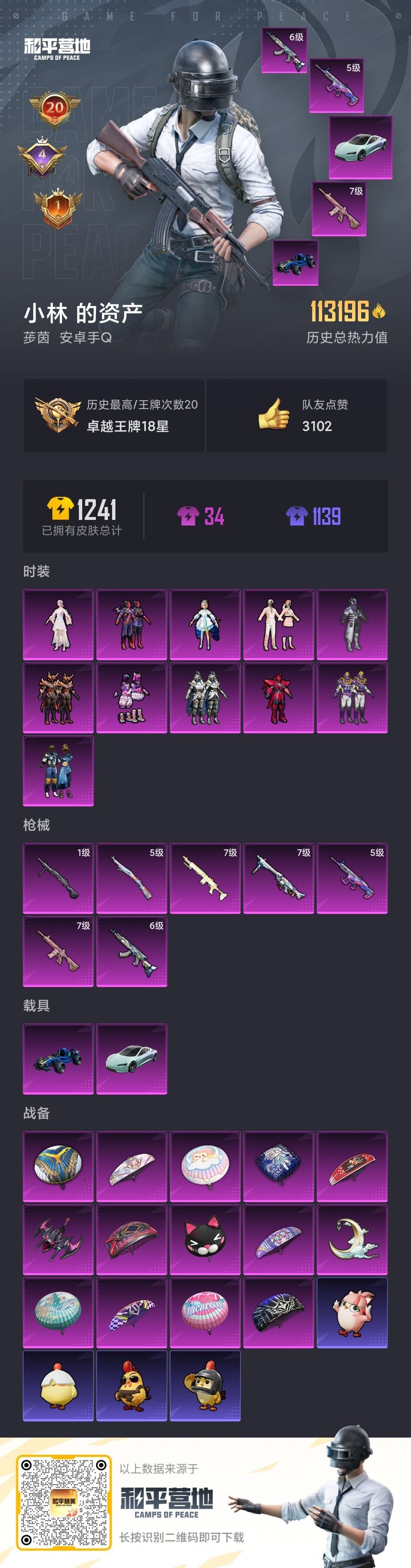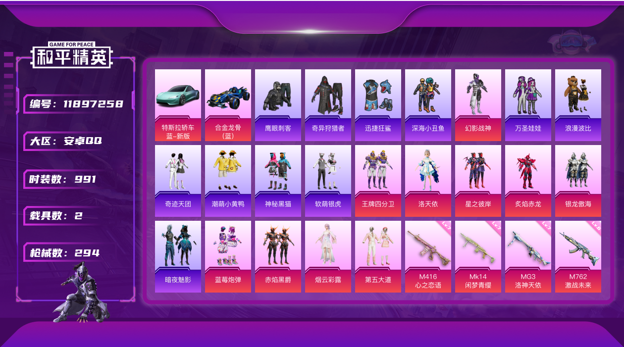 [11897258]11粉装 7特效枪 2载具 20印记 可二次 可修改实名 连体王者 优质装备:合金龙骨(蓝),特斯拉Roadster(水滴蓝),MG3洛神天依,M416心之恋语,奇异狩猎者,幻影战神,M762激战未来,王牌四分卫,星之彼岸,SCAR-L机甲封神,洛天依,MK14闲梦青缨,七级MK14-闲梦青缨,七级MG3-洛神天依,七级M416-心之恋语,Kar98K-巳巳如意 热门装扮:炙焰赤龙,蓝莓炮弹,银龙傲海,赤焰黑爵,第五大道,烟云彩露,神秘黑猫,软萌银虎,奇迹天团,潮萌小黄鸭,迅捷狂鲨,鹰眼刺客,万圣娃娃,深海小丑鱼,浪漫波比,暗夜魅影 稀有枪皮:DP-28-豹影疾电 六级特效枪:六级M762-激战未来 五级特效枪:五级Kar98K-巳巳如意,五级SCAR-L-机甲封神 一级特效枪:一级DP-28-豹影疾电 紫色装扮:田园牧歌,轻风白浪,和煦暖阳,SS22特训,莱茵河畔,SS23特训,幻彩翩翩,灵蜜圈圈,妙红点点,娇憨猪猪,萌趣咩咩,SS21特训,SS31特训套装,SS5特训,人气偶像,军械专家,冰川特警,冷焰舞者,北国孤狼,千禧之恋,SS33特训套装,青涩时光,SS20特训,梦起落英,青春冒险家,光影梦想家,潮流游乐家,SS15特训,暗夜傀儡,捷德奥特曼,双棍侠客,时空追击者,暴风机械师,星辰守护者,SS16特训,爆裂葡萄,星河入梦,快乐星愿,闪金天王,银白舞王,SS13特训,击剑大师,骁骑迪迦,星梦畅游,治愈之星,迅捷之星,科技之星,SS14特训,萌趣颜团子,特种颜团子,猎梦纪元,飞驰魅影,音速流光,极速竞梦,SS19特训,英勇保护者,豚鼠丹丹,吉莉礼服,甜心亚梦,虚音幻奏,电音精灵,天籁歌者,瑞龙福将,团圆交子,醒狮腾龙,SS17特训,冰暴轰轰,异彩先驱,缤纷焰火,SS18特训,水晶王族,都市魅力,酒红色名流,酷潮明星,野性战心,野性战魂,金鼠迎春,长空猛禽,雨林探路者,迅猛虎鲸,雪山精英,雪鹰学院,霓虹极客,霓虹街区,霸义无双,青年教官,青春校园,迎春赐吉,缤纷果语,耀眼新星,荣耀,蓝彩潮人,蓝色运动,虎虎生威吉莉,街头潮人,跃动心情,青涩年华,风行保卫者,飞行日记,龙腾端午,骑行爱好者,魅力单车,鹤鸣,麻辣教官,黄色名流,黄色格斗者,黎明保卫者,黑色伏地魔,龙的传人,龟仙人,龙魂突击队,缤纷假日,朋克治安官,极速红龙,柠萌假日,格斗先锋,沙漠兵团