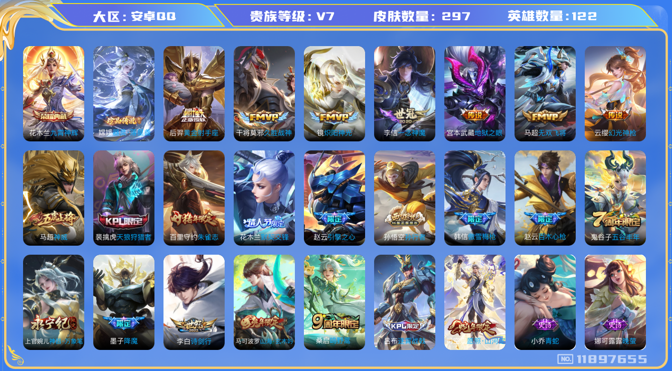 [11897655]【商品标题】:安卓Q-V6-最强王者段位-122英雄-297皮肤-1典藏-0珍品无双-0无双-1珍品传说-10传说-82史诗