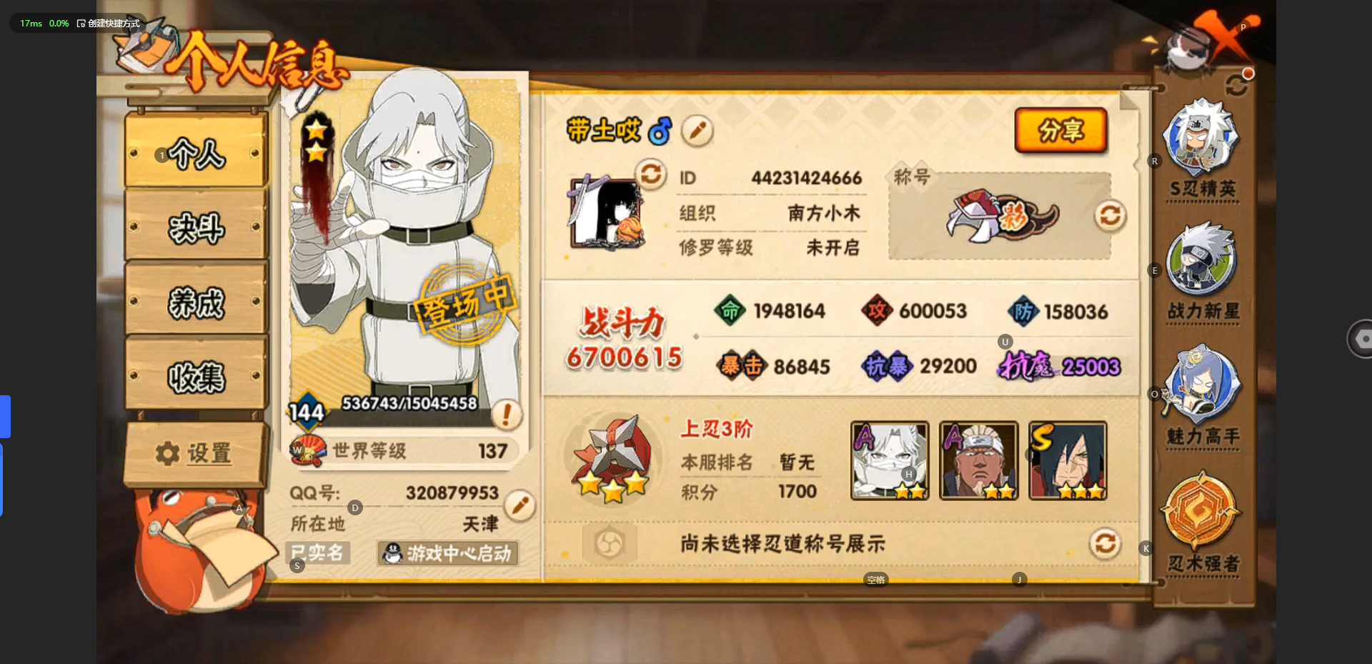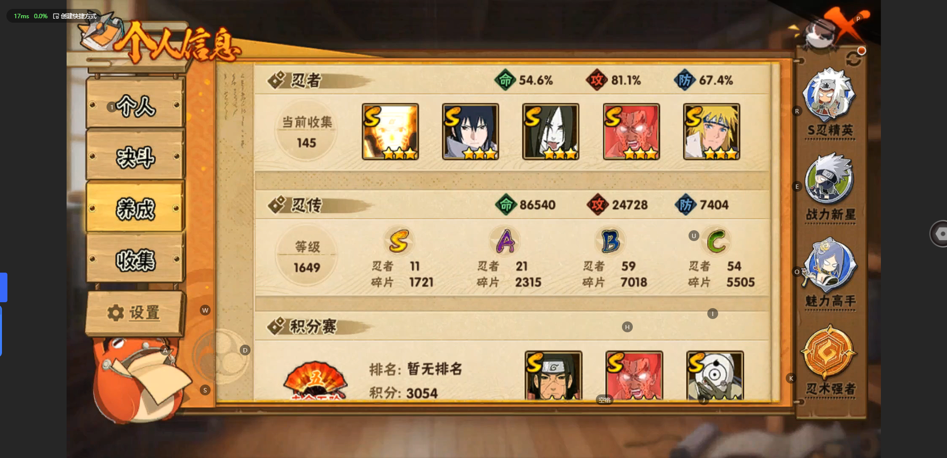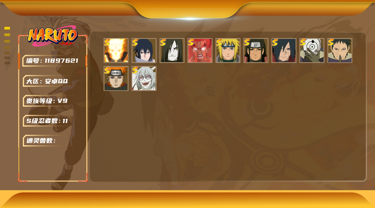 [11897621]V9 11S忍 668.7W战力 可二次 S级忍者:宇智波斑「秽土转生·解」,宇智波佐助「永恒万花筒」,漩涡鸣人 「九喇嘛连结」,迈特凯「死门」,宇智波带土 「忍界大战」,千手柱间「秽土转生」,药师兜「仙人模式」,“宇智波斑” 「白面具」,佩恩「天道」,波风水门,大蛇丸
