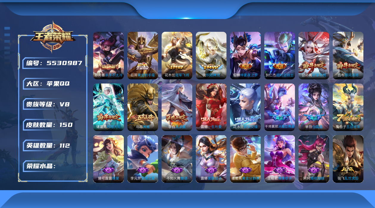 [5530987]30975.1典藏 9传说 金标司空震 金标露娜 实名: 可修改 贵族等级: V8 英雄数: 112 皮肤数: 150 荣耀水晶: 杀手不太冷 传说皮: 黄金射手座,冠军飞将,炽阳神光,仲夏夜之梦,超时空战士-狄仁杰 限定皮: 祈雪灵祝,御风骁将,时雨天司,白晶晶,神威,冰霜恋舞曲,凤求凰,一生所爱,默契交锋-花木兰,五谷丰年