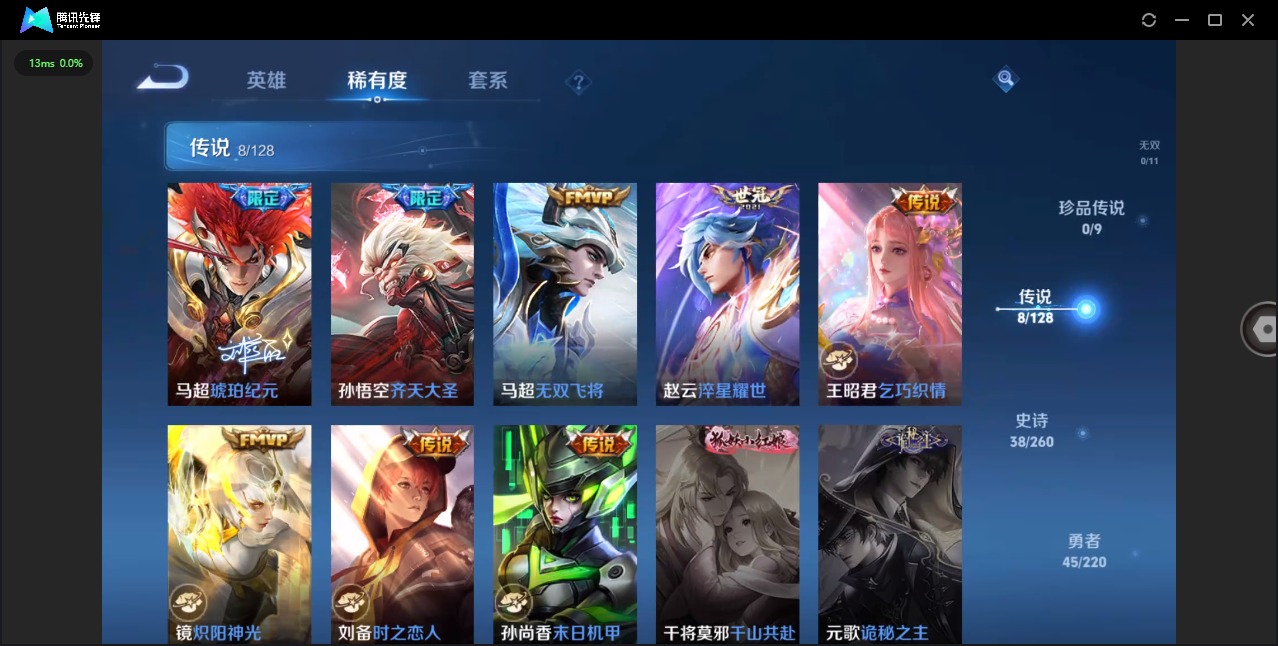 - [11991272]V7 3传说 123英雄 204皮肤 可修改实名 优质装备:久胜战神,地狱之眼,鹤羽星尊 珍宝阁皮:蔷薇恋人 限定皮:至尊宝,游园惊梦,梁祝,李小龙,引擎之心 史诗皮:鸭鸭历险记-刘禅,化蝶舞,龙之律动,石田雨龙,紫霞仙子,特工魅影,千年之狐,匿光侦查者,偶像歌手,乱世虎臣,女仆咖啡,水果甜心,功夫厨神,暗隐猎兽者,纤云弄巧,乘风破浪,逐浪之夏,水晶猎龙者,金属风暴,圣诞狂欢,圣诞恋歌,鹰眼统帅,魅力维加斯,未来纪元-赵云