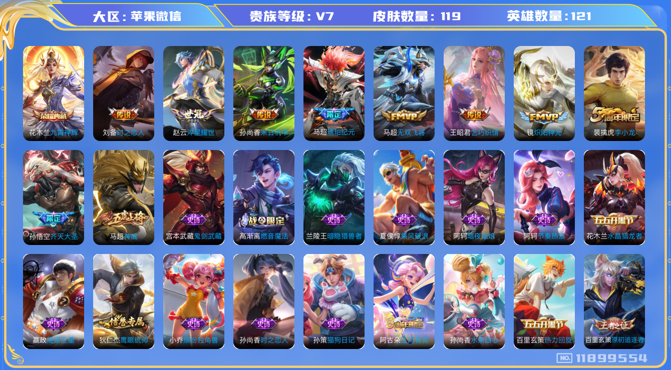 [11899554]V7 1典藏 8传说 121英雄 119皮肤 可修改实名 优质装备:九霄神辉(木兰典藏),炽阳神光,末日机甲-孙尚香(绿蚂蚱),乞巧织情,时之恋人-刘备(电焊工),淬星耀世,无双飞将,琥珀纪元马超 珍宝阁皮:妄想食味 限定皮:神威(电光马子),齐天大圣,李小龙 史诗皮:紫霞仙子,江河有灵,魅语,高渐离燃音魔法,蒙恬荣光圣徽,冰冠公主,晚萤,暗夜猫娘,猫狗日记-孙策,时之恋人-孙尚香,节奏热浪,摇滚巨星,水果甜心,暗隐猎兽者,鬼剑武藏,繁星吟游(呼啦呼啦),缤纷独角兽,乘风破浪,逐浪之夏,水晶猎龙者,热力回旋,原初追逐者,圣诞狂欢,鹰眼统帅,魅力维加斯,赏金猎手,未来纪元-赵云,玫瑰异探