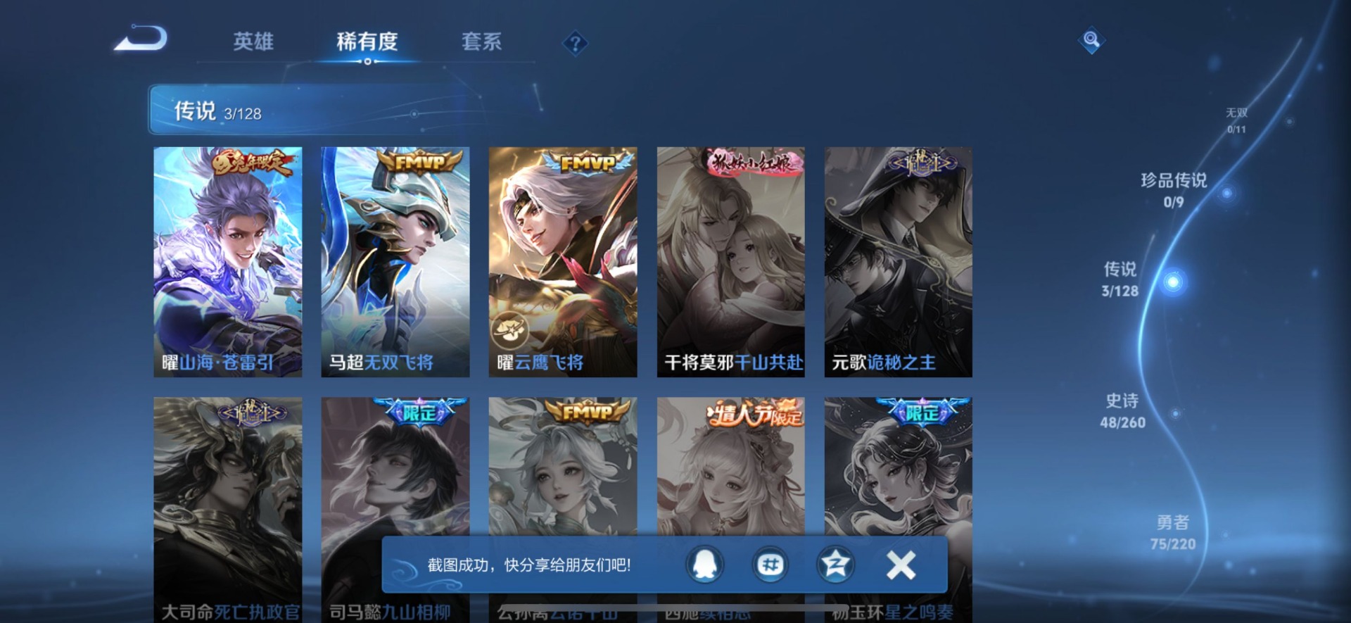 - PX_2091732-40 苹果QQ/至尊星耀/71皮肤/82英雄/0典藏/0珍品无双/0无双/1珍品传说/5传说/19史诗/6稀有英雄 【1 珍品传说】时之奇旅 孙策, 【5 传说皮肤】无双飞将 马超,云鹰飞将 曜,黄金射手座 后羿,绛天战甲 铠,愿照·九州拓 澜, 【19 史诗皮肤】紫霞仙子 露娜,魅力维加斯 妲己,鹰眼统帅 狄仁杰,傲雪梅枪 韩信,特工魅影 百里守约,鸭鸭历险记 刘禅,魔术师