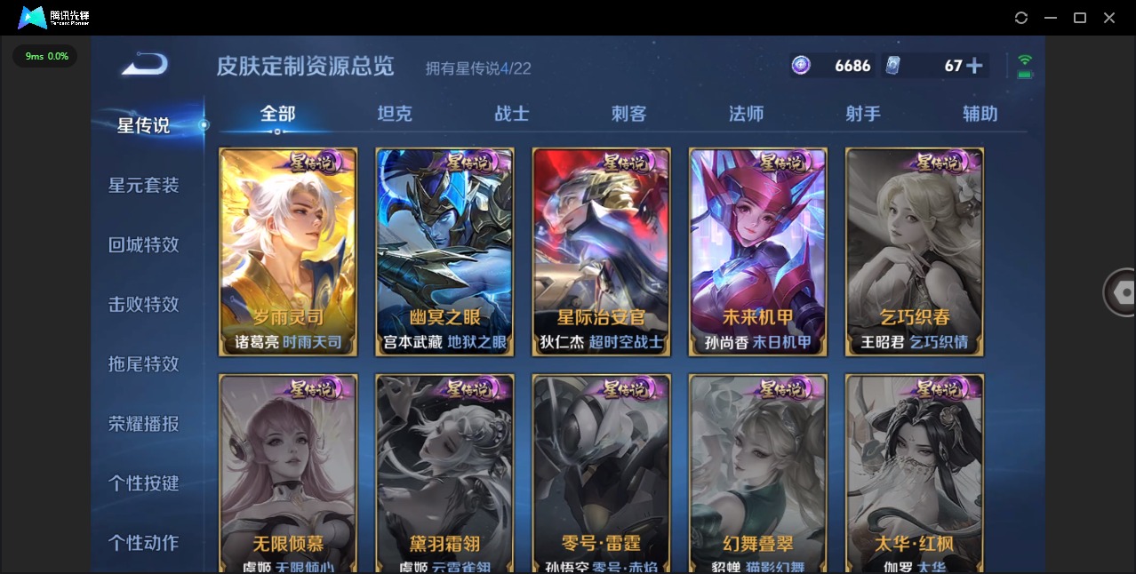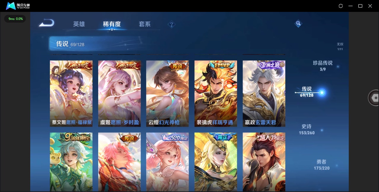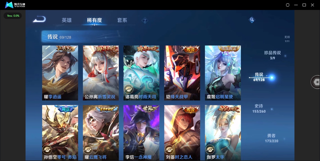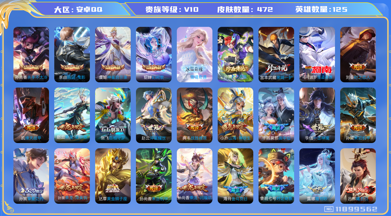 - [12064039]V9 1典藏 1无双 2珍品传说 24传说 125英雄 354皮肤 可修改实名 优质装备:神鉴启示录,韩信群星魔术团(韩信无双),朽木白哉,黑崎一护,黄金白羊座,久胜战神,炽阳神光,一念神魔,乞巧织情,超时空战士-狄仁杰,挚爱之约,山海·炽霜斩(李信年限),电玩·雷克斯,妄想实况,澜逐花归海,琥珀纪元铠,云中君群星魔术团,涂山容容 传说皮:乘龙·问璇玑(孙尚香年限),祥瑞亨通,幻光神枪 珍宝阁皮:妄想食味,女武神 限定皮:愿照·九州拓(澜年限),愿照·岁时盈(虞姬年限),鸣野蒿,夏侯惇霜北刀,至尊宝,魔法小厨娘,白晶晶,时雨天司(水龙头),诗剑行,齐天大圣,五谷丰年,梁祝,御风骁将(吕布年限),烈魂,如梦令-后羿,默契交锋-花木兰,孙行者,大圣娶亲,引擎之心,乒乒小将,美猴王,玉兔公主,山海·玄木吟(马可年限) 史诗皮:鸭鸭历险记-刘禅,化蝶舞,星界战将,龙之律动,雪豹·霜爪,藏狐·褐绒,石田雨龙,百相守梦-周瑜,茶境仙,怒海争锋,破空之剑,涂山红红,东方月初,蒙犽顽岩魄,埋骨钱,芈月浮光幕影,海诺心动手记,琥珀纪元伽罗,决胜骁骑,上官婉儿群星魔术团,蔬乡物语(鲁班七号),超元猎域,百相守梦-百里守约,百相守梦-黄忠,紫霞仙子,苍穹之光,黄金分割率,特工魅影,千年之狐,永昼,江河有灵,雪夜绮愿(周瑜),真我赫兹(百里守约),百解令(蒙犽),高渐离燃音魔法,蒙恬荣光圣徽,无限星赏官,冰冠公主,青蛇,偶像歌手,晚萤,电玩·爆裂旋风,百相守梦(刘备),暗夜猫娘,末日机甲-吕布,猫狗日记-孙策,猫狗日记-大乔,乱世虎臣,节奏热浪,修罗,女仆咖啡,水果甜心,绅士熊喵,天才门将,星夜王子,心灵骇客,功夫厨神,暗隐猎兽者,幽灵船长,鬼剑武藏,暗渊魔法,心灵战警,乐园奇幻夜,天秀·启明,舞动绿茵,地狱岩魂,纤云弄巧,繁星吟游(呼啦呼啦),拒霜思,缤纷独角兽,乘风破浪,逐浪之夏,水晶猎龙者,曙光守护者,箭羽风息,唤灵魅影,金属风暴,原初追逐者,圣诞狂欢,圣诞恋歌,鹰眼统帅,暗夜贵公子,魅力维加斯,赏金猎手,无心,未来纪元-赵云