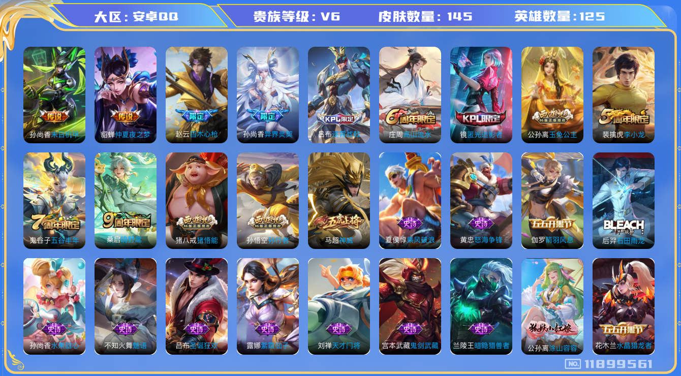 - [12075140]V7 1典藏 1珍品传说 12传说 125英雄 235皮肤 可修改实名 优质装备:九霄神辉(木兰典藏),黑崎一护,黄金射手座,云鹰飞将(小将军),绛天战甲(鸡嘴战神),久胜战神,地狱火,游龙清影(小青龙),天秀幻梦,澜逐花归海,千山共赴,涂山容容 传说皮:幻光神枪 珍宝阁皮:胡桃夹子,万物之道 限定皮:愿照·山河定(司空震年限),逐霄战戟,鸣野蒿,至尊宝,山海·碧波行(瑶年限),怒海麟威,梁祝,如梦令-嫦娥,默契交锋-花木兰,孙行者 史诗皮:器灵·浮梦炉,星界战将,谪仙醉月,龙之律动,百相守梦-周瑜,戍鼓铭心,怒海争锋,撼地雄心,破空之剑,夜落电台,上官婉儿群星魔术团,乘龙·聚宝船(安琪拉年限),百相守梦-百里守约,百相守梦-黄忠,织梦人,遇见神鹿,紫霞仙子,黄金分割率,特工魅影,千年之狐,永昼,江河有灵,百解令(蒙犽),蒙恬荣光圣徽,无限星赏官,电玩·爆裂旋风,末日机甲-吕布,猫狗日记-大乔,乱世虎臣,节奏热浪,女仆咖啡,水果甜心,天才门将,心灵骇客,功夫厨神,德古拉伯爵,暗隐猎兽者,幽灵船长,鬼剑武藏,拒霜思,缤纷独角兽,逐浪之夏,曙光守护者,圣诞狂欢,圣诞恋歌,鹰眼统帅,魅力维加斯,赏金猎手,天秀幻梦,无心