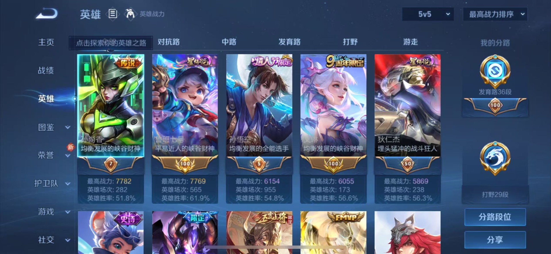 - PX_2109688-贵族等级: V5 英雄数: 79 皮肤数: 57 传说皮: 霜月吟,澜逐花归海,祥瑞亨通 限定皮: 鸣野蒿,逐霄战戟