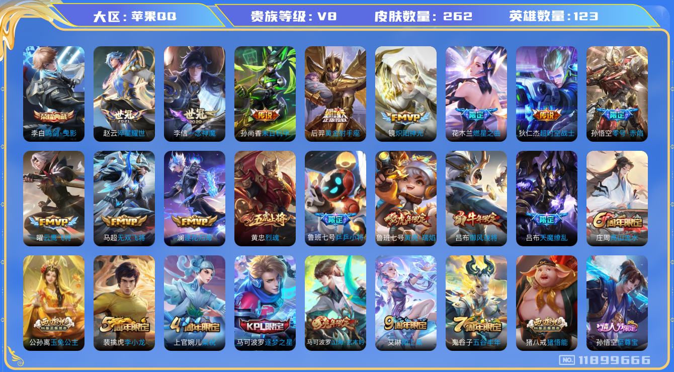 [11899666]V8 1典藏 15传说 123英雄 262皮肤 可修改实名 优质装备:鸣剑·曳影,黄金射手座,云鹰飞将(小将军),炽阳神光,一念神魔,末日机甲-孙尚香(绿蚂蚱),零号·赤焰,淬星耀世,超时空战士-狄仁杰,无双飞将,燃星之曲,澜逐花归海,涂山容容 珍宝阁皮:优雅恋人,玩趣恶龙 限定皮:愿照·九州拓(澜年限),陌上桑,至尊宝,高山流水,五谷丰年,冰锋战神,梁祝,御风骁将(吕布年限),逐梦之星,烈魂,李小龙,逐梦之影,猪悟能,天魔缭乱,乒乒小将,寅虎·瑞焰(虎皮蛋子),玉兔公主,山海·玄木吟(马可年限) 史诗皮:星界战将,怒海争锋,破空之剑,战舞者,蔬乡物语(鲁班七号),紫霞仙子,苍穹之光,白龙吟,黄金分割率,特工魅影,江河有灵,百解令(蒙犽),高渐离燃音魔法,蒙恬荣光圣徽,偶像歌手,百相守梦(刘备),猫狗日记-孙策,猫狗日记-大乔,乱世虎臣,节奏热浪,修罗,水果甜心,绅士熊喵,天才门将,星夜王子,心灵骇客,功夫厨神,德古拉伯爵,暗隐猎兽者,幽灵船长,鬼剑武藏,心灵战警,天秀·启明,舞动绿茵,地狱岩魂,纤云弄巧,拒霜思,缤纷独角兽,乘风破浪,逐浪之夏,金属风暴,原初追逐者,圣诞狂欢,圣诞恋歌,鹰眼统帅,黎明之约,无心