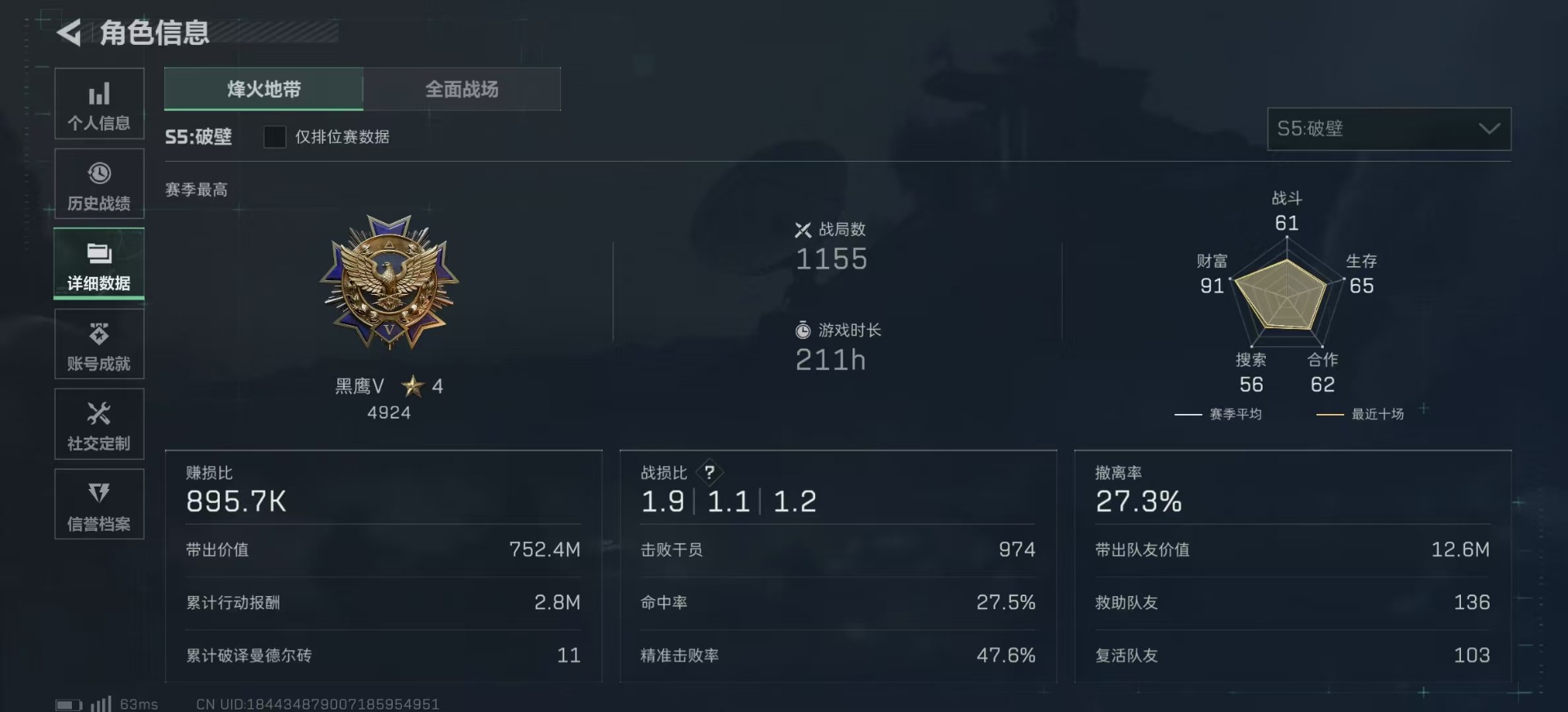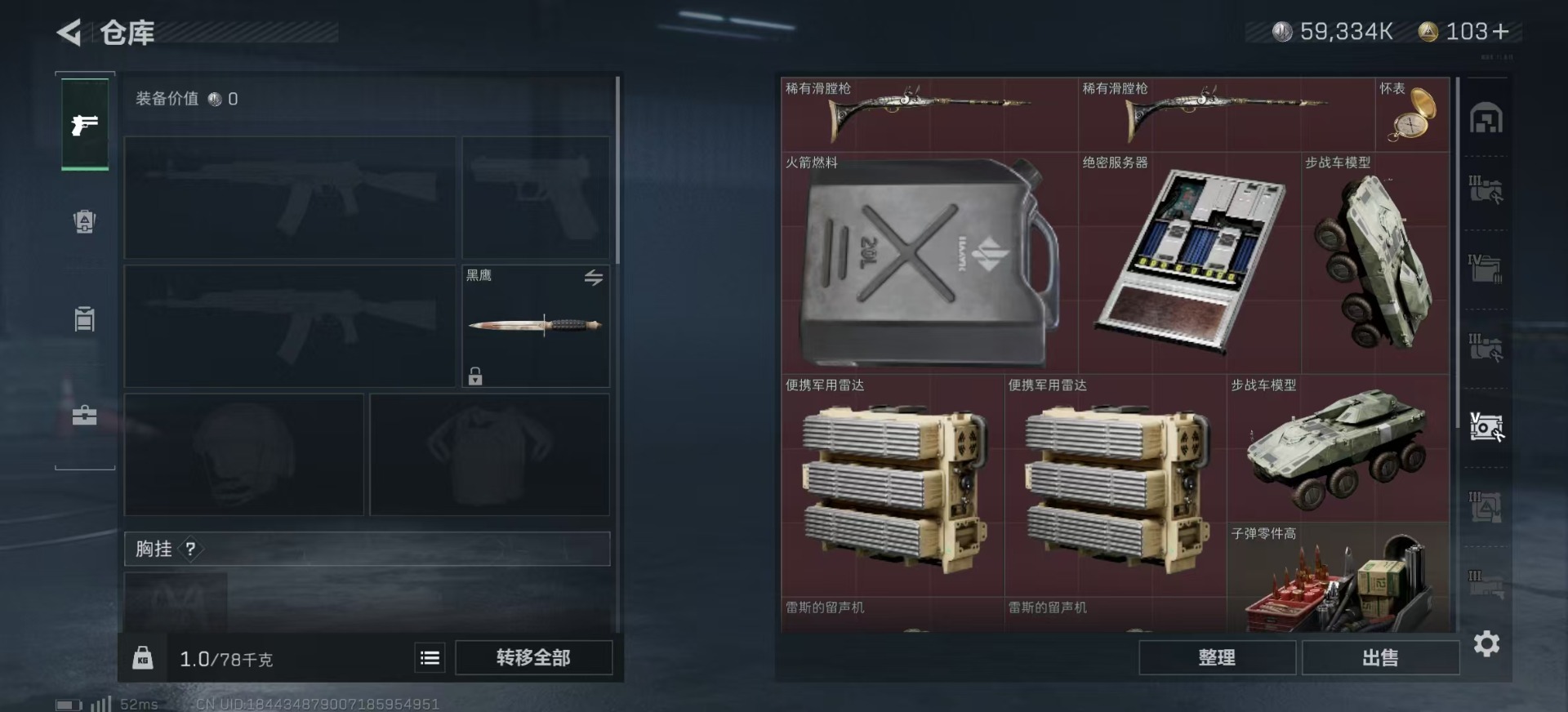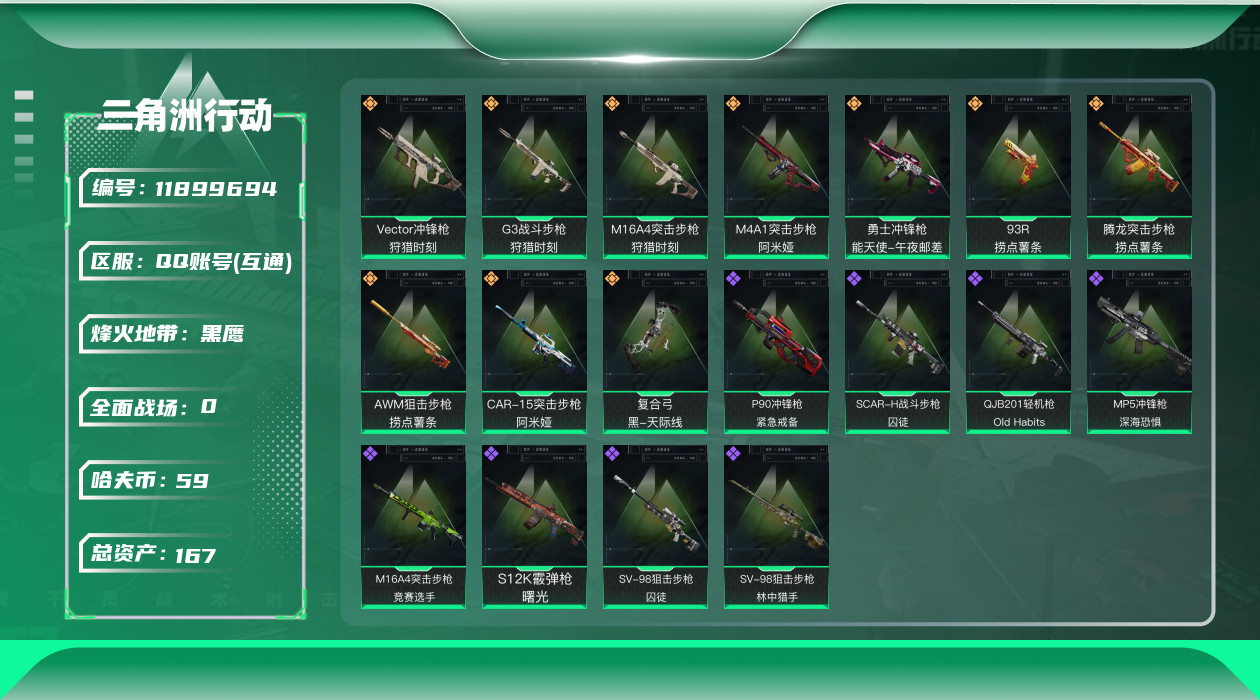 [11899694]总资产:167.6M 10传说枪械 哈夫币:59.334K 可二次 可修改实名 优质装备:顶级安全箱(3x3) 烽火地带段位:黑鹰 全面战场段位:列兵 传说武器皮肤:M16A4突击步枪-狩猎时刻,AWM狙击步枪-捞点薯条,腾龙突击步枪-捞点薯条,93R-捞点薯条,勇士冲锋枪-能天使-午夜邮差,Vector冲锋枪-狩猎时刻,G3战斗步枪-狩猎时刻,复合弓-黑-天际线,M4A1突击步枪-阿米娅,CAR-15突击步枪-阿米娅 史诗武器皮肤:QJB201轻机枪-Old Habits,MP5冲锋枪-深海恐惧,M16A4突击步枪-竞赛选手,SV-98狙击步枪-林中猎手,SV-98狙击步枪-囚徒,SCAR-H战斗步枪-囚徒,S12K霰弹枪-曙光,P90冲锋枪-紧急戒备