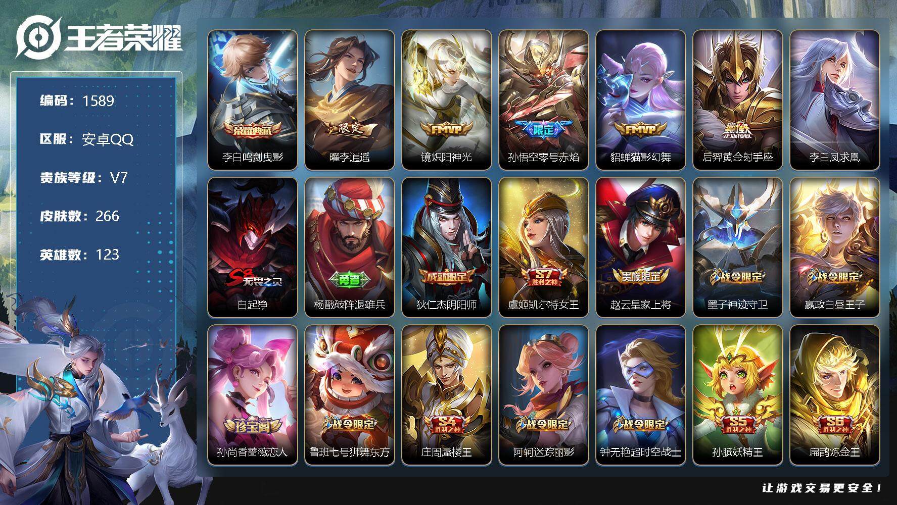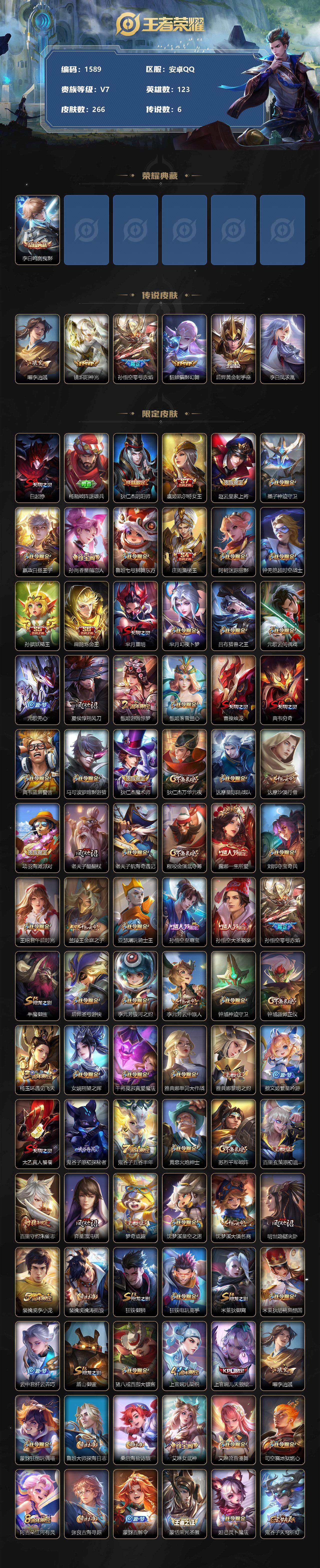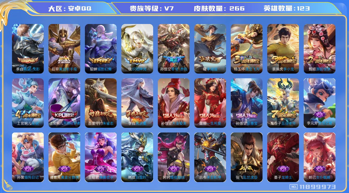 [11899973]【商品标题】:安卓Q-V0-荣耀黄金I段位-123英雄-266皮肤-1典藏-0珍品无双-0无双-0珍品传说-6传说-70史诗