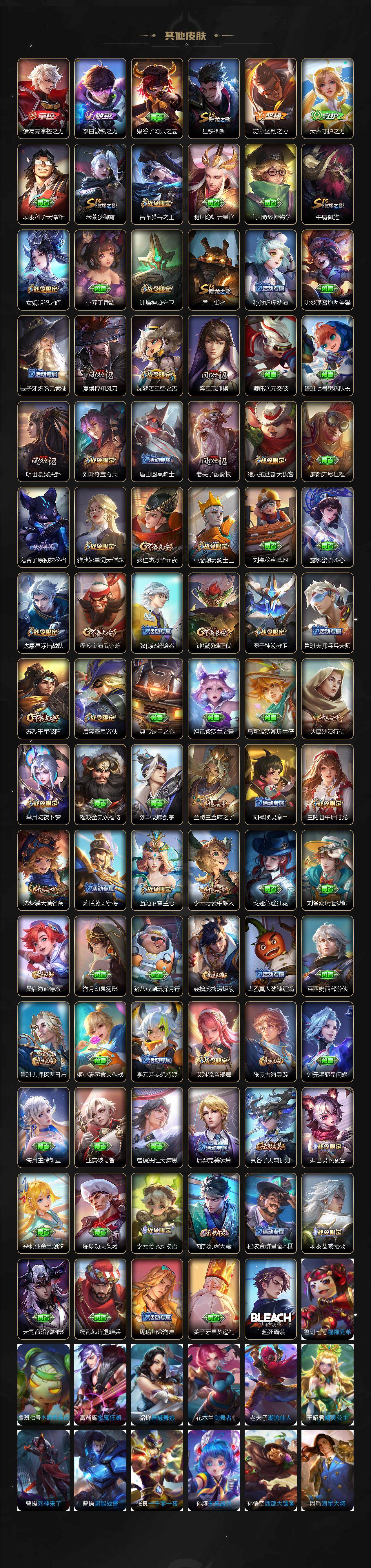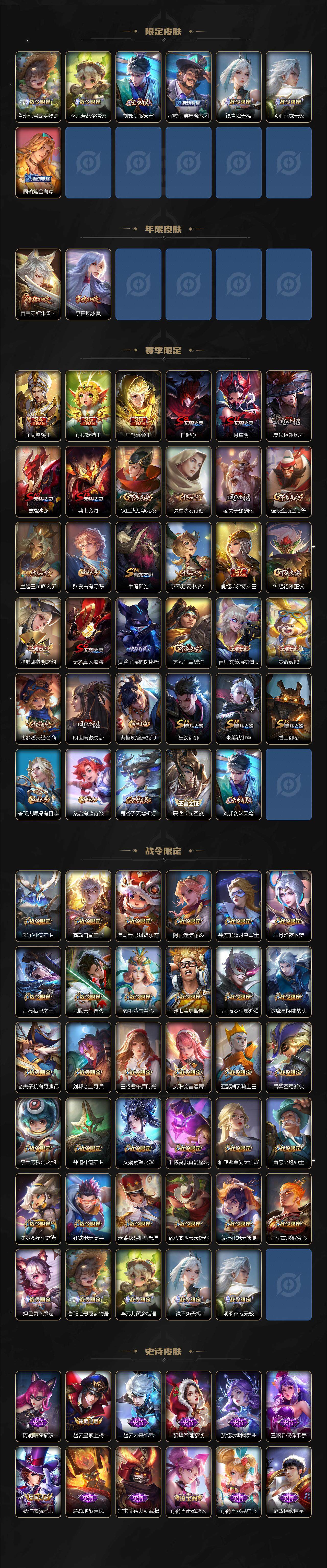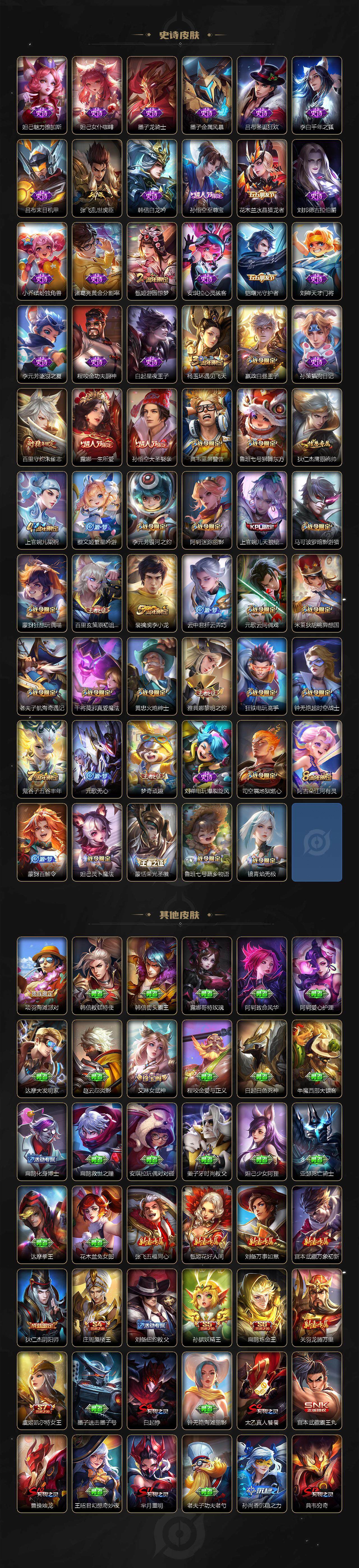 【限定皮肤】:白起狰,杨戬破阵退雄兵,狄仁杰阴阳师,虞姬凯尔特女王,赵云皇家上将,墨子神迹守卫,嬴政白昼王子,孙尚香蔷薇恋人,鲁班七号狮舞东方,庄周蜃楼王,阿轲迷踪丽影,钟无艳超时空战士,孙膑妖精王,扁鹊炼金王,芈月重明,芈月幻夜卜梦,吕布猎兽之王,元歌云间偶戏,元歌无心,夏侯惇朔风刀,甄姬游园惊梦,甄姬落雪兰心,曹操烛龙,典韦穷奇,典韦蓝屏警告,马可波罗暗影游猎,狄仁杰魔术师,狄仁杰万华元夜,达摩星际陆战队,达摩沙漠行僧,项羽海滩派对,老夫子醍醐杖,老夫子航海奇遇记,程咬金演武夺筹,露娜一生所爱,刘邦夺宝奇兵,王昭君午后时光,兰陵王金庭之子,亚瑟潮玩骑士王,孙悟空至尊宝,孙悟空大圣娶亲,孙悟空零号赤焰,牛魔御旌,后羿圣弓游侠,李元芳银河之约,李元芳云中旅人,钟馗神迹守卫,钟馗驱傩正仪,杨玉环遇见飞天,女娲朔望之晖,干将莫邪真爱魔法,雅典娜单词大作战,雅典娜黎明之约,蔡文姬繁星吟游,太乙真人饕餮,鬼谷子原初探秘者,鬼谷子五谷丰年,黄忠火炮绅士,苏烈千军破阵,百里玄策原初追逐者,百里守约朱雀志,弈星混沌棋,梦奇顽趣,沈梦溪星空之诺,沈梦溪大漠名商,明世隐疑决卦,裴擒虎李小龙,裴擒虎擒涛扼浪,狂铁御狮,狂铁电玩高手,米莱狄御霄,米莱狄胡桃异想国,云中君纤云弄巧,盾山御銮,猪八戒西部大镖客,上官婉儿梁祝,上官婉儿天狼绘梦者,曜李逍遥 ,蒙犽狂想玩偶喵,鲁班大师探海日志,桑启海盐诗旅,艾琳女武神,艾琳流音漫舞,司空震地狱燃心,阿古朵江河有灵,张良古海寻踪,蒙犽百解令,蒙恬荣光圣徽,妲己灵卜魔法,鬼谷子天穹祈灯,鲁班七号蔬乡物语,李元芳蔬乡物语,刘邦剑破天穹,程咬金群星魔术团,镜青焰无极,项羽苍威无极,周瑜熔金海岸
