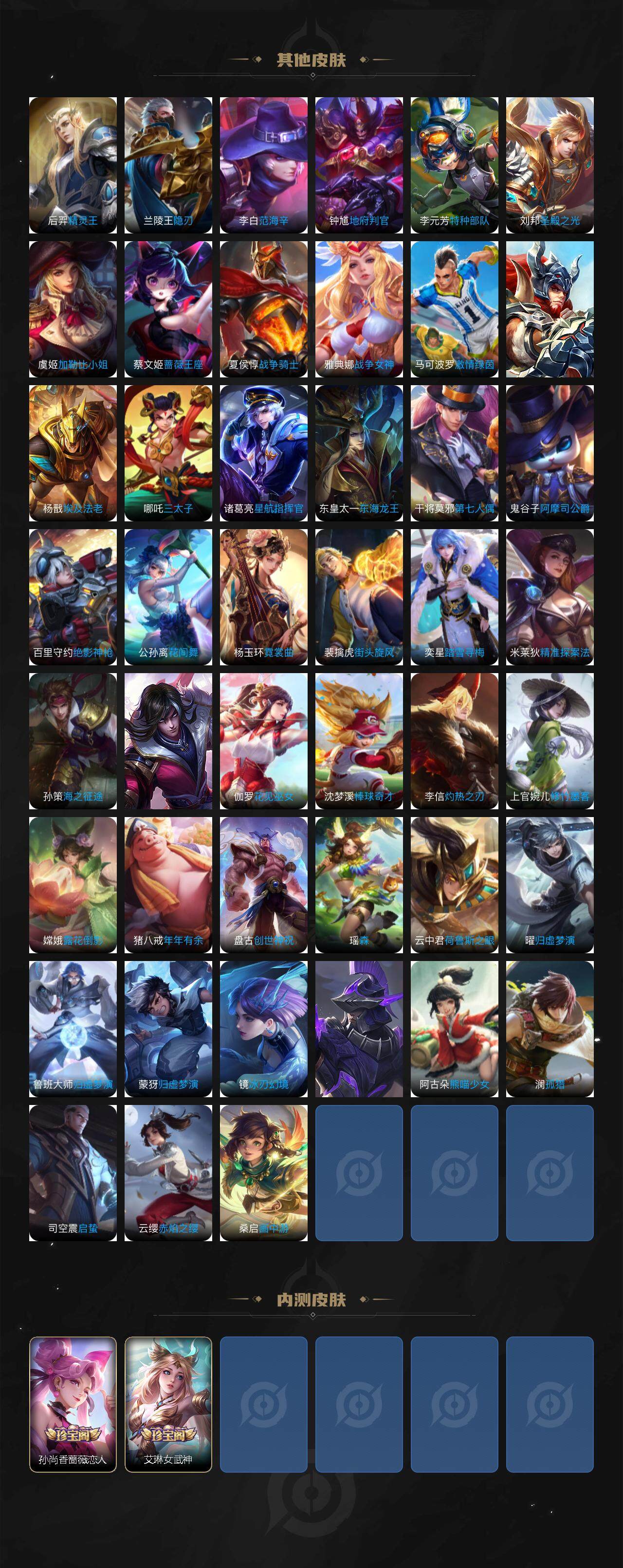 庄周蜃楼王,孙膑妖精王,扁鹊炼金王,虞姬凯尔特女王,白起狰,太乙真人饕餮,曹操烛龙,芈月重明,典韦穷奇,狂铁御狮,米莱狄御霄,牛魔御旌,盾山御銮,夏侯惇朔风刀,明世隐疑决卦,老夫子醍醐杖,鬼谷子原初探秘者,狄仁杰万华元夜,程咬金演武夺筹,钟馗驱傩正仪,苏烈千军破阵,吕布猎兽之王,嬴政白昼王子,女娲朔望之晖,典韦蓝屏警告,钟馗神迹守卫,鲁班七号狮舞东方,沈梦溪星空之诺,李元芳银河之约,刘邦夺宝奇兵,马可波罗暗影游猎,蒙犽狂想玩偶喵,元歌云间偶戏,弈星混沌棋,达摩沙漠行僧,兰陵王金庭之子,沈梦溪大漠名商,李元芳云中旅人,桑启海盐诗旅,裴擒虎擒涛扼浪,鲁班大师探海日志,张良古海寻踪,项羽苍威无极,镜青焰无极