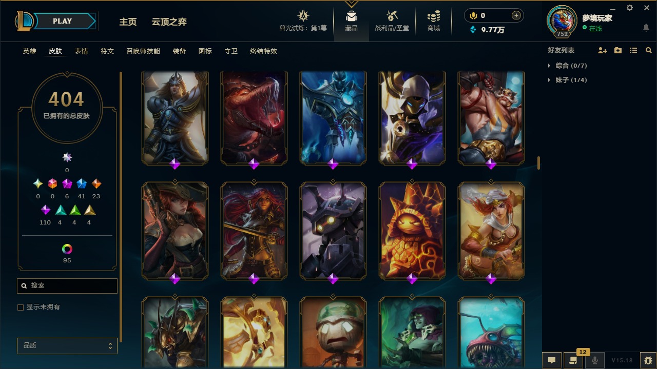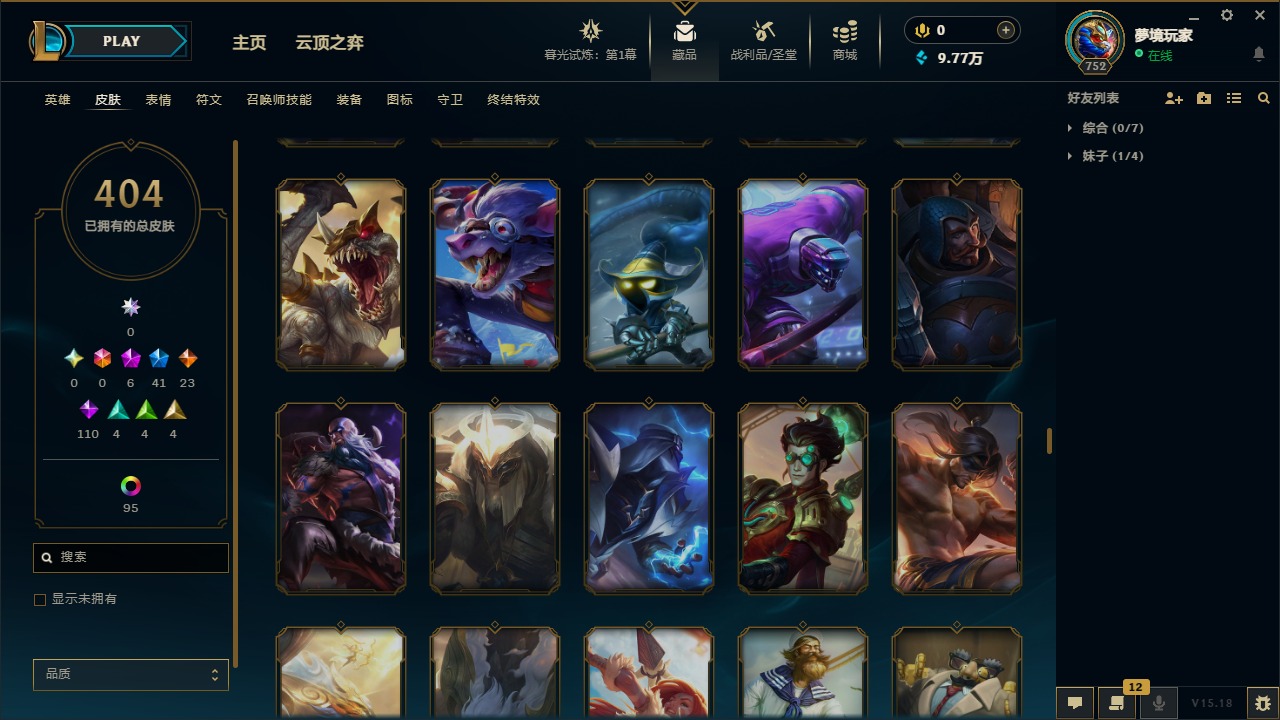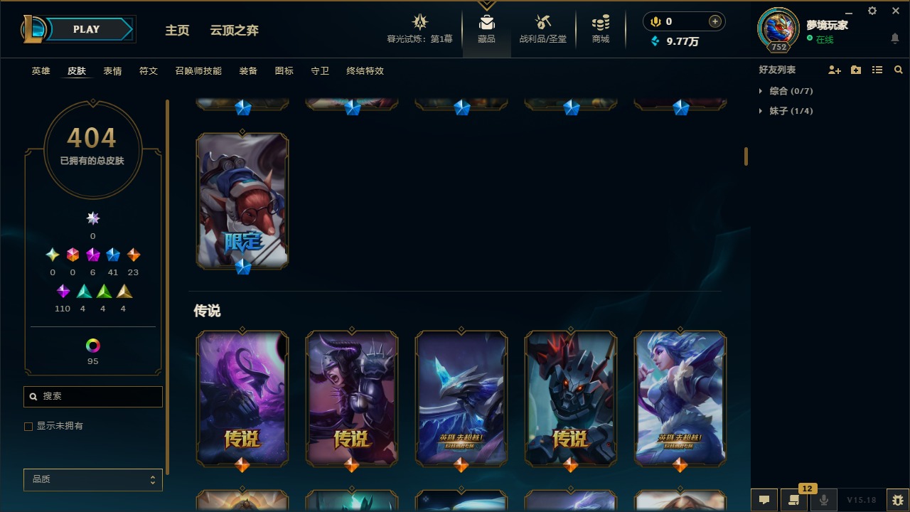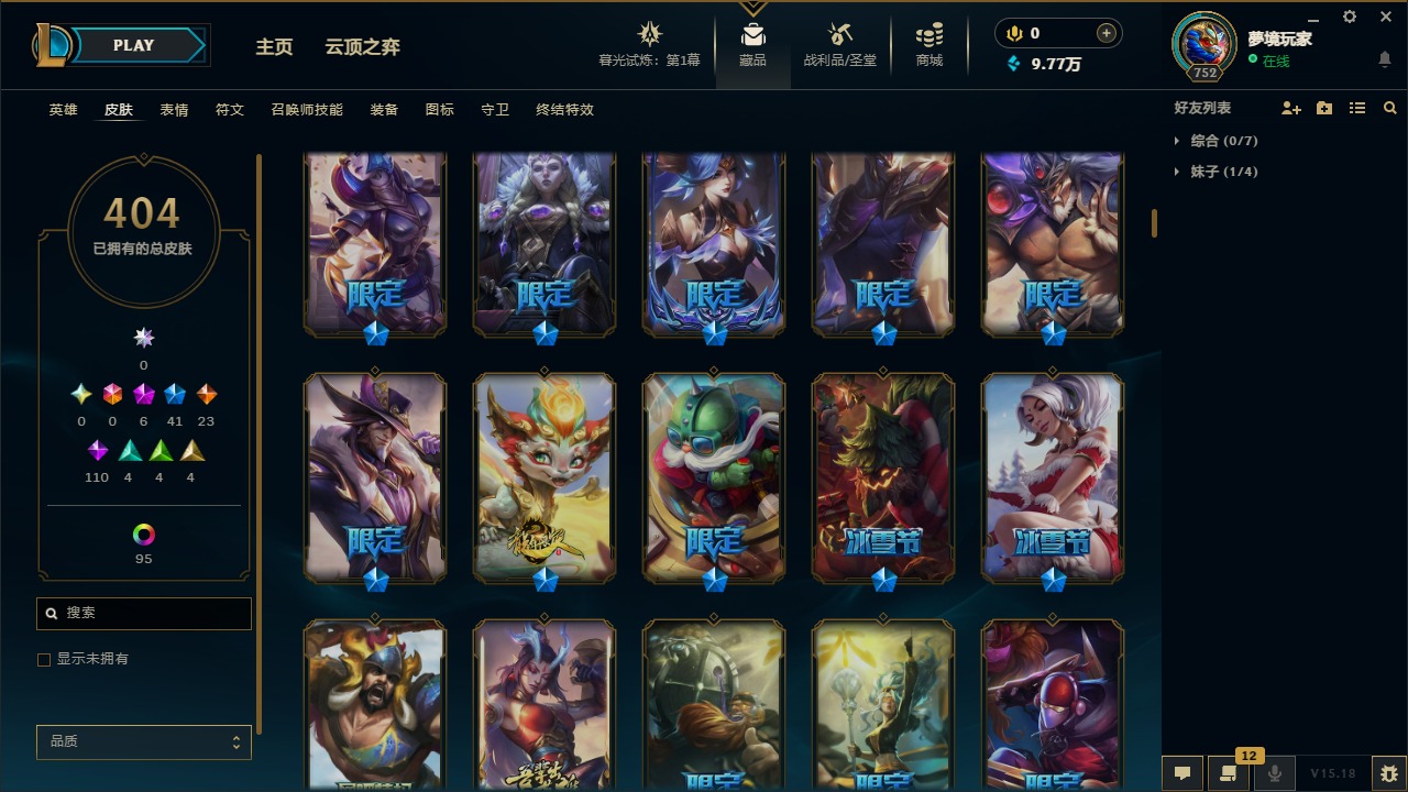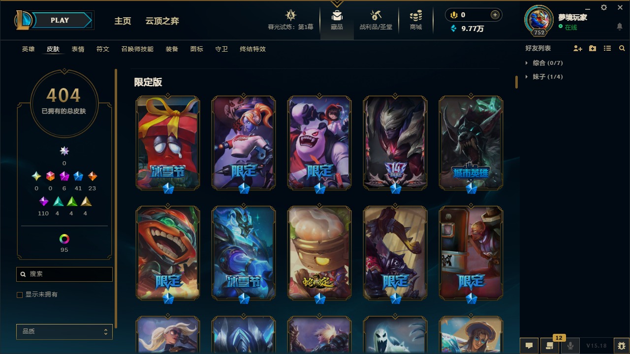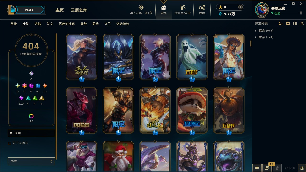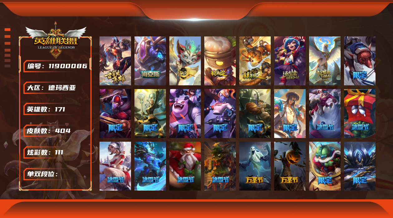 [11900086]6神话 41限定 23传说 110史诗 404皮肤 111炫彩 171英雄 可二次 可修改实名 优质装备:黎明使者 卡尔玛,源代码 乐芙兰,防爆天使 凯尔,暗影 沃里克,都铎王朝 图奇,防爆士兵 炼金,冠军掠夺者 卡兹克,冠军之刃 锐雯 2016,红桃杰克 崔斯特,警用试作体K-9 内瑟斯,密林猎手 提莫,野兽猎人 泰达米尔,奥德赛 吉格斯,吕布 奉先 炫金战神,冠军之刃 锐雯 2016 凯旋圣装,天煞 劫 恒星游历者,无畏骑士 瑟庄妮 赤子初心,外星装甲 库奇,可爱可爱粉红红 布里茨,净雪之月 莫甘娜 冬虹,墨之影武者 亚索 金墨耀影,十五周年纪念 希维尔,魔女 阿卡丽 虚荣,暗裔英雄 盖伦 海克斯:海克斯 克格莫 限定:玉剑传说 舞龙卫 赛季限定皮:胜利凤凰 艾尼维亚,胜利之运 崔斯特,胜利剑圣 易,胜利女神 娑娜,胜利巨口 克格莫,胜利之王 泰达米尔,胜利女神 奥利安娜,胜利之剑 剑魔,胜利女神 瑟庄妮 冠军限定系列:S1FNC 酒桶,S1FNC 迦娜,S2 暗杀星 发条,S2 暗杀星 努努,S3 SKT T1 劫,S4 SSW 图奇 冰雪节限定:北极星典狱长 锤石,“主人不要我了” 阿木木,魄罗骑士 瑟庄妮,圣诞老人 酒桶,冰雪节 茂凯,雪装 奈德丽 泳池派对:海之歌 永恩 万圣节限定:鬼影重重 魔腾,南瓜头 费德提克 年限:点心宝贝 阿木木,天龙之子 斯莫德,猴年 孙悟空 周年:10周年 安妮,10周年 凤凰