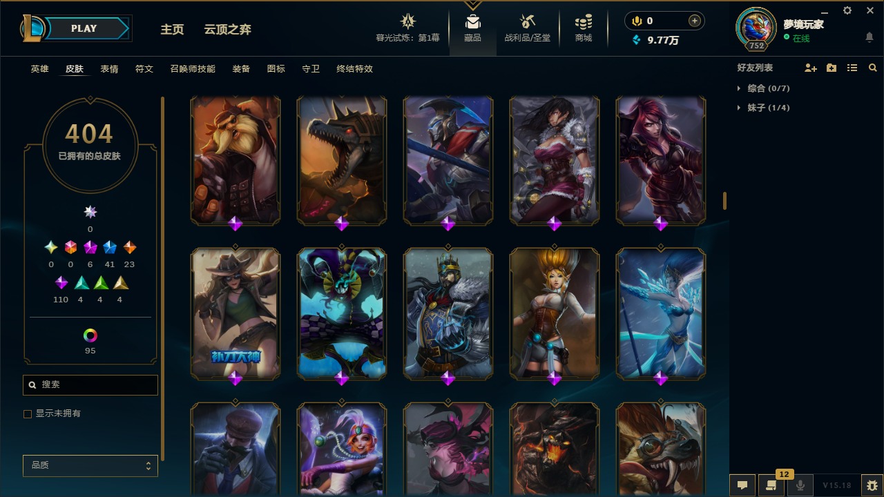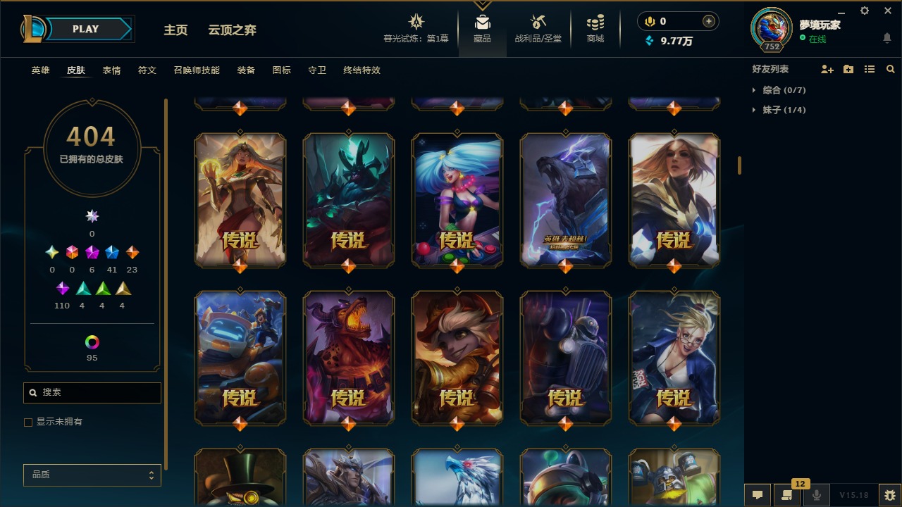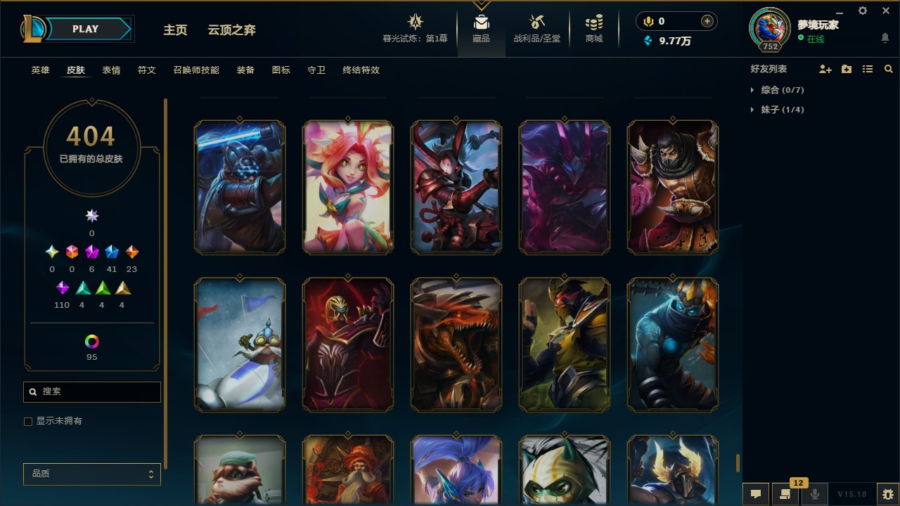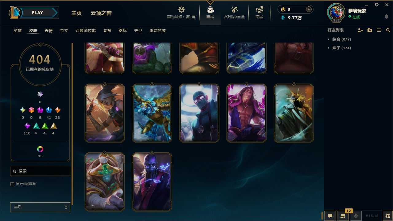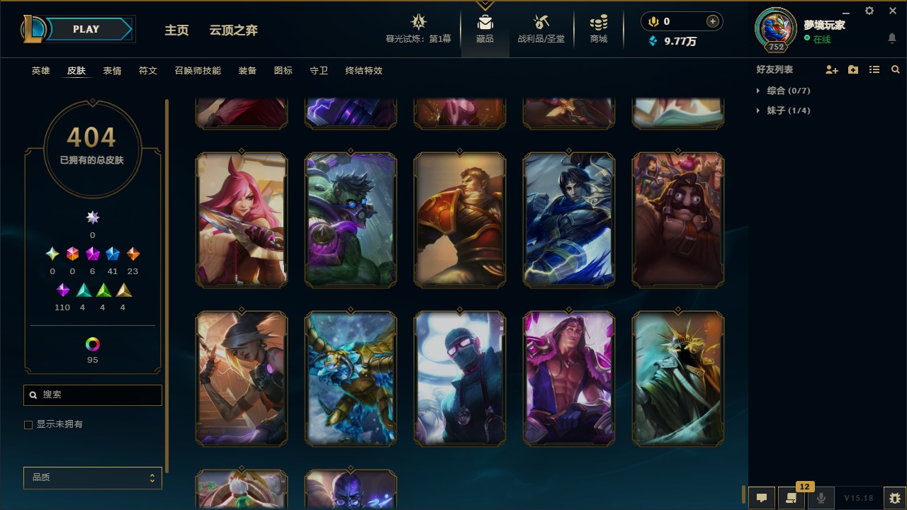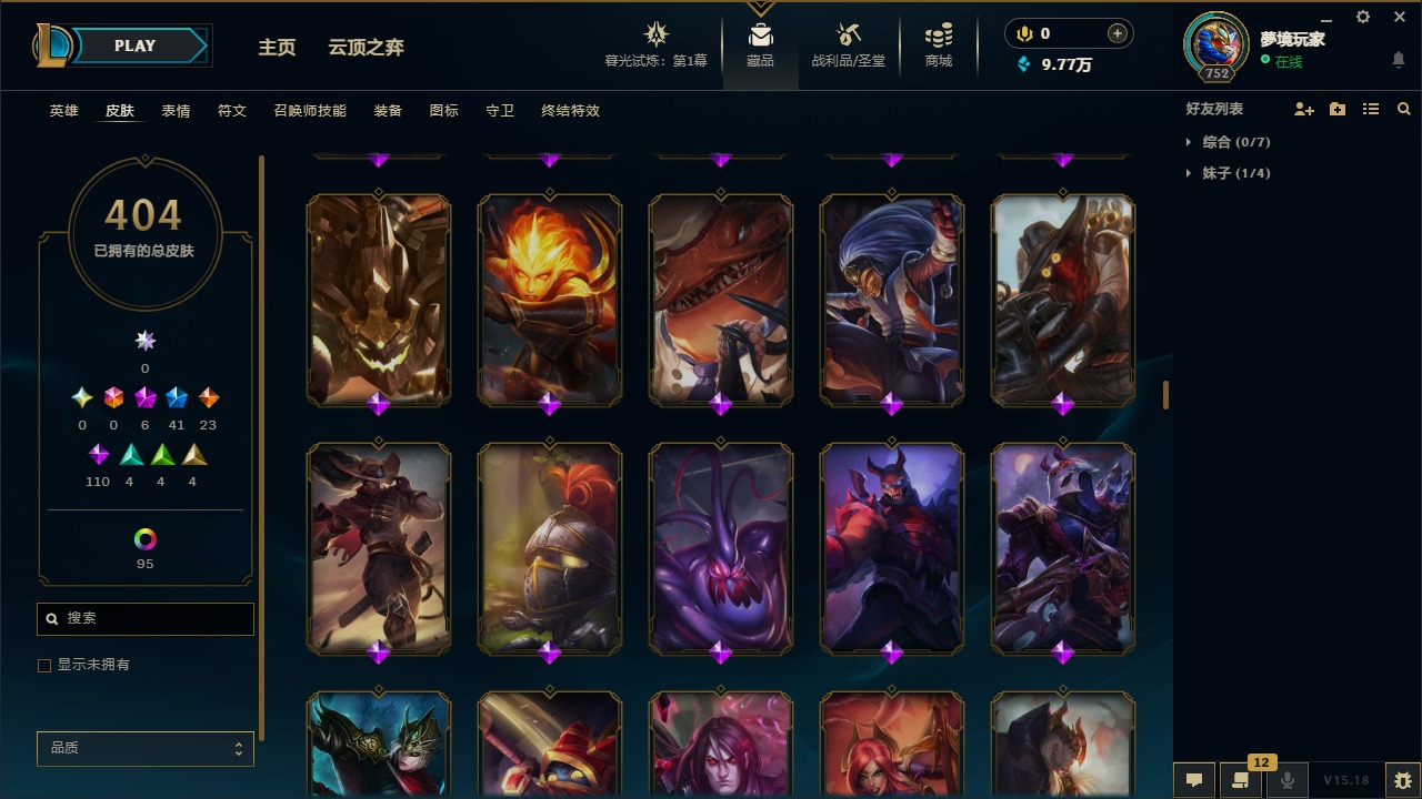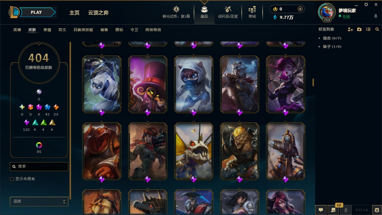 [11900086]6神话 41限定 23传说 110史诗 404皮肤 111炫彩 171英雄 可二次 可修改实名 优质装备:黎明使者 卡尔玛,源代码 乐芙兰,防爆天使 凯尔,暗影 沃里克,都铎王朝 图奇,防爆士兵 炼金,冠军掠夺者 卡兹克,冠军之刃 锐雯 2016,红桃杰克 崔斯特,警用试作体K-9 内瑟斯,密林猎手 提莫,野兽猎人 泰达米尔,奥德赛 吉格斯,吕布 奉先 炫金战神,冠军之刃 锐雯 2016 凯旋圣装,天煞 劫 恒星游历者,无畏骑士 瑟庄妮 赤子初心,外星装甲 库奇,可爱可爱粉红红 布里茨,净雪之月 莫甘娜 冬虹,墨之影武者 亚索 金墨耀影,十五周年纪念 希维尔,魔女 阿卡丽 虚荣,暗裔英雄 盖伦 海克斯:海克斯 克格莫 限定:玉剑传说 舞龙卫 赛季限定皮:胜利凤凰 艾尼维亚,胜利之运 崔斯特,胜利剑圣 易,胜利女神 娑娜,胜利巨口 克格莫,胜利之王 泰达米尔,胜利女神 奥利安娜,胜利之剑 剑魔,胜利女神 瑟庄妮 冠军限定系列:S1FNC 酒桶,S1FNC 迦娜,S2 暗杀星 发条,S2 暗杀星 努努,S3 SKT T1 劫,S4 SSW 图奇 冰雪节限定:北极星典狱长 锤石,“主人不要我了” 阿木木,魄罗骑士 瑟庄妮,圣诞老人 酒桶,冰雪节 茂凯,雪装 奈德丽 泳池派对:海之歌 永恩 万圣节限定:鬼影重重 魔腾,南瓜头 费德提克 年限:点心宝贝 阿木木,天龙之子 斯莫德,猴年 孙悟空 周年:10周年 安妮,10周年 凤凰