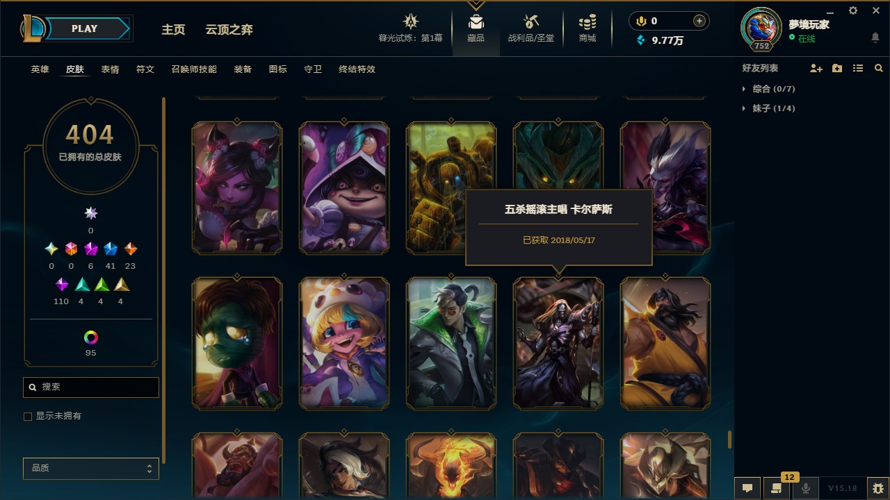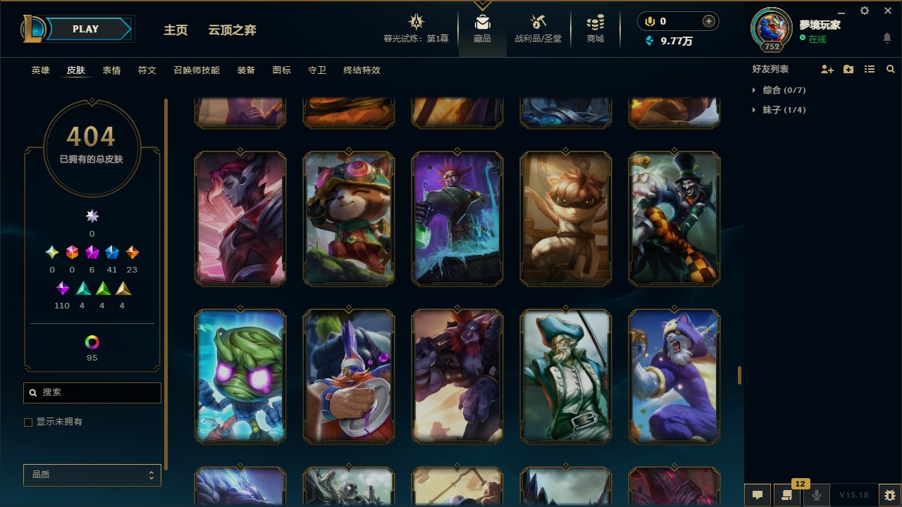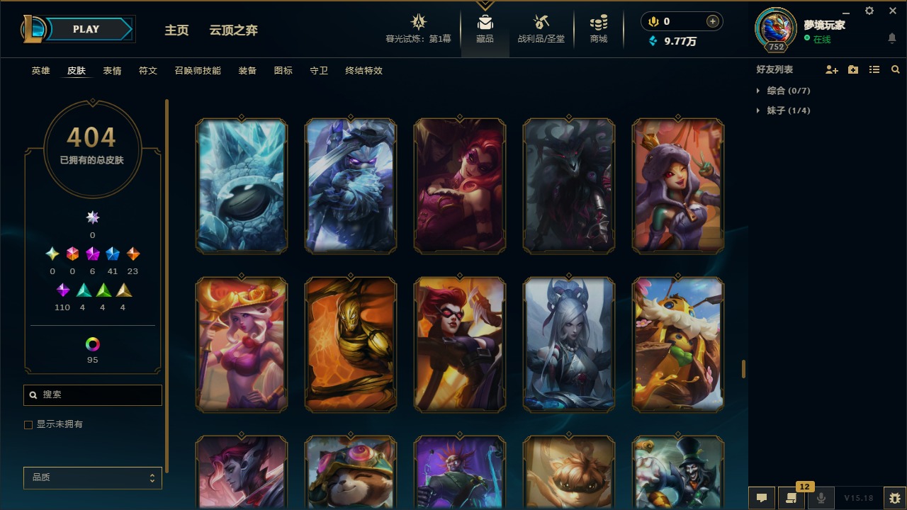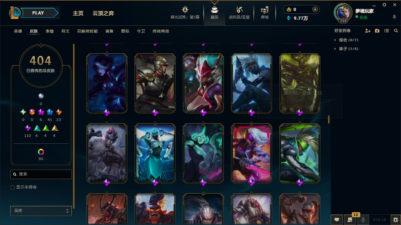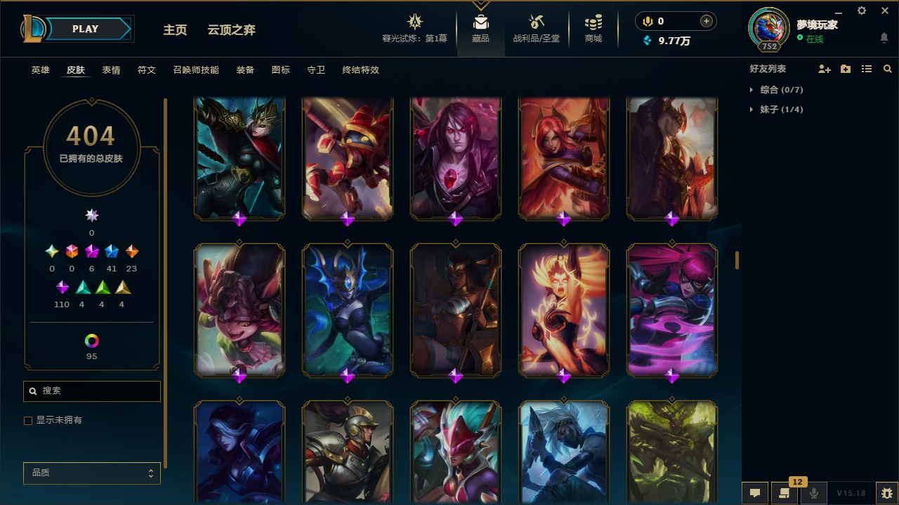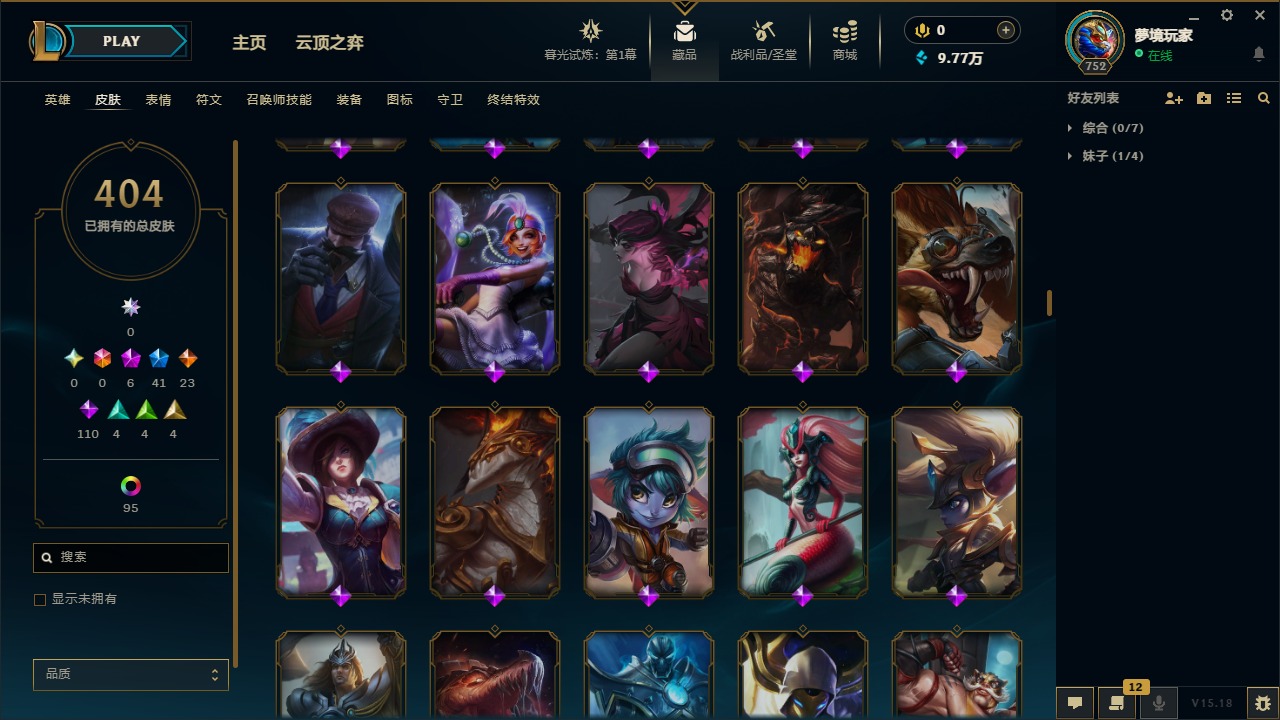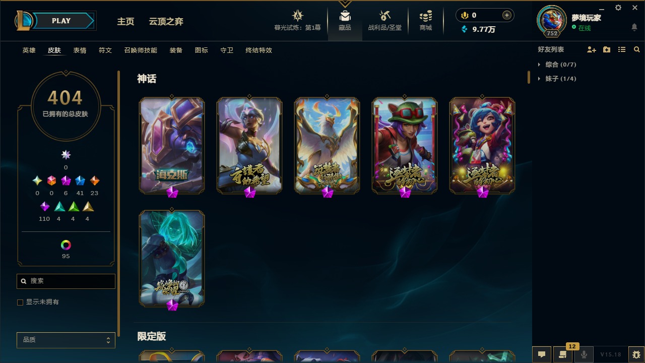 [11900086]6神话 41限定 23传说 110史诗 404皮肤 111炫彩 171英雄 可二次 可修改实名 优质装备:黎明使者 卡尔玛,源代码 乐芙兰,防爆天使 凯尔,暗影 沃里克,都铎王朝 图奇,防爆士兵 炼金,冠军掠夺者 卡兹克,冠军之刃 锐雯 2016,红桃杰克 崔斯特,警用试作体K-9 内瑟斯,密林猎手 提莫,野兽猎人 泰达米尔,奥德赛 吉格斯,吕布 奉先 炫金战神,冠军之刃 锐雯 2016 凯旋圣装,天煞 劫 恒星游历者,无畏骑士 瑟庄妮 赤子初心,外星装甲 库奇,可爱可爱粉红红 布里茨,净雪之月 莫甘娜 冬虹,墨之影武者 亚索 金墨耀影,十五周年纪念 希维尔,魔女 阿卡丽 虚荣,暗裔英雄 盖伦 海克斯:海克斯 克格莫 限定:玉剑传说 舞龙卫 赛季限定皮:胜利凤凰 艾尼维亚,胜利之运 崔斯特,胜利剑圣 易,胜利女神 娑娜,胜利巨口 克格莫,胜利之王 泰达米尔,胜利女神 奥利安娜,胜利之剑 剑魔,胜利女神 瑟庄妮 冠军限定系列:S1FNC 酒桶,S1FNC 迦娜,S2 暗杀星 发条,S2 暗杀星 努努,S3 SKT T1 劫,S4 SSW 图奇 冰雪节限定:北极星典狱长 锤石,“主人不要我了” 阿木木,魄罗骑士 瑟庄妮,圣诞老人 酒桶,冰雪节 茂凯,雪装 奈德丽 泳池派对:海之歌 永恩 万圣节限定:鬼影重重 魔腾,南瓜头 费德提克 年限:点心宝贝 阿木木,天龙之子 斯莫德,猴年 孙悟空 周年:10周年 安妮,10周年 凤凰