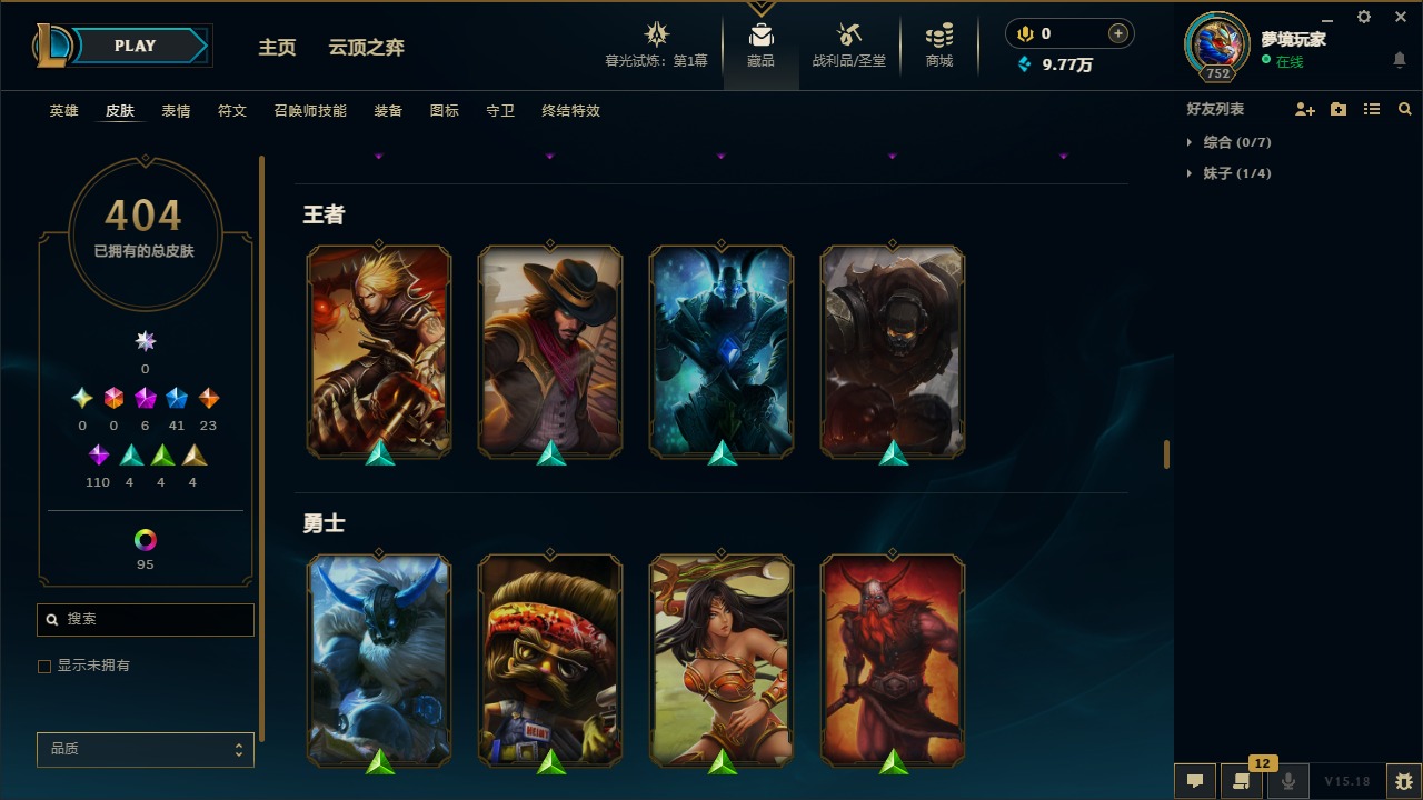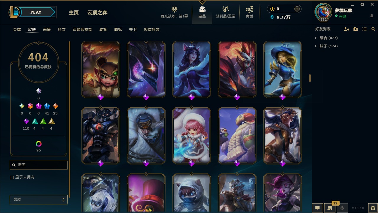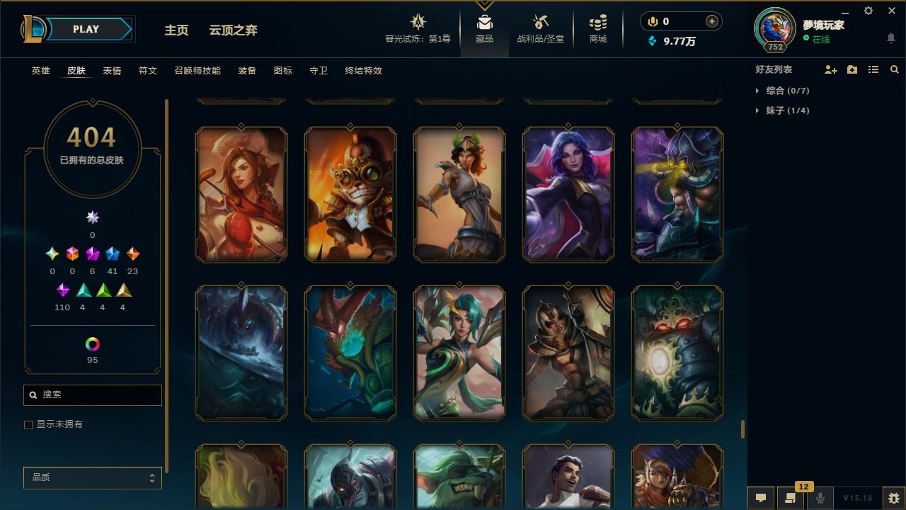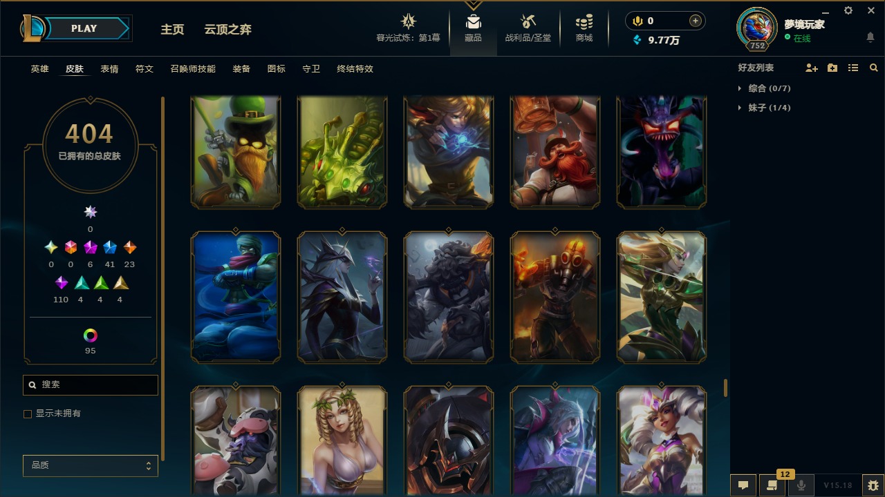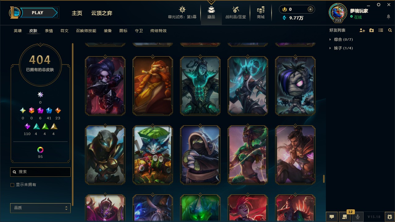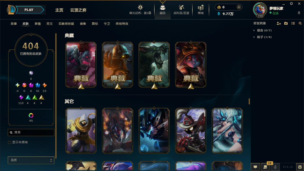 [11900086]6神话 41限定 23传说 110史诗 404皮肤 111炫彩 171英雄 可二次 可修改实名 优质装备:黎明使者 卡尔玛,源代码 乐芙兰,防爆天使 凯尔,暗影 沃里克,都铎王朝 图奇,防爆士兵 炼金,冠军掠夺者 卡兹克,冠军之刃 锐雯 2016,红桃杰克 崔斯特,警用试作体K-9 内瑟斯,密林猎手 提莫,野兽猎人 泰达米尔,奥德赛 吉格斯,吕布 奉先 炫金战神,冠军之刃 锐雯 2016 凯旋圣装,天煞 劫 恒星游历者,无畏骑士 瑟庄妮 赤子初心,外星装甲 库奇,可爱可爱粉红红 布里茨,净雪之月 莫甘娜 冬虹,墨之影武者 亚索 金墨耀影,十五周年纪念 希维尔,魔女 阿卡丽 虚荣,暗裔英雄 盖伦 海克斯:海克斯 克格莫 限定:玉剑传说 舞龙卫 赛季限定皮:胜利凤凰 艾尼维亚,胜利之运 崔斯特,胜利剑圣 易,胜利女神 娑娜,胜利巨口 克格莫,胜利之王 泰达米尔,胜利女神 奥利安娜,胜利之剑 剑魔,胜利女神 瑟庄妮 冠军限定系列:S1FNC 酒桶,S1FNC 迦娜,S2 暗杀星 发条,S2 暗杀星 努努,S3 SKT T1 劫,S4 SSW 图奇 冰雪节限定:北极星典狱长 锤石,“主人不要我了” 阿木木,魄罗骑士 瑟庄妮,圣诞老人 酒桶,冰雪节 茂凯,雪装 奈德丽 泳池派对:海之歌 永恩 万圣节限定:鬼影重重 魔腾,南瓜头 费德提克 年限:点心宝贝 阿木木,天龙之子 斯莫德,猴年 孙悟空 周年:10周年 安妮,10周年 凤凰