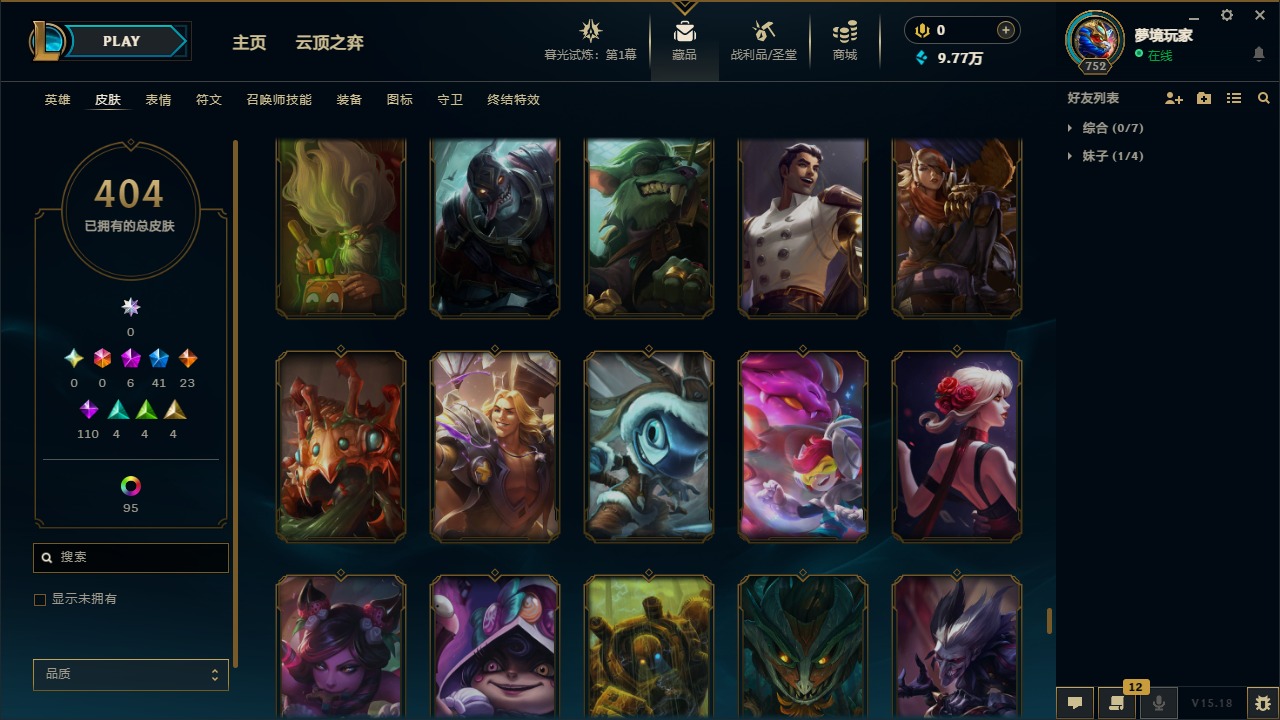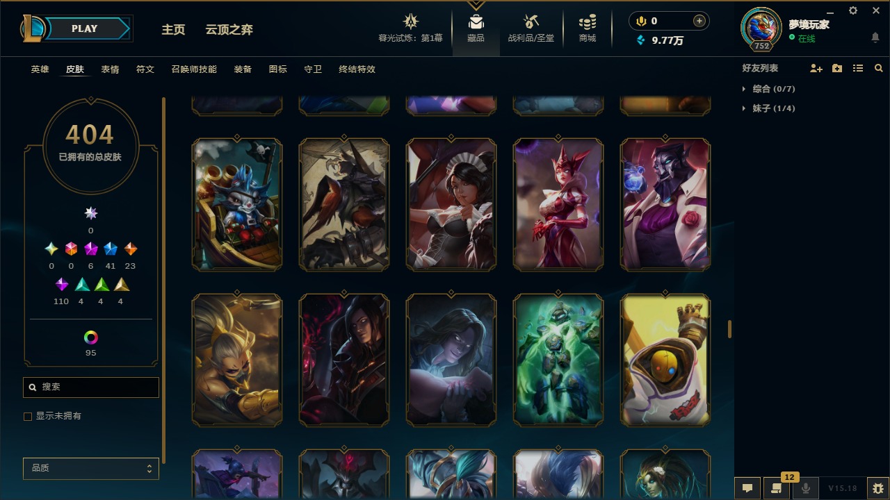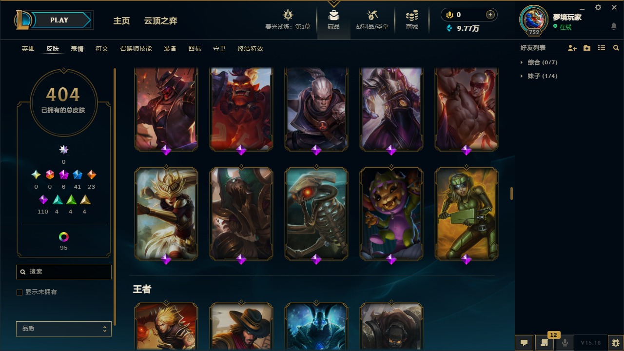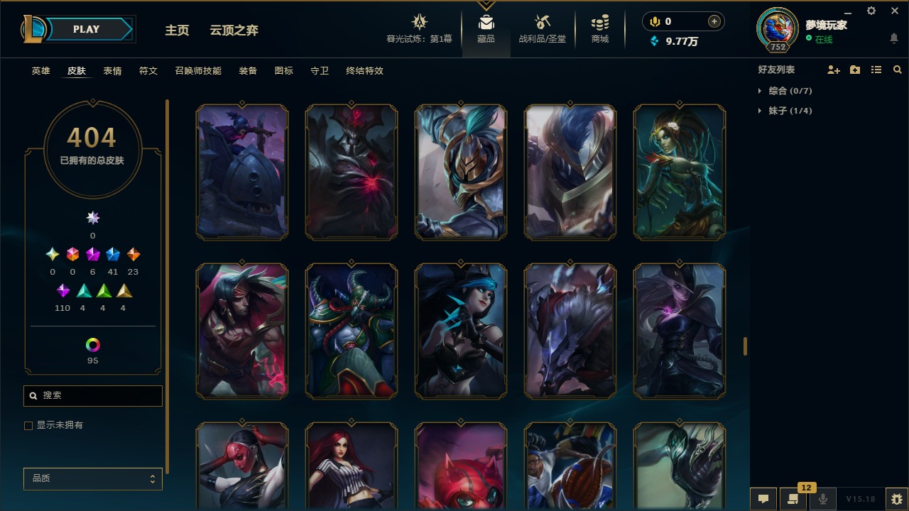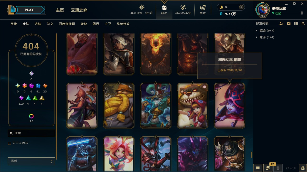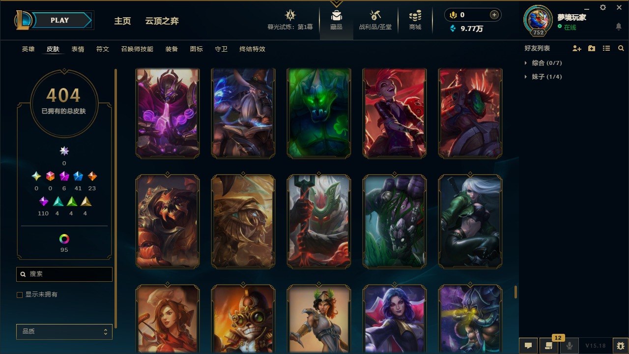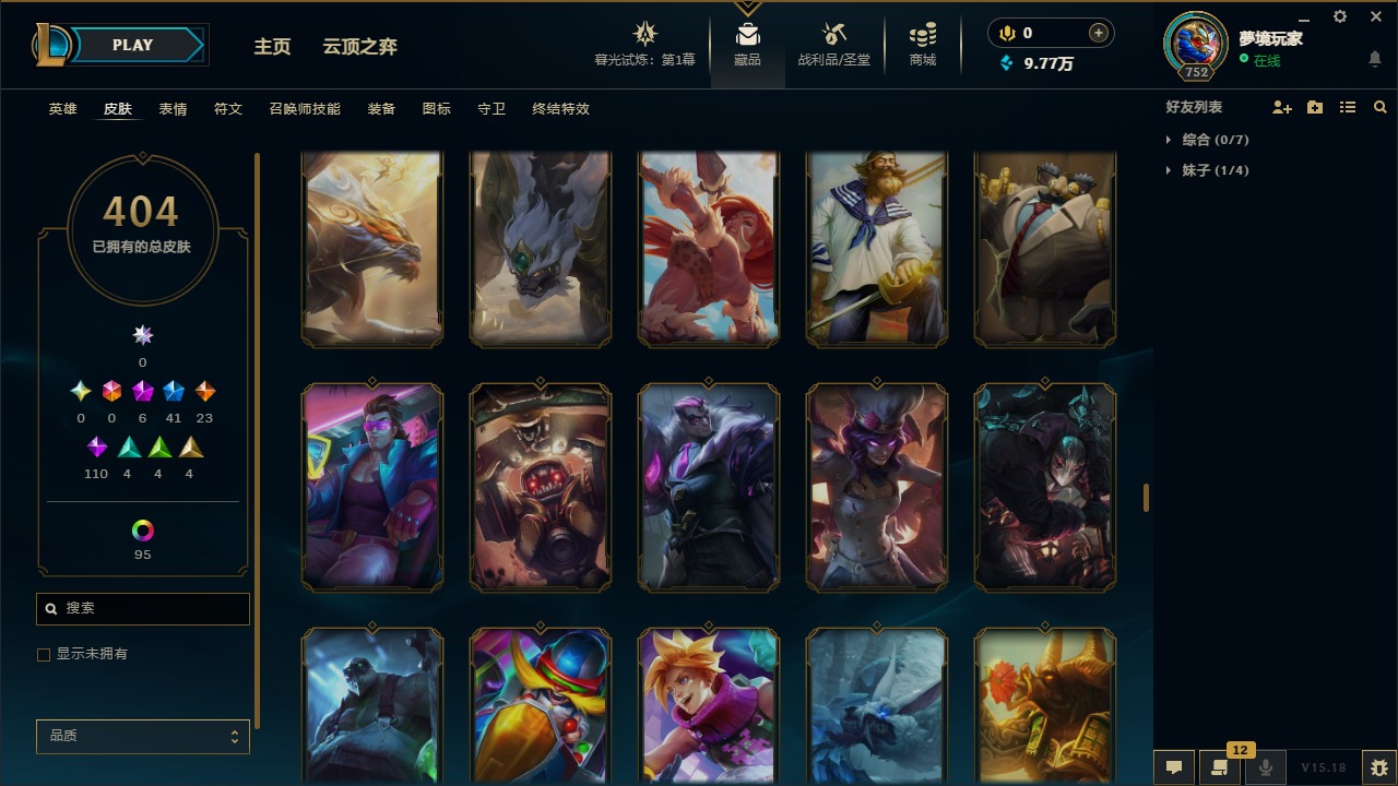 [11900086]6神话 41限定 23传说 110史诗 404皮肤 111炫彩 171英雄 可二次 可修改实名 优质装备:黎明使者 卡尔玛,源代码 乐芙兰,防爆天使 凯尔,暗影 沃里克,都铎王朝 图奇,防爆士兵 炼金,冠军掠夺者 卡兹克,冠军之刃 锐雯 2016,红桃杰克 崔斯特,警用试作体K-9 内瑟斯,密林猎手 提莫,野兽猎人 泰达米尔,奥德赛 吉格斯,吕布 奉先 炫金战神,冠军之刃 锐雯 2016 凯旋圣装,天煞 劫 恒星游历者,无畏骑士 瑟庄妮 赤子初心,外星装甲 库奇,可爱可爱粉红红 布里茨,净雪之月 莫甘娜 冬虹,墨之影武者 亚索 金墨耀影,十五周年纪念 希维尔,魔女 阿卡丽 虚荣,暗裔英雄 盖伦 海克斯:海克斯 克格莫 限定:玉剑传说 舞龙卫 赛季限定皮:胜利凤凰 艾尼维亚,胜利之运 崔斯特,胜利剑圣 易,胜利女神 娑娜,胜利巨口 克格莫,胜利之王 泰达米尔,胜利女神 奥利安娜,胜利之剑 剑魔,胜利女神 瑟庄妮 冠军限定系列:S1FNC 酒桶,S1FNC 迦娜,S2 暗杀星 发条,S2 暗杀星 努努,S3 SKT T1 劫,S4 SSW 图奇 冰雪节限定:北极星典狱长 锤石,“主人不要我了” 阿木木,魄罗骑士 瑟庄妮,圣诞老人 酒桶,冰雪节 茂凯,雪装 奈德丽 泳池派对:海之歌 永恩 万圣节限定:鬼影重重 魔腾,南瓜头 费德提克 年限:点心宝贝 阿木木,天龙之子 斯莫德,猴年 孙悟空 周年:10周年 安妮,10周年 凤凰