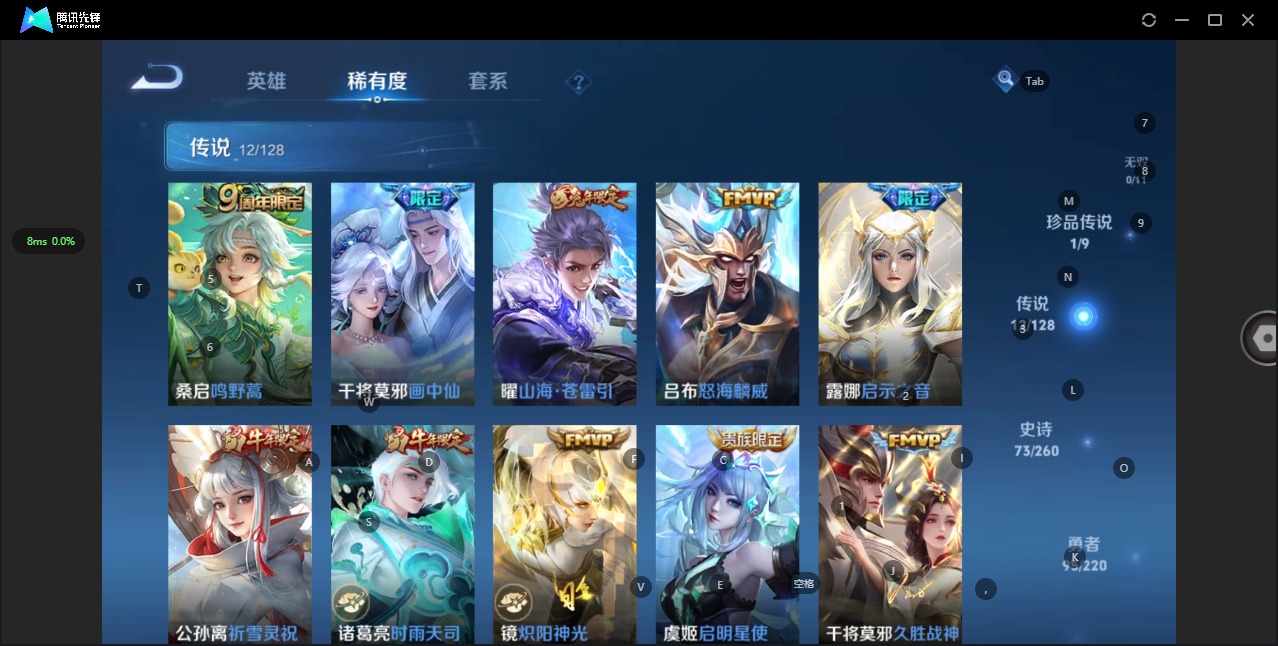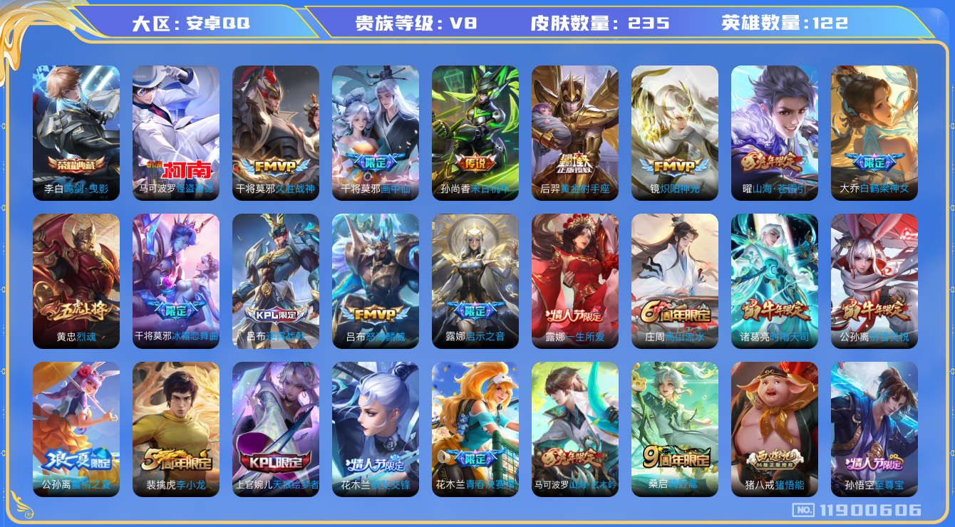 [11900606]V8 1典藏 1珍品传说 12传说 122英雄 235皮肤 可修改实名 优质装备:鸣剑·曳影,怪盗基德,黄金射手座,久胜战神,炽阳神光,末日机甲-孙尚香(绿蚂蚱),山海·苍雷引(电光曜子),画中仙 珍宝阁皮:优雅恋人,女武神 限定皮:逐霄战戟,鸣野蒿,至尊宝,傲雪梅枪,白鹤梁神女,时雨天司(水龙头),神威(电光马子),高山流水,怒海麟威,冰锋战神,烈魂,祈雪灵祝(雪兔子),天狼绘梦者,李小龙,霸王别姬-虞姬,默契交锋-花木兰,猪悟能,一生所爱,青春决赛季,冰霜恋舞曲,蜜橘之夏,启示之音,山海·玄木吟(马可年限) 史诗皮:紫霞仙子,电玩小子(小书包),白龙吟,黄金分割率,特工魅影,魅语,冰冠公主,偶像歌手,晚萤,百相守梦(刘备),百相守梦(关羽),末日机甲-吕布,时之恋人-孙尚香,乱世虎臣,修罗,水果甜心,绅士熊喵,天才门将,功夫厨神,德古拉伯爵,幽灵船长,鬼剑武藏,地狱岩魂,纤云弄巧,繁星吟游(呼啦呼啦),拒霜思,缤纷独角兽,乘风破浪,逐浪之夏,月团寄思,金属风暴,原初追逐者,圣诞狂欢,圣诞恋歌,鹰眼统帅,暗夜贵公子,魅力维加斯,黎明之约,赏金猎手