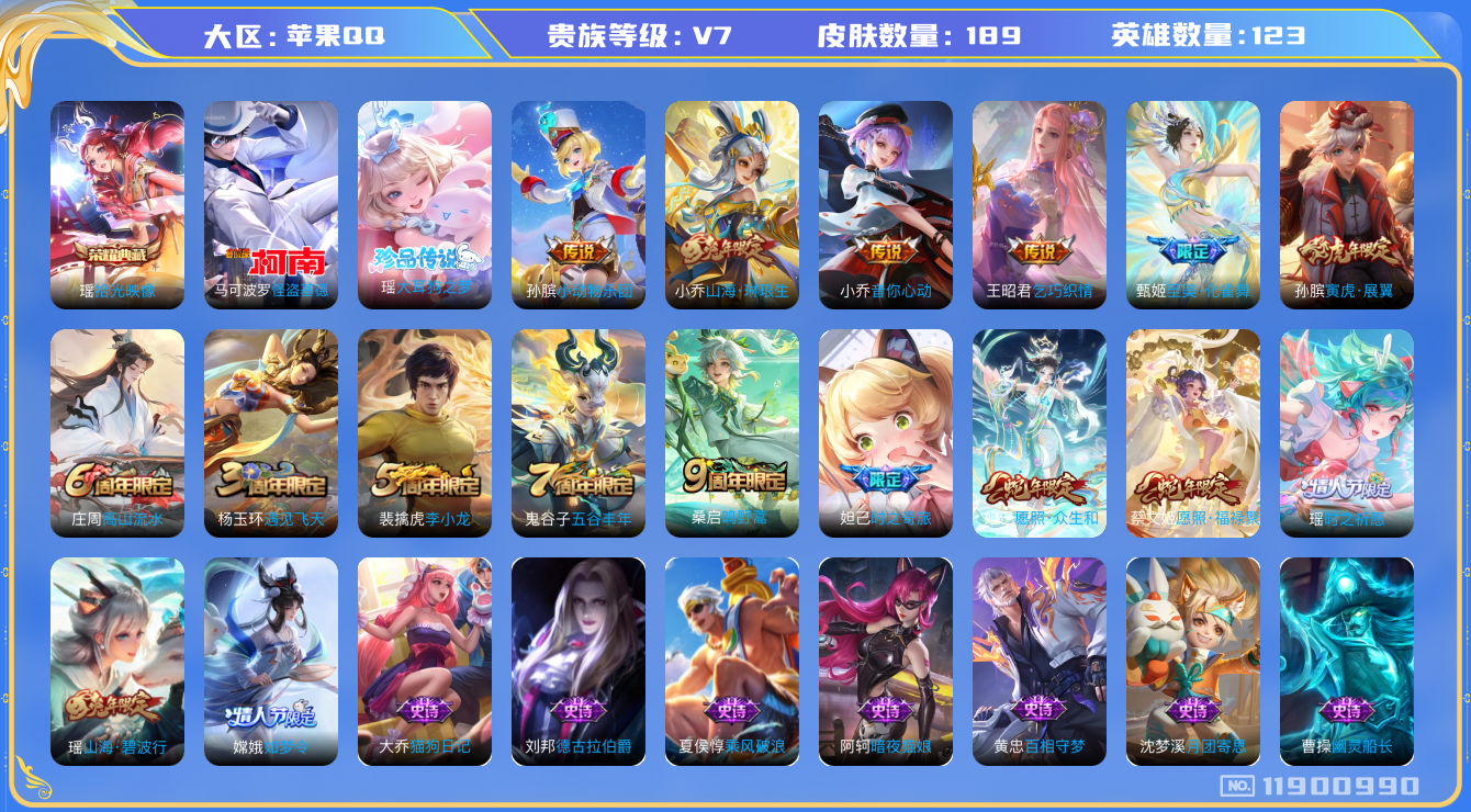 [11900990]V7 1典藏 2珍品传说 9传说 123英雄 189皮肤 可修改实名 优质装备:拾光映像(瑶典藏),怪盗基德,大耳狗之梦,音你心动-小乔,乞巧织情,山海·琳琅生(小乔年限),小动物乐团,涂山容容 珍宝阁皮:优雅恋人,女武神 限定皮:愿照·福禄聚(蔡文姬年限),愿照·众生和(妲己年限),鸣野蒿,寅虎·展翼(孙膑年限),山海·碧波行(瑶年限),至美·化雀舞,遇见飞天,高山流水,五谷丰年,李小龙,如梦令-嫦娥,时之祈愿-瑶(瑶传限),时之奇旅-妲己 史诗皮:星界战将,石田雨龙,茶境仙,幻珠鲛人,百相守梦-黄忠,织梦人,遇见神鹿,电玩小子(小书包),千年之狐,青蛇,偶像歌手,电玩·兔顽号,电玩·爆裂旋风,暗夜猫娘,猫狗日记-孙策,猫狗日记-大乔,乱世虎臣,女仆咖啡,水果甜心,绅士熊喵,天才门将,星夜王子,心灵骇客,德古拉伯爵,幽灵船长,鬼剑武藏,舞动绿茵,地狱岩魂,纤云弄巧,拒霜思,缤纷独角兽,乘风破浪,月团寄思,水晶猎龙者,金属风暴,原初追逐者,圣诞狂欢,鹰眼统帅,魅力维加斯,赏金猎手,未来纪元-赵云