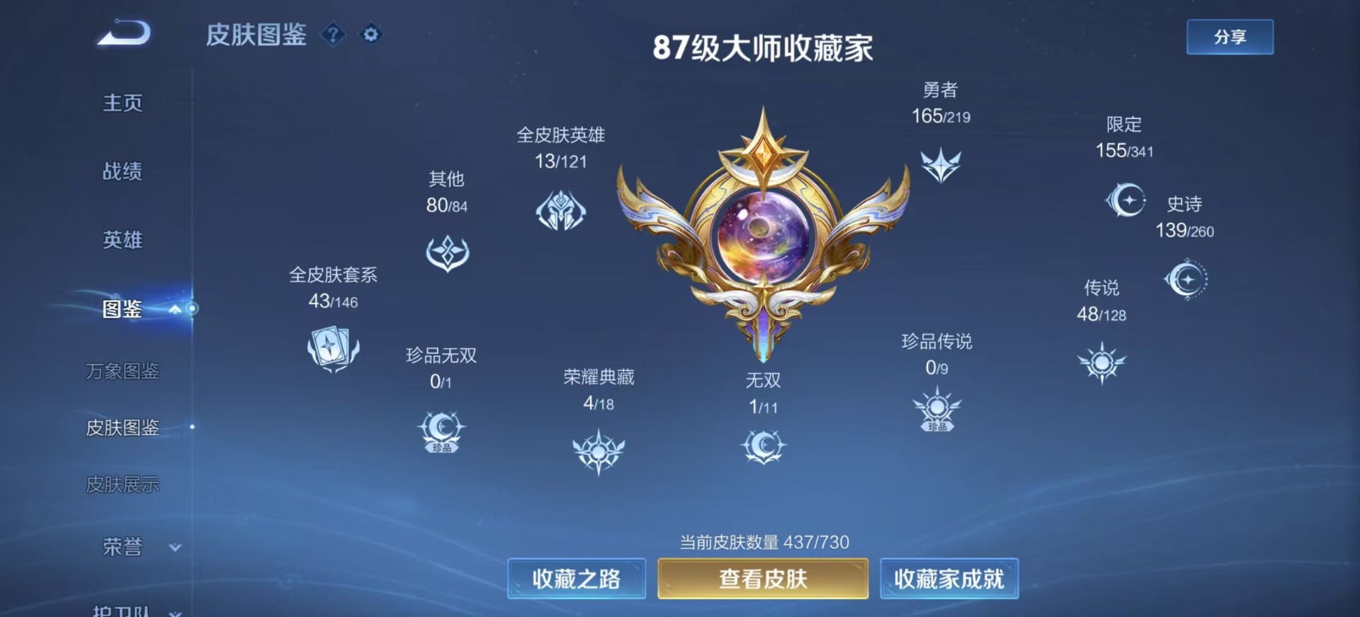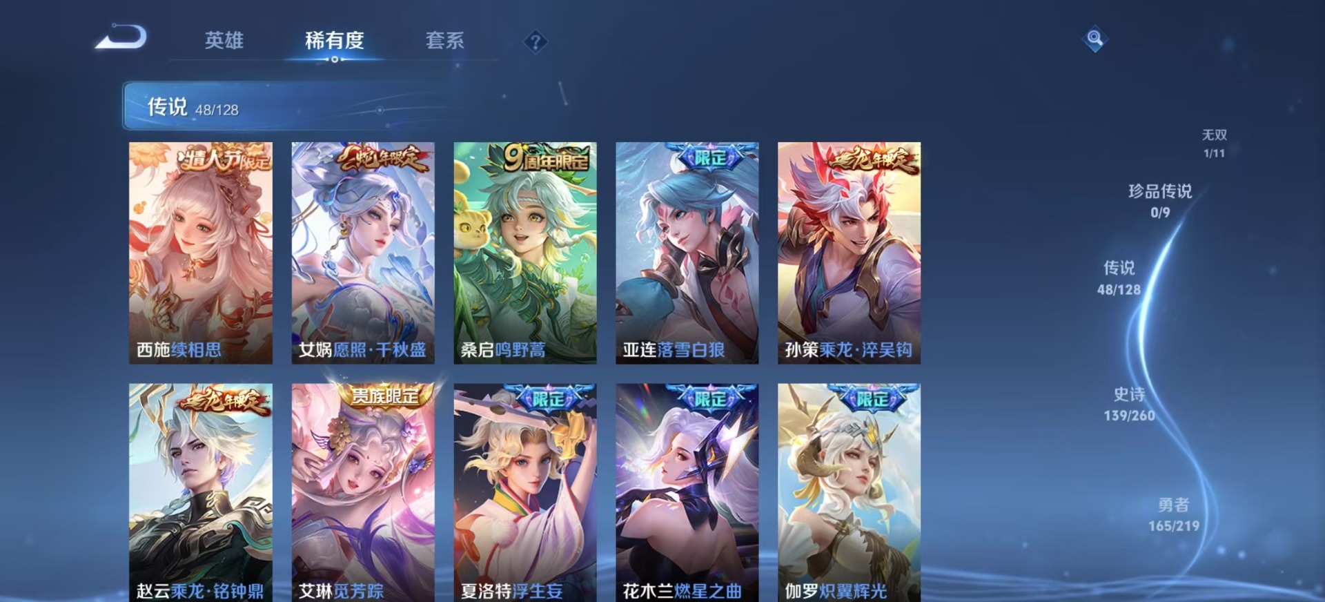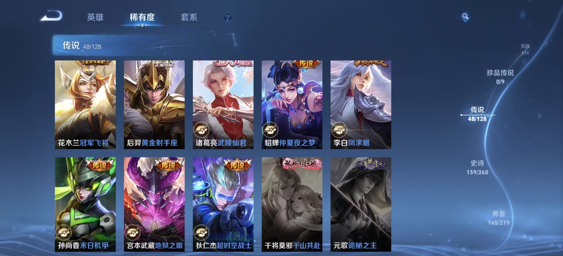 - PX_2023139-贵族等级: V5 英雄数: 53 皮肤数: 28 传说皮: 久胜战神,挚爱之约