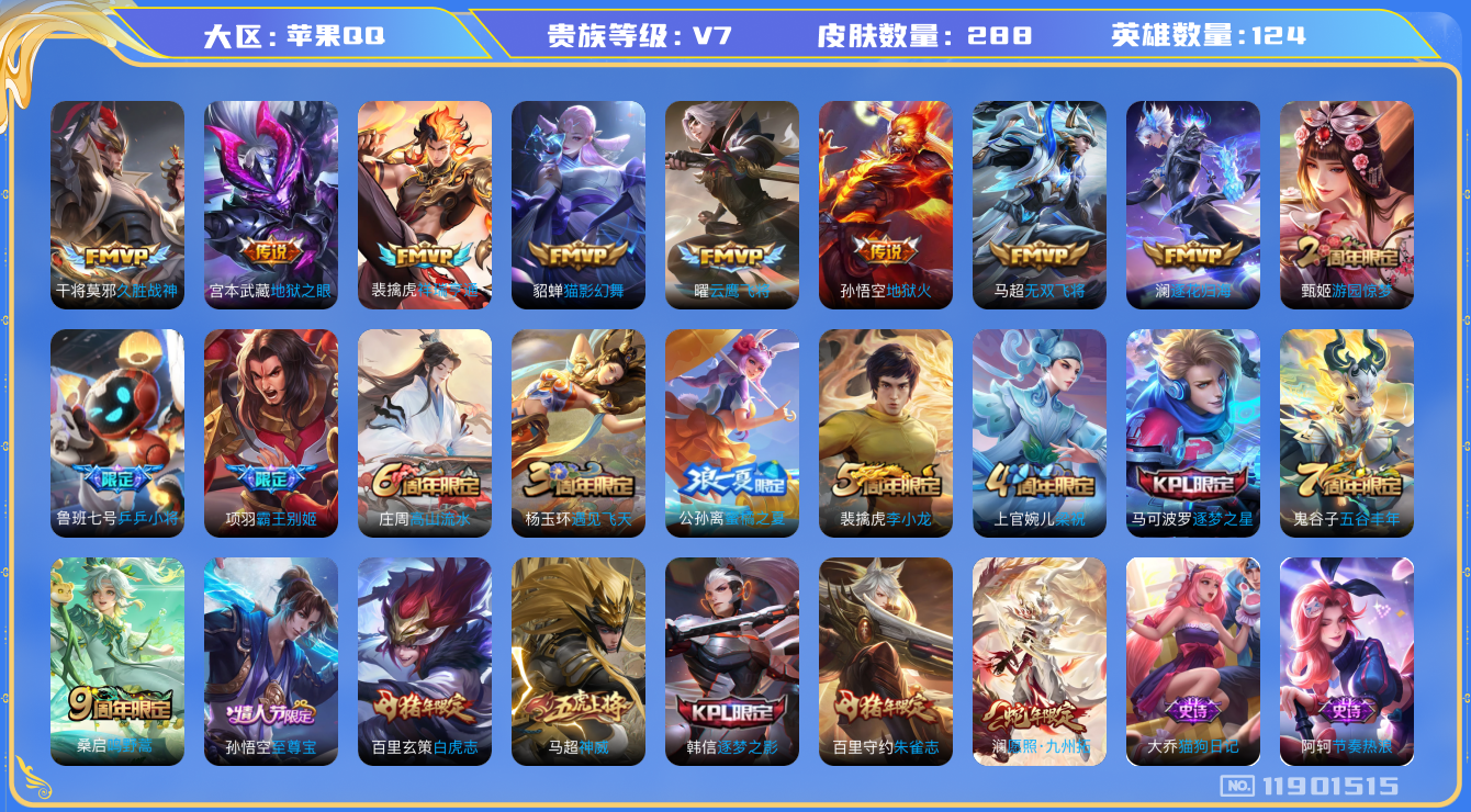 [11901515]V7 11传说 124英雄 288皮肤 可修改实名 优质装备:云鹰飞将(小将军),猫影幻舞,久胜战神,地狱火,地狱之眼,无双飞将,澜逐花归海 传说皮:祥瑞亨通 珍宝阁皮:妄想食味,玩趣恶龙 限定皮:愿照·九州拓(澜年限),鸣野蒿,至尊宝,白虎志(电光耗子),神威(电光马子),遇见飞天,高山流水,五谷丰年,游园惊梦,梁祝,逐梦之星,李小龙,逐梦之影,朱雀志(守约年限),霸王别姬-项羽,乒乒小将,蜜橘之夏 史诗皮:化蝶舞,星界战将,石田雨龙,怒海争锋,蒙犽顽岩魄,芈月浮光幕影,琥珀纪元伽罗,蔬乡物语(鲁班七号),百相守梦-黄忠,紫霞仙子,电玩小子(小书包),白龙吟,黄金分割率,特工魅影,千年之狐,江河有灵,百解令(蒙犽),蒙恬荣光圣徽,无限星赏官,冰冠公主,青蛇,偶像歌手,晚萤,电玩·爆裂旋风,猫狗日记-孙策,猫狗日记-大乔,时之恋人-孙尚香,乱世虎臣,节奏热浪,修罗,女仆咖啡,摇滚巨星,水果甜心,绅士熊喵,星夜王子,心灵骇客,暗隐猎兽者,幽灵船长,鬼剑武藏,舞动绿茵,纤云弄巧,繁星吟游(呼啦呼啦),拒霜思,缤纷独角兽,逐浪之夏,水晶猎龙者,曙光守护者,金属风暴,原初追逐者,圣诞狂欢,鹰眼统帅,黎明之约,无心