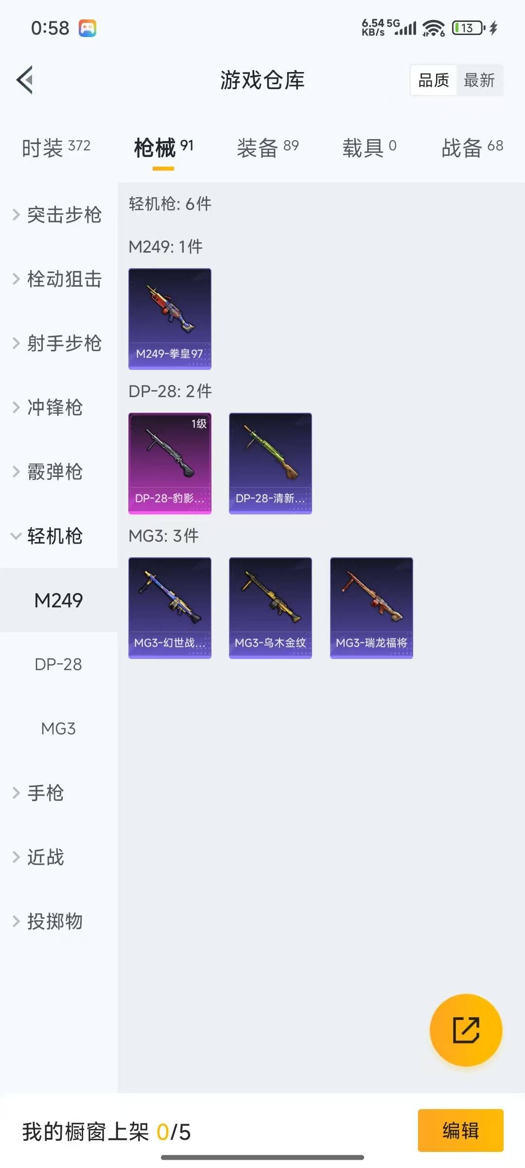 - [11297746]总资产:9 1近战传说 5传说枪械 高级安全箱(9.17到期) 可二次 可修改实名 烽火地带段位:钻石 全面战场段位:列兵 哈夫币:0 传说武器皮肤:近战-黑海,SMG45冲锋枪-骑士,QJB201轻机枪-黑海,复合弓-黑-天际线,M4A1突击步枪-蚀金玫瑰 史诗武器皮肤:QBZ95-1突击步枪-ACE,M4A1突击步枪-特勤执行,SKS射手步枪-ACE,PKM通用机枪-蝮蛇,PKM通用机枪-荒野求生,M700狙击步枪-守夜人,MP5冲锋枪-深海恐惧,勇士冲锋枪-深海恐惧,AKM突击步枪-林中猎手,SVD狙击步枪-暗夜猎手,M1014霰弹枪-林中猎手,PSG-1射手步枪-无垢,SV-98狙击步枪-囚徒,QBZ95-1突击步枪-曙光,沙漠之鹰-曙光,M700狙击步枪-竞技风