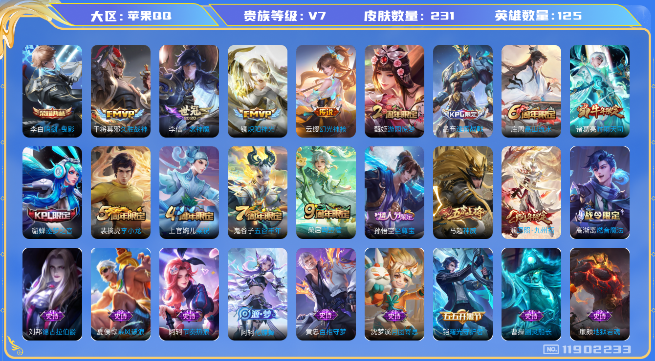 [11902233]V7 1典藏 7传说 125英雄 231皮肤 可修改实名 优质装备:鸣剑·曳影,久胜战神,炽阳神光,一念神魔,涂山容容 传说皮:幻光神枪 珍宝阁皮:万物之道,蔷薇恋人,女武神,玩趣恶龙 限定皮:愿照·九州拓(澜年限),逐霄战戟,鸣野蒿,至尊宝,时雨天司(水龙头),神威(电光马子),高山流水,五谷丰年,游园惊梦,梁祝,逐梦之音,李小龙 史诗皮:化蝶舞,星界战将,石田雨龙,茶境仙,琥珀纪元伽罗,百相守梦-黄忠,苍穹之光,电玩小子(小书包),黄金分割率,特工魅影,江河有灵,高渐离燃音魔法,蒙恬荣光圣徽,冰冠公主,晚萤,末日机甲-吕布,猫狗日记-孙策,节奏热浪,摇滚巨星,水果甜心,天才门将,星夜王子,德古拉伯爵,暗隐猎兽者,幽灵船长,鬼剑武藏,地狱岩魂,纤云弄巧,乘风破浪,逐浪之夏,月团寄思,水晶猎龙者,曙光守护者,原初追逐者,圣诞狂欢,圣诞恋歌,鹰眼统帅,黎明之约,未来纪元-赵云