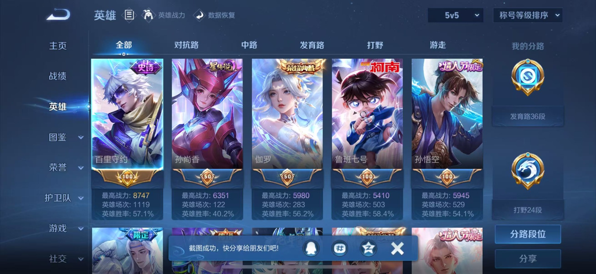 - [11520227]V7 1典藏 2珍品传说 6传说 121英雄 203皮肤 可修改实名 荣耀水晶:银白咏叹调(倪克斯侍卫) 珍品传说:酷洛米之心,黑崎一护 传说皮:地狱之眼,炽阳神光,乞巧织情 珍宝阁皮:蔷薇恋人 限定皮:愿照·九州拓(澜年限),愿照·山河定(司空震年限),逐霄战戟,鸣野蒿,梁祝,引擎之心 史诗皮:茶境仙,糖绘人间,鸭鸭历险记-刘禅,龙之律动,雪豹·霜爪,藏狐·褐绒,石田雨龙,百相守梦-百里守约,百相守梦-黄忠,埋骨钱,乘龙·聚宝船(安琪拉年限),炽弈燎原,化蝶舞,破空之剑,电玩小子(小书包),白龙吟,黄金分割率,特工魅影,千年之狐,江河有灵,高渐离燃音魔法,百解令(蒙犽),冰冠公主,青蛇,偶像歌手,电玩·爆裂旋风,末日机甲-吕布,猫狗日记-孙策,猫狗日记-大乔,时之恋人-孙尚香,乱世虎臣,节奏热浪,女仆咖啡,水果甜心,绅士熊喵,星夜王子,心灵骇客,暗隐猎兽者,幽灵船长,鬼剑武藏,心灵战警,舞动绿茵,纤云弄巧,拒霜思,缤纷独角兽,乘风破浪,逐浪之夏,水晶猎龙者,箭羽风息,金属风暴,圣诞恋歌,鹰眼统帅,魅力维加斯,未来纪元-赵云
