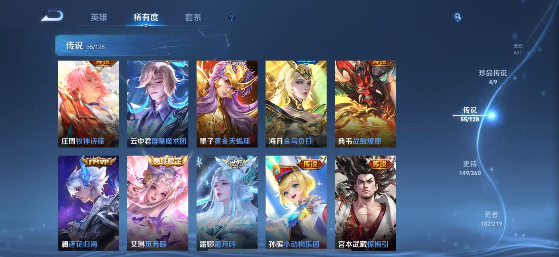 刘备时之恋人,铠绛天战甲,孙膑小动物乐团,赵云淬星耀世,干将莫邪久胜战神,典韦战鼓燎原,干将莫邪画中仙,李信一念神魔,孙策末日机甲,达摩黄金狮子座,海月金乌负日,王昭君乞巧织情,露娜霜月吟,庄周牧神诗旅,镜炽阳神光,公孙离记忆之芯,宫本武藏惊梅引,裴擒虎祥瑞亨通,貂蝉猫影幻舞,艾琳觅芳踪,嬴政玄雷天君,张良黄金白羊座,曜云鹰飞将,马超无双飞将,云中君群星魔术团,墨子黄金天蝎座,澜逐花归海,虞姬云霓雀翎