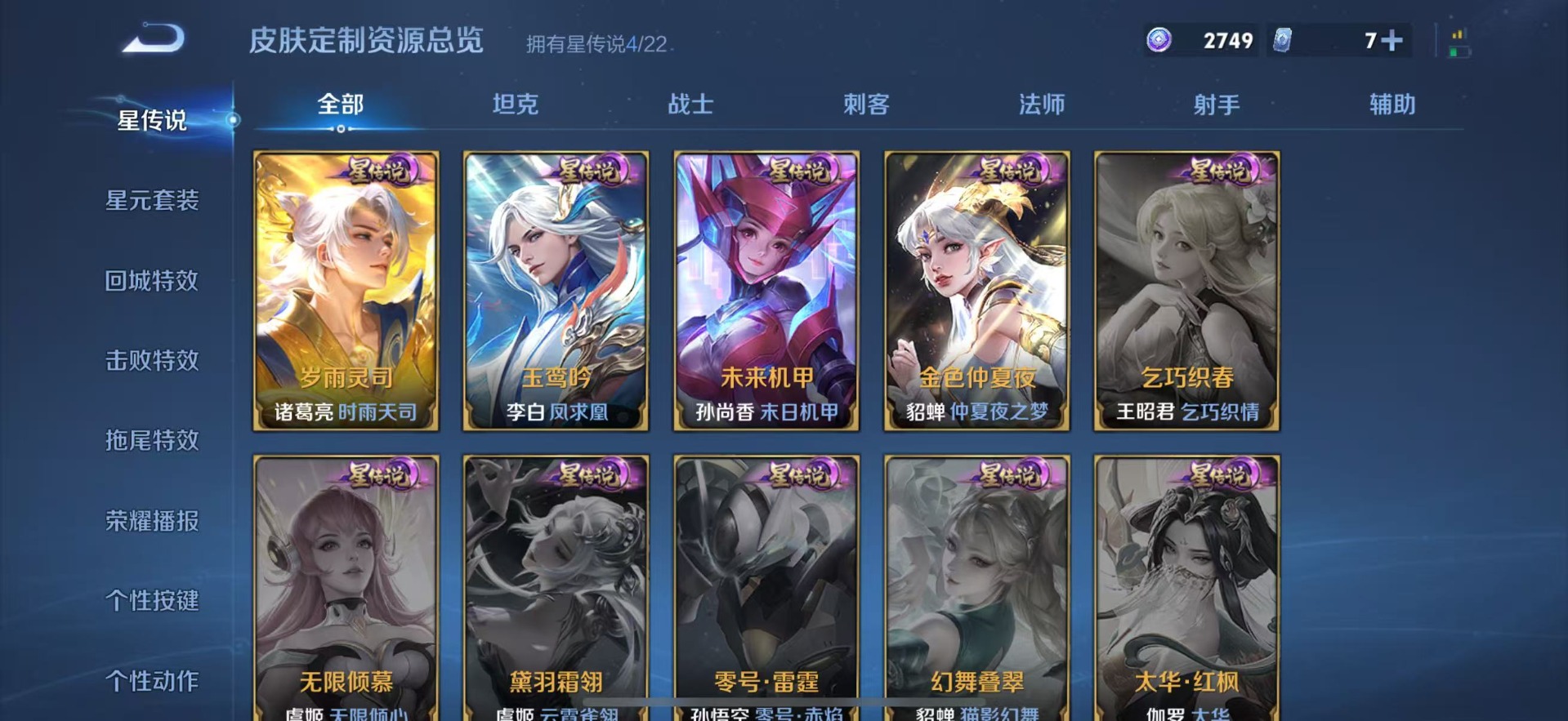 伽罗天狼溯光者,赵云百木心枪,孙尚香异界灵契,镜匿光追影者,诸葛亮时雨天司,司空震愿照·山河定,裴擒虎李小龙,上官婉儿梁祝,上官婉儿神器·万象笔,李白诗剑行,艾琳陌上桑,桑启鸣野蒿,孙悟空孙行者,孙悟空大圣娶亲,孙悟空至尊宝,芈月白晶晶,马超神威,赵云引擎之心,妲己愿照·众生和,韩信傲雪梅枪,韩信逐梦之影,百里守约朱雀志,澜愿照·九州拓,虞姬霸王别姬,虞姬愿照·岁时盈,王昭君映山客