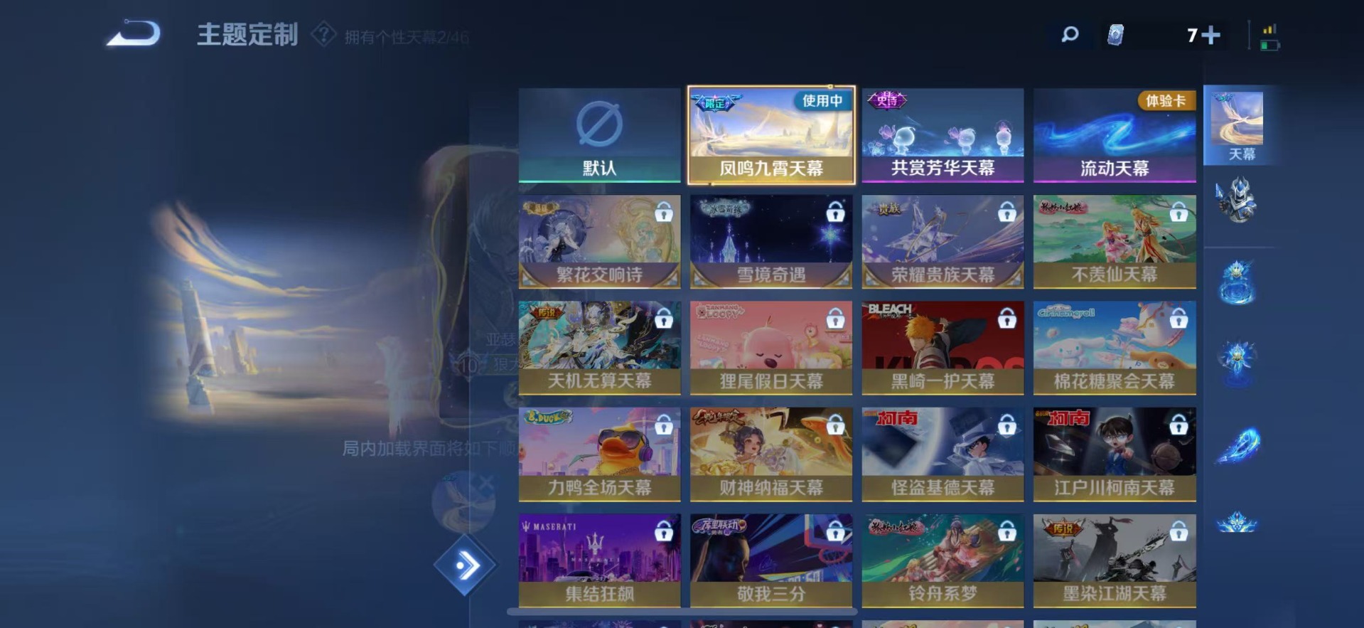 夏侯惇朔风刀,老夫子醍醐杖,沈梦溪星空之诺,沈梦溪大漠名商,盾山御銮,苏烈千军破阵,典韦穷奇,典韦蓝屏警告,达摩沙漠行僧,牛魔御旌,项羽苍威无极,吕布猎兽之王,镜青焰无极,元歌云间偶戏,兰陵王金庭之子,裴擒虎擒涛扼浪,鲁班大师探海日志,明世隐疑决卦,蒙犽狂想玩偶喵,马可波罗暗影游猎,鬼谷子原初探秘者,张良古海寻踪,桑启海盐诗旅,狄仁杰万华元夜,芈月重明,程咬金演武夺筹,李元芳银河之约,李元芳云中旅人,弈星混沌棋,米莱狄御霄,钟馗神迹守卫,钟馗驱傩正仪