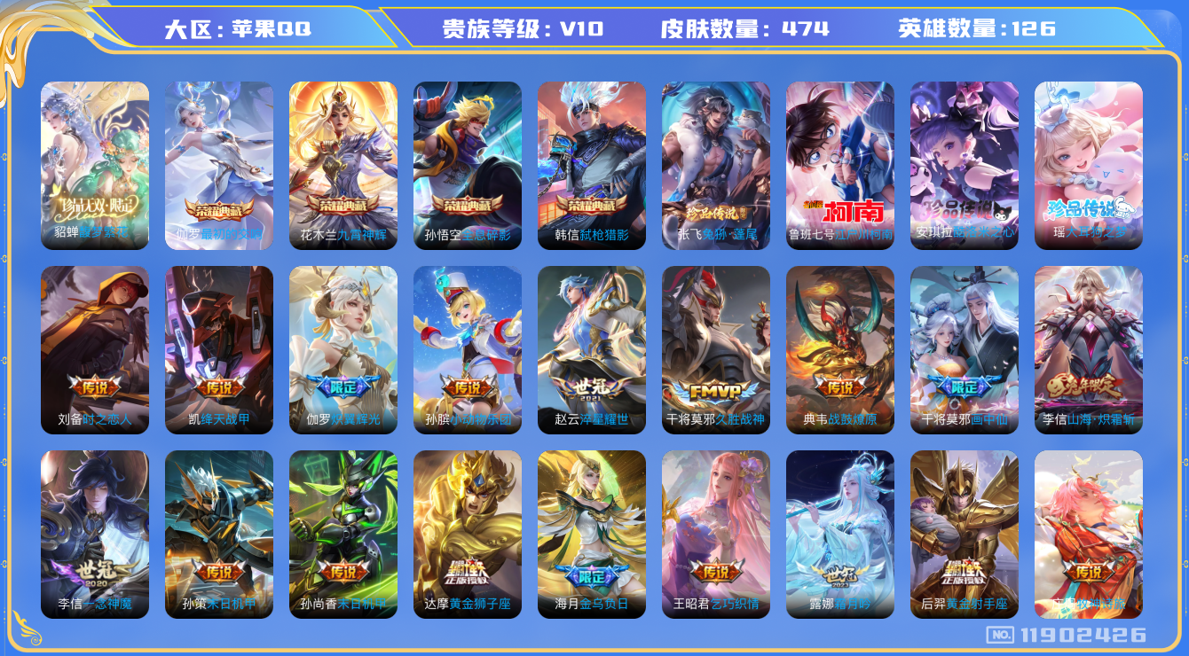 [11902426]V10 4典藏 1珍品无双 4珍品传说 55传说 126英雄 474皮肤 典藏英雄武则天 可修改实名 优质装备:馥梦繁花,全息碎影(猴子典藏),九霄神辉(木兰典藏),弑枪猎影(韩信典藏),最初的交响(伽罗典藏),江户川柯南,酷洛米之心,大耳狗之梦,黄金狮子座,黄金射手座,云鹰飞将(小将军),绛天战甲(鸡嘴战神),黄金白羊座,猫影幻舞,久胜战神,炽阳神光,一念神魔,云霓雀翎,末日机甲-孙尚香(绿蚂蚱),仲夏夜之梦(大飞蛾),海洋之心,地狱之眼,乞巧织情,时之恋人-刘备(电焊工),淬星耀世,超时空战士-狄仁杰,末日机甲-孙策,无双飞将,山海·炽霜斩(李信年限),炽翼辉光(娃娃菜牛角包),画中仙,记忆之芯(机甲兔),电玩·雷克斯,鹤羽星尊,灼幽烈阳,妄想实况,惊梅引,小动物乐团,霜月吟,澜逐花归海,艾琳觅芳踪,金乌负日,黄金天蝎座,云中君群星魔术团,牧神诗旅,玄雷天君,涂山容容 珍品传说:兔狲·蓬尾 传说皮:典韦战鼓燎原,九山相柳,云诺千山,祥瑞亨通 珍宝阁皮:妄想食味,优雅恋人,蔷薇恋人 限定皮:愿照·九州拓(澜年限),愿照·岁时盈(虞姬年限),愿照·山河定(司空震年限),愿照·众生和(妲己年限),逐霄战戟,映山客,陌上桑,鸣野蒿,至尊宝,凤求凰(白切鸡),武陵仙君(小桃花),异界灵契(白毛香),傲雪梅枪,白晶晶,时雨天司(水龙头),神威(电光马子),遇见飞天,高山流水,诗剑行,怒海麟威,五谷丰年,梁祝,天狼溯光者,李小龙,逐梦之影,朱雀志(守约年限),霸王别姬-虞姬,孙行者,大圣娶亲,引擎之心,匿光追影者,百木心枪,神器·万象笔 史诗皮:赞萌露比,鸭鸭历险记-刘禅,飞车小橘子,糖绘人间,狼魂孤将,绮世丹青,化蝶舞,灵蛊蚀心,星界战将,谪仙醉月,龙之律动,雪豹·霜爪,藏狐·褐绒,布丁狗之誓,石田雨龙,百相守梦-周瑜,戍鼓铭心,茶境仙,幻珠鲛人,怒海争锋,炽弈燎原,芈月浮光幕影,海诺心动手记,琥珀纪元伽罗,决胜骁骑,上官婉儿群星魔术团,蔬乡物语(鲁班七号),乘龙·聚宝船(安琪拉年限),百相守梦-百里守约,星界特工,百相守梦-黄忠,织梦人,守夜人,紫霞仙子,苍穹之光,电玩小子(小书包),白龙吟,黄金分割率,特工魅影,千年之狐,永昼,江河有灵,真我赫兹(百里守约),完美假期,魅语,百解令(蒙犽),高渐离燃音魔法,蒙恬荣光圣徽,无限星赏官,冰冠公主,青蛇,偶像歌手,晚萤,电玩