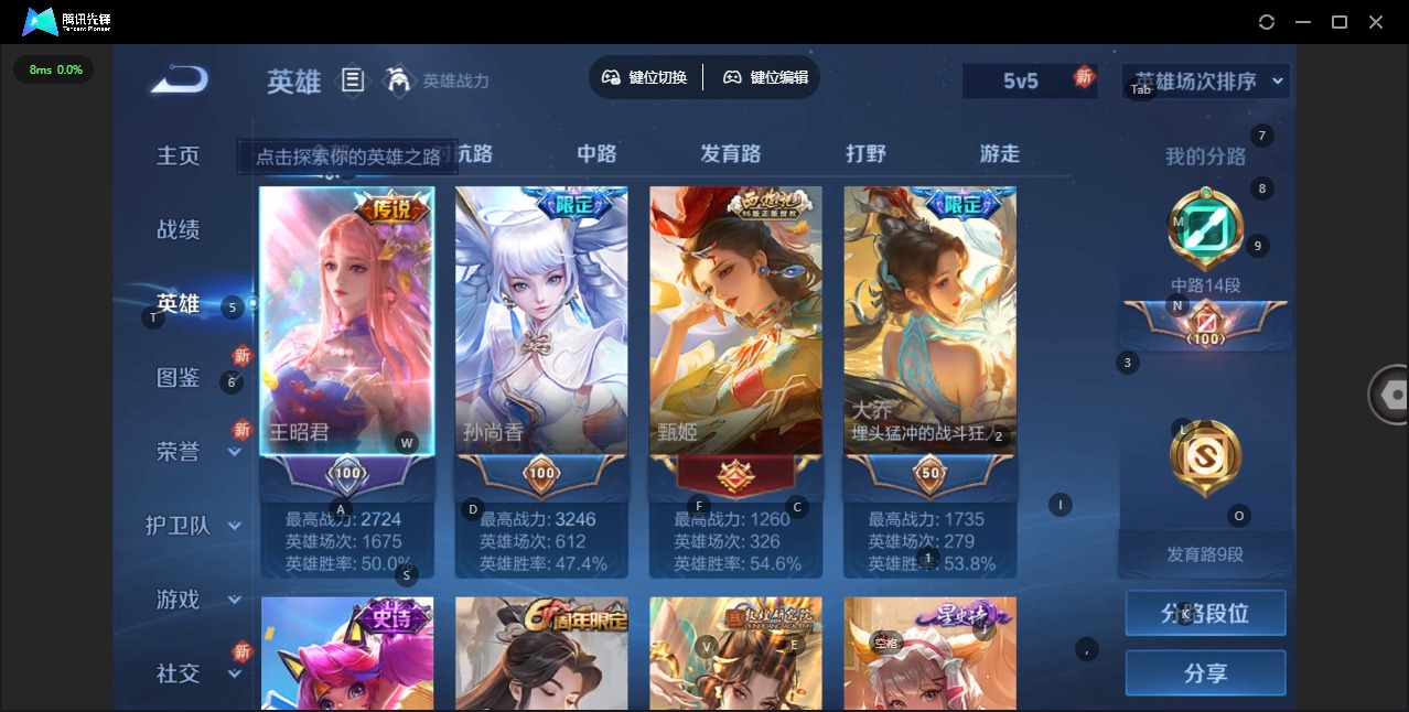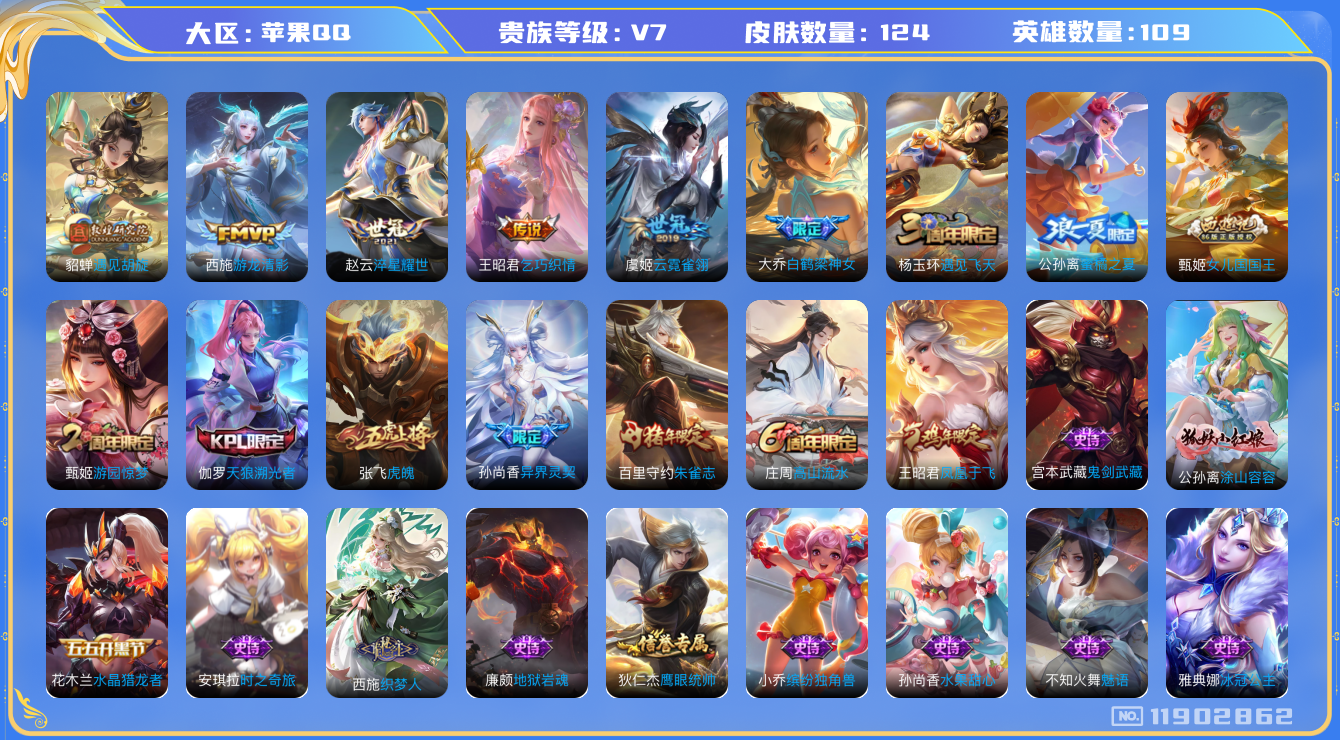 - PX_2071646-贵族等级: V7 英雄数: 124 皮肤数: 219 无双皮: 碎月剑心,器灵·螭龙剑 传说皮: 黄金射手座,云鹰飞将,末日机甲-孙尚香,地狱火,音你心动-周瑜,游龙清影,电玩·雷克斯,霜月吟,澜逐花归海,乘龙·淬吴钩 限定皮: 李小龙,梁祝,神威,凤求凰,孙行者,五谷丰年,怒海麟威,夏侯惇霜北刀,鸣野蒿,愿照·岁时盈
