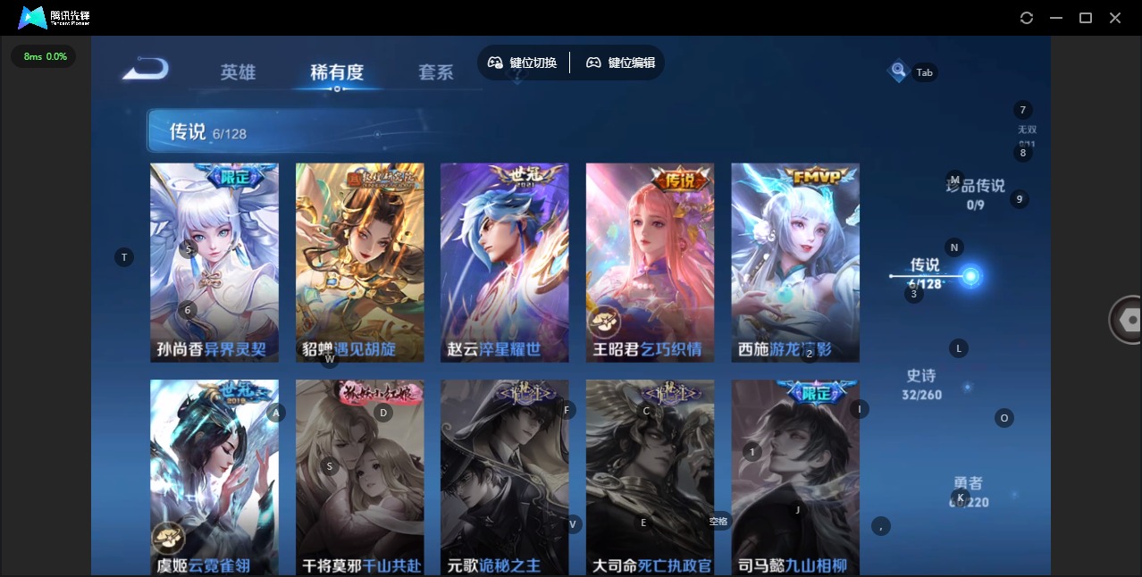 - [11445748]V6 1典藏 3传说 123英雄 189皮肤 可修改实名 优质装备:幻阙歌(貂蝉典藏),牧神诗旅 珍宝阁皮:蔷薇恋人 限定皮:映山客,陌上桑,鸣野蒿,魔法小厨娘,李小龙,孙行者 史诗皮:龙之律动,破空之剑,战舞者,涂山红红,东方月初,蒙犽顽岩魄,芈月浮光幕影,谪仙醉月,蔬乡物语(鲁班七号),百相守梦-百里守约,紫霞仙子,江河有灵,百解令(蒙犽),暗夜猫娘,青蛇,猫狗日记-孙策,乱世虎臣,节奏热浪,女仆咖啡,摇滚巨星,水果甜心,绅士熊喵,心灵骇客,德古拉伯爵,鬼剑武藏,心灵战警,舞动绿茵,地狱岩魂,纤云弄巧,拒霜思,缤纷独角兽,逐浪之夏,月团寄思,水晶猎龙者,金属风暴,鹰眼统帅,暗夜贵公子,魅力维加斯,未来纪元-赵云