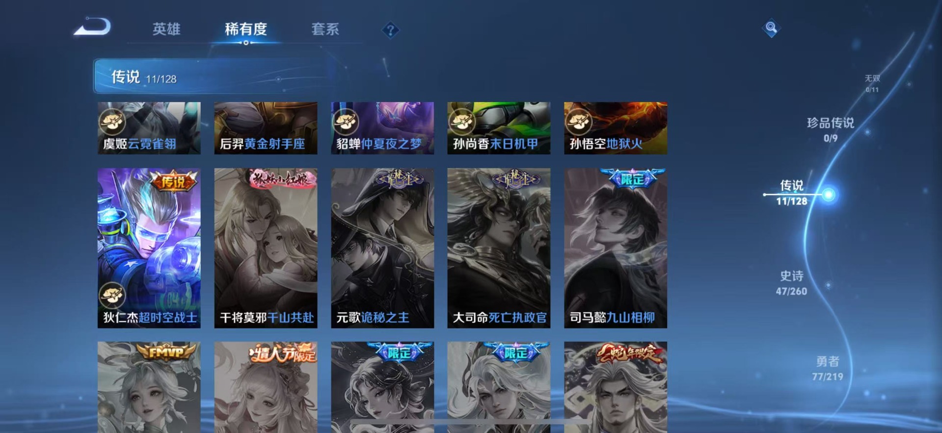 - [12083510]V7 1典藏 9传说 124英雄 238皮肤 可修改实名 优质装备:弑枪猎影(韩信典藏),黄金射手座,炽阳神光,末日机甲-孙尚香(绿蚂蚱),地狱火,超时空战士-狄仁杰 珍宝阁皮:蔷薇恋人 限定皮:鸣野蒿,至尊宝,白虎志(电光耗子),凤求凰(白切鸡),前尘镜,遇见飞天,高山流水,游园惊梦,梁祝,天狼狩猎者,天狼绘梦者,李小龙,孙行者,猪悟能 史诗皮:百相守梦-黄忠,特工魅影,千年之狐,冰冠公主,偶像歌手,末日机甲-吕布,猫狗日记-孙策,猫狗日记-大乔,乱世虎臣,修罗,女仆咖啡,摇滚巨星,水果甜心,时之奇旅-安琪拉,德古拉伯爵,暗隐猎兽者,鬼剑武藏,心灵战警,舞动绿茵,地狱岩魂,纤云弄巧,繁星吟游(呼啦呼啦),逐浪之夏,水晶猎龙者,曙光守护者,箭羽风息,金属风暴,原初追逐者,圣诞恋歌,鹰眼统帅,魅力维加斯,黎明之约,赏金猎手,奇遇舞章